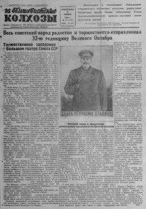 П р о л е т а р и и всех с т р а н , с о е д и н я й т е с ь! заШ те&истснЬе КОЛХОЗЫ О р г а н С е в е р н о г о Р К В К П ( б ) и р а й с о в е т а д е п у т а т о в т р у д я щ и х с я Н о в о с и б и р с к о й о б л а с т и Колхо зники ВОСКРЕСЕНЬЕ 13 НОЯБРЯ 1949 г . № 9-1 ( 1 1 8 2 ) Цена 1 5 к о я и колх о зн ицы ! Умножайте общественное богатство к о л х о з о в , у к р е п л я й т е дисциплину т р у д а ! Свято соблю дайт е Устав сельскохозяйственной а р т е л и—основной з а к о н к о л х о з н о й жизни! (Из призывов ЦК ВКП(б) к 32-й годовщине Великой Ок т я брь с кой социалистической революции) Весь советский народ радостн о и торжественно отпраздновал 32-ю годовщину Великого Октября Торжественное заседание г Большом театре Союза ССР В к а н у н О ктября Москва оделась в я р к и й п р а з д н и ч н ы й Наряд. # Вели чаво— то ржествен Б о л ь шой т е а т р , над фронтоном к о торого развеваются знамена ' 16 с о ю з н ы х р е сп ублик , Здесь, по ус тановившейся традиции, вечером 6 ноября собрались для встречи п р а зд н и к а л у чш и е люди сто л иц ы— п р о славленные стахановцы и у ч е н ы е , Герои Социалистического Тр уда , и н ж е н е р ы и деятели р и с к у с с т в , ветераны революционн ы х битв, градостроители и воины доблестной Советской А р и е й . 7 часов вечера. В пр е зи ди уме п о я в л яю т с я тт . В .М . Молот о к , Г. М. М ал ен ков , Л : П . Бер и я , К . Е . Ворошилов , Н . А. Б у л г а н и н , Л .М . К а г анов ич , А .А . Андреев, Н . М'. Ш в е р н и к , А . Н. К о с ы г и н , М. А. Суслов, П . К, Пономаренко , Г . М. П о пов, М. Ф. Ш к и р я т о в , члены правительства, д е п у т а т ы М ос к о в с к о г о Совета. * Собравшиеся продолжитель н ы м и аплодисментами в стречают руководителей партии и п р а вител ьства . Под б у р н у ю овац и ю и зб и рае тс я по четный През и д и у м - П о л и т б ю р о Ц К В К П ( б ) во главе с то варищ ем И. В. С та линым . Слово для доклада предоставляется товарищу Г. М. М а л е н к о в у , тепло в стре ч ен ном у у ч а с т н и к а м и заседания. — Сегодня народы Советского Союза и н а ш и д р у з ь я за рубеж о м п р а з д н у ю т 3 2 - ю г о д о в щ и н у Великой О к т я б р ь с ко й с о ц и а л и с т и ч е с к о й рев олюци и , г о в о р и т тов. М ал ен ков , н а ч и н а я доклад. Советский народ с за к о н н о й гордостью смотрит на р е з у л ь та т ы своей борьбы и р а б о ты . Время, в которое мы ж и вем, войдет в и сторию нашей Р о д и ны , к а к в еликая с т а л и н с к а я э п о х а . а 3 2 - ю год о вщ и н у О к т я б р я с о в е т с к и й народ свстречает з н а ч и тельными у с п е х а м и во всех обл а с т я х соци а л и с т и ч е с ко г о н а родн о го х о з я й с т в а и к у л ь т у р ы . Довоенный уровень народного хо з я й с т в а не т о л ь к о д о с т и г н у т , но и превзойден Мы имеем все о с н о в а н и я с ч и т а т ь , что пе р ва я послевоенная п я т и л е т к а будет в ы п о л н е н а досрочно. Тов. М ален ков гово р и т , что н а ш а промышленност ь и наше сельское х о з я й с т в о в с т у п и л и в полосу н о во г о мощного подъема. Это создает новые возм ожности для дальнейше го п о вы ш е н и я материального и к у л ь т у р н о г о у р о в н я ж и з н и советского народа. Д о к л а д ч и к х а р а к т е р и з у е т далее з н а ч и т е л ь ны е у с п е х и , д о - ♦ е т и г н у т ы е в области н а у к и , к у л ь - т у р ы и и с к у с с т в а , п о д ч е р ки в а я , что с о в е т с к а я п а у к а н а прав л е на на с л у ж б у делу мира и п р о ц в е т а н и я наш ей Родины. Если атомная э н е р г и я в р у к а х и м п е ри алистов яв ля е тся и с т о ч н и к о м производства смерто носных о р у дий,средством з