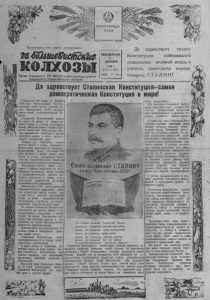 ЗА Б О Л ЬШ Е В И С Т С К И Е КОЛХОЗЫ 5 „акабря 1940 года № 100 (1188) С т а т ь я 118 Радостно жить, работать иучиться под солнецм СталинскойКонституции & --------------------- -— -----------*— ■ * * — ---------------------- -------------------------------- ~ * | Цифры Граждане С С С Р имеют право на труд Тру д у ч и т е л я в нашей с т р а не ценится и считается почетн ы м . Советский народ окружил у ч и т е л я любовью и заботой. П а р т и я и правительство доверили у ч и т е л ю большое, всенародное д е л о— воспитание подрастающего поколения в духе преданности великому делу Ленина- Сталина. У ч а детей, мы к то же время у ч и м с я и сами. Н е учи ться теперь нельзя. Ж и з н ь и н а у к а идут быстро вперед и не у ч и т ь с я — з н а ч и т отстать от жизни. Повседневно за ботясь о п о в ы ш е н и и своего образования и идейного уровня, мы ,тем самым, улучшаем качество преподаван и я в школе, достигаем лучшей успеваемости у чащ и х ся ,с т ар а ем ся обеспечить наименьшее ко личество второгодников. П а отеческую заботу товари ща Сталина о нас, работниках народного образования, мы о т ветим лучшей подготовкой к урокам, воспитанию хороших навыков и новегения у ч е н и ков и вырастим образованны е и культурных строителей светлого коммунистического будущего. М. ШАДРИНА. Ж е н щ и н е в С С С Р представляются равные права с мужчиной во всех о б л а с т я х х о з я й ст в е н н о й, государственной и общественно- политической жизни С т а т ь я 122. Л, простая колхозн ица, сельхозартели им. Тельмана н и к о гд а не могла думать о таком праве, к а к о е дала мне Сталинская К о н с т и т у ц и я . Честно работая в колхозе р я довой колхозн ицей, я заслужила уваж ение и доверие своих к о л хозников и они меня выбрали депутатом в сельский Совет. Свои обязанности деп у та т а— с л у г и народа— я с честью в ы полняю. Я горж ус ь тем, что иногда я , простая колхозница, б ы в а ю полезна и оказываю носильную помощь исполкому сельского Совета. Среди своих колхозников я веду разъясни тельную работу о задачах, поставленных перед колхозами и иризываю всех к честному выполнению своих обязанностей для быстрого, полного расцвета нашей колхозной ж и зни под солнцем Сталинской Конституции. Д. ЮДИНА, член сельхозартели им. Тельмана, д е п у т а т Северного сельсовета. V и факты учителей Северного райоI И.В.Сталин делает доклад о проекте Конституции СССР на Чрезвычайном VII! Всесоюзном съезде Советов (1936 г.) Граждане С С С Р имеют С т а т ь я 121. право на образование Мы, у ч а щ и е с я Северной средней ш колы , горячо благодарим великого Сталина за заботу о нас, советских детях, о нашем образовании и воспитании. В школе мы получаем к а ж дый день новые з н а н и я . Н аш и учителя стараются доходчиво преподать нам учебный материал н сделать нас образованными, развитыми людьми. Не жалея сил и времени, учителя организовали для от с та ющих учеников дополнительные занятия, чтобы обеспечить у с п е ваемость всех у ч а щ и х с я наш и х классов. М ы обещаем хорошо учиться, закончить ш к о л у с хорошей аттестацией и но окончании школы пойти работать на ж е лезнодорожный транспорт. Ста ли н ск а я Ко н ст и т уц и я обеспечивает всем право на образование, труд и отдых. Мы , ю н ы е пионеры, долж н ы я обязательно осуществим эги права после ок онча ния на- I шей любимой шкоды. А. КРУПНИЦКИЙ, н . п ь я н - КОЗ, Ю. ПРОКОФЬЕВ и В НИКОЛАЕНКО. на за дооросовестш.П труд н долголетнюю безупречную работу награждены орденам