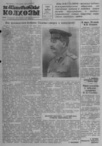 Пролетарии всех стран, соединяйтесь! заШтх&ис/пскке КОЛХОЗЫ О р г а н С е в е р н о г о Р К В К П ( б ) и р а й с о в е т а д е п у т а т о в ___ т р у д я щ и х с я Н о в о с и б и р с к о й о б л а с т и _____ _ Идеи И < В .С Т А Л И Н А —великого зодчего коммунистического общества, его отеческая забота о каждом новом рост ке коммунизма, о л ю д я х— ст р о ит е л я х нового общества окрыля ю т совет ских лю дей . С Р Е Д А 21 Д Е К А Б Р Я 194 9 г . « 1 0 3 ( 1 1 9 1 ) Цена 15 к о т . Под руководством великого Сталина—вперед к коммунизму! Сегодня, 21 декабря 1 91 9 го да, Иосифу Виссарионовичу Сталину исполняется 70 лет. Со всех концов страны социализма со всех концов мира летят с е годня в Москву, в -Кремль слова го р яч и х приветствий н поздравлении мудром у вождю и учителю т рудящихся. Сталин вобрал к себя всю мудрость народа, его храбрость и мужество, его стойкость и -свободолюбие. Вместе с Лениным он в конце прошлого века начал строить славную партию большевиков. Вместе с Лениным он организовывал, политически просвещал и за ка гял рабочий класс, готовил его к революционным битвам, руководил боями против царизма и капитализма. Под водительством Ленина и Сталина рабочий класс и к р е с т ь я н с к а я беднота совершили В е ликую Октябрьскую социалистическую революцию и установили подлинно народную советскую власть. Л е н и н и Сталин — вожди и строители первого в мире советского социалистического государства. В годы гражданской войны И. В . Сталин — заместитель В. И. Левина по руков од ству Советом Р а б о ч е -К р е ст ь я н ской Обороны — был непосредственным вдохновителем и о р ганизатором с ам ы х славных побед К расной Армии над иностранными интервентами и белогвардейцами. После смерти Владимира Ильича Ленина его выдающийся ученик , достойный преемник и великий продолжатель его дел а — II. В. Сталин высоко поднял и понес дальше знамя партии. На траурном заседании II Всесоюзного с ‘ езда Советов т о варищ Сталин дал от имени партии историческую к ля тв у: держать высоко и хранить в чистоте великое звание члена п а р тии; хр а н и т ь единство нашей партии, к а к зеницу ока; х р а нить и у кр е п л я т ь диктатуру пролетариата; у кр е п л я т ь всеми силами союз рабочих и к р е с т ь я н ; укрепл я ть и р а сш и р я ть союз республик-; ие щадить сил для того, чтобы укрепи ть К р а с ную Армию и Кр асный Флот; укреплять и расширять союз т р у д я щ и х с я всего мира. Эту священную к ля т в у своему у ч и телю и вождю Л е н и н у партия под руководством товарища Сталина выполняла и выпо лняет с честью. Враги социализма— троцкисты, бухаринцы, националисты и другие а г е н ты б у р ж у а з н ы х ра зведок, маскируясь и д в у р у ш н и чая, п ы та л и сь сбить партию б ленинского п у ти , сорвать с т р о ительство социализма, ослабить н а ш у страну и выдать ее империалистическим х ищ н и к а м . В борьбе против э т и х врагов то варищ Сталин отстоял бессмертное ленинское учение. Бла го даря сталинской мудрости и зоркости все эти враги были разоблачены и уничтожены. Т ру дящ ие ся массы еще тесней сплотились в о кр у г партии Ленина — С т а л и н а , в окру г великого вождя и учителя товарища Сталина. Г е н и а л ь н ы й у ченый , то в а рищ Сталин развил м а р к с и с т с к о - л е н и н с к у ю науку, дополнил ее новыми теоретическими отк ры т и я м и , новыми выводами и положениями. Он разработал и претворил в жизнь программу социалистической индустриализации с