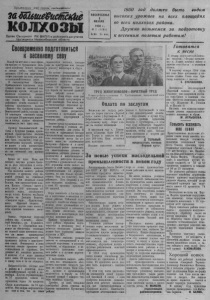 П р о л ет ари и всех с т р а н, соед ин яйт е сь ! ЪйШт&исШНЬе К О Л Х О ЗЫ О р г а н С е в е р н о г о Р К В К П ( б ) и р а й с о в е т а д е п у т а т о в т р у д я щ и х с я Н о в о с и б и р с к о й о б л а с т и ___________ Своевременно подготовиться к весеннему севу Новыйгодвступил в свои права. с О к н о т го ре х б о у з е я т йс о т т ва тру н ж о е в н о и го ков под с ъ е е л м ь а и новых побед, чтобы озна м ны ен м о и ва у т с ь пех 1 а 9 м 5 и 0 н г а од все з х ам у е ч ч а а с т т е к л а ь х сельскохозяйственных работ. В сельхозартели «Киняш» с Н т р а и в б а е л л о ин с с е к м ог я о н н се а льс в о е в с е е т н а ний не с д ев о . д П а р в а ш в е л е е с н я ие п а о р л т о е ж ли е , ние о , бсуди р в еш со и з л о н н е и м е едле с н ем но ян в . зят П ьс о я з к а оман и д з и ы р с о к в а к е р зя а й йо ст н в н а ого пр о е т д д с е е л д а ат с е е л л ь ьског к о олх х о о з а «Киняш» тов. Сапрыгин поехал в Венгеровский район, закупил там 59 центнеров семенного зерна, ц и ы зк и от т о е р п ы е х рь 30 ц к е о н л т х н о е з ров о п бе ш сп ен еч и е н семенами на весь план сева. л б ен о н ты П ы р й и о ме б п р у р д е у д щ б с о е е д л м а ь т ш е у е л р в е о и м ж ст а с е к , о к й п ол р х о о я з з в а а ж к н « е о е К н в и и о н м д б я е ы ш ие ю т тл » т ь я м то и п у в о к . д с о е х С л б в а х я а п о ч р з е ы о н в г д , и о н с к ы т т а о е м т т м о о и ч р д н ы о р о л е г у о количества семенного ла на весенний сев мат я е р р о и в а ы х культур. Время не ждет. Надо, как н с го я е в м о у з р а я с т е д , в е у л з о асу в п чи од в г к о а т ж р ов у од к к и м ава к ко б в л р е х а с о е т з н ь е . Ряд колхозов нашего района получили роший уро в жа п й рош п л а ом с г е од ме у нн х ы ох участках. Они засыпали семян б н о о л м ь . ше К , ол ч х е оз м пр « е Б д о у е с в м и о к тр » ен и о м п ее л т ау себя около 200 менного зерна, цен з т а н сы ер п о а в нно с г е о сверх плана. Колхозы им.Карла Маркса, им. Демьяна Бедного, д « е С е е ц в » е , рная «К з р а а р с я н » ы , й «К н р а а ц с м н е о н г » вар и некоторые другие тоже имеют у р се и б а я л О а д . н и а зл к и о, шки отд се е м л е ьн нн ы о е го ко м л а х т о е з ы района как «Гигант», ный Октябрь», им. м « у 1 н -е а» м н а е я» об и еспе « ч П ен а ы риж Б с у к д а е я н « н К к о р о г а м о с , семенами на полный план весеннего сева, тем не менее председатели названных сельхозартелей не п н р и о и яв с л е я м ю я т н. за И бо м т е ы ющи о ес п я риоб в ре э т т е и х к о о чи л щ хо е з н а н х ым се и ме о н т а х с р о а р н н я я т к с о я в. н Э е т о снижает их посевные качества. В колхозе «1-е мая» имеется всего лишь 10 процентов семян к плану сева и те не очищены. Неблагополучно обстоит дело в с в к е о н х т р о а а з р й я я о й . н с е т П в л е и н у н г с о ы в х о р т о е р м р о е у м н ди о т й н о т м и и ро с и в е н а л ьно 57 процентов; сеялок 45 процентов; борон 54 процента. ц н С е ы б н р т у о я в е . щ п Э е о т дг н и о ц т и т о е ф в м л р е , ы на ч н т е о у н т а еш з 7 а и 0 те п л н р ь а о м и скрываются колхозы, которые еще не приступили как следует к ремонту инвентаря и сбруй. Не лучше показатели и по проведению агромероприятий. По сведениям районного отдела сельского хозяйства вывозка удобрений на поля составляет только 12 процентов. Где же тут борьба за высокий урожай? Золы собрано только . . . 4 центнера. План сбора золы для удобрения полей предусмотрен в 1300 центнеров. Чем иным, как н ко е в б о ес ид п т е ел чн е о й стью кол о х т о д з е о л в ьных мо р ж у н о объяснить такие результаты т п е о х д н го и т ч о е в с 
