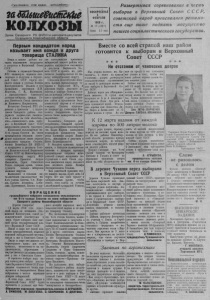 П р о л е т а р и и всех ст р а н , с о ед ин яйт е сь/ заШтеВисййИШ КОЛХОЗЫ О р г а н С е в е р н о г о Р К 8КГ1(б) и р а й с о в е т а д е п у т а т о в _____ т р у д я щ и х с я Н о в о с и б и р с к о й о б л а с т и __________ ВОСКРЕСЕНЬЕ 5 Ф ЕВ РАЛЯ 1950 г. А 10(120 2) Цена 1 5 коп Развертывая соревнование в честь выборов в Верховный Совет С С С Р , советский народ преисполнен р еш им о сти еще выше поднять могущество нашего социалистического государства. Первым кандидатом народ называет имя вождя и дру га товарища СТАЛИНА Вчера в нашем чалось выдвижение в депутаты в Верховн к р ы а а н й й д о и н д е С ат ов о н е в т а ССС Р Р а . бочие и служащие. Северной МТС выдвипули первыми кан- р д б н и и ы м д о й ат го ам Со в и в о е ж в т дя деп С и у С т С у а Р ч т и ы те г в л о я р В я И е ч р о о х с о иф л в ю а Виссарионовича Сталипа и его ближайших соратников В.М. Молотова, Г. М. Маленкова, и прославленного Советского р р л а о е я тч И и С в о к а в а н е - о с т в и с и к б ч о и а г р о я П к С о а о к , ю ры т з р а ш и А к ж и л д н е ы к а. сан Г д е р д щ а е и т р и м К ж л с о а я с л т я л ь е С к с е т в в и п е ы в р ри н дв о С зы и г е о в н в о е у р ты н м р о а х й й он к М к а а Т н т С д р и п у д о о д а б я д т с р о т о в в во—и в о в з з н В я а е л м р и х е о н в н о н а в ы ат й с ь ебя д С е о н о в ь е бя т за в т ы С е б С л о ь С Р завершением ремонтатракторов. Колхозники сельхозартели нм. ($-го съезда Сокетов на своем предвыборном собрании едино- 40 душно выдвинули своим первым кандидатом товарища Сталина, членов Политбюро ЦК ВКЩб) и та кандидатом в депутаты Сове Н а ш и е в а л ь Е С с т е й Верховного Совета СССР по Новосибирскому избирательному округу ¡№23 товарища Еременко Андрея Ивановича, Героя Советского С д о ую ю щ за е , го генера з л а а па а д р н м о и - и, сиб к и о р м ск ан им военным округом. Колхозники и сельская теллигенция сельхозартели и и м н . 6 з к о - и в г н , о , Б с П л ъ о р е х и з и е д м н а , ни С к о А о в г в е р т , ы о Б в з е , к з о г т в и .т , н . и А М л д о р е р ш у о гие выступающие призывают д и е з р б ж ир ат ат ь еле вы й д н в а и ш ну е т г ы о х ра к й а о н н ди а д п а о т д о в в депутаты вета СССР и про В с е и р т х ь овн и о х го д С ат о ь с ш о е г м л С у а б си о и е л зб ь и б ш р а а л и т о м е п л о ти ь л н р и о о т в м и а у ч т е ь с о с к я к и р м п у о г п у о . н д а ъ е бр мо ан м ия пр в ошл Т и ар п т р а е е д с в к ы ой борн Мые ТС, сов з з р я а ай й х с , о н н т а в н а о к м ,в ото о к р т о ы н д х т ле о е р р е аб С с о е в ч л и я ь з е с и к и ,в ог с к о л о у л ж х х о а о щ в ш о и е м в е и с л с ю т о с б д к в и о и н й ак и ов п п о а р р е т д и г а о и н р н яч о и и ст м е и ё ч в у б о в ж о с л т д ь ю товарищу Сталину н ли ов к и а ч н а дид П ат о у к р р у ыш А к л и е н кс а а , н п д о р п д а р д е е И д р с в ж т а а а в п и а т р е К т л и о я л йн л б ы ек ло х т к . и а вы комм С у е н ве и р с н то о в го и бе р с а йпотребсоюза, Северной средней школы,колхозники сельхозартели им. Карла Маркса единодушно п в р о и и д ч щ д а а е , рж Е а к р л а е и н м д е и н д к к а о т а о н м д А и н д в д а р т е д у я е р п у ут И а в т т а о ы н ва о в Совет Национальностей. щ по и д х О ъ с е я м , е б о оль с б ш о о ль к м ш от е о о д м и ры н п е м о н л и и и т п и р ч о е т с х р к о у о д д м я я т п с р т р а у т е п е д л а в ю е ы й б щ о и р г е н ов ы о с е ря м т е с с о м т б . а р т а е С н р в и и о а и я л м ы и п з п б е о и р вым кандидатом народ называет имя великого вождя Иосифа Виссарионовича Сталина. го н К а а ш к ег р о ад н о а ст ро ны да й б п у р д а е з т дн д ик ень в 1 
