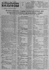 Пролетарии всех стран, саебиняйтесь! мШ бше&ижкке колхозы Орган Северного РК ВКП(б) и райсовета депутатов трудящихся Новосибирской области Ч Е Т В Е Р Г 2 М А Р Т А 1350 г. Л? 1 8 ( 1 2 0 1 0 ) Цена 1 5 ко п . Товарищи избиратели! В день выборов в Верховный Совет СССР 12 марта единодушно гдлосуйт е за кандидатов блока коммунистов и I беспартийных — Александра Ивановича ^ ПОКРЫШКИНА и Андрея Ивановича 1 ЕРЕМЕНКО! >? О новом снижении государственных розничных цен v i на продовольственны е и промышленные т о в а р ы Постановление Совета Министров СССР и, ЦК ВКП(б) В связи с новыми у с п е х ам и в области п ромышл ен ного и се льскохо зяйственного производства в 1 9 19 году , с ростом производительности труда и сниже ни ем себестоимости продукции Советское правительство и Ц е н т ра льны й Комитет М П ( б ) сочли возможным осуществить с 1 марта 1 9 5 0 года новое— третье по счету — с н и ж е ние г ос у д арс тв ен ны х р о з н и ч н ы х цен н а продовольств е н ны е и промышленные товары массового потребления. Совет Министров СССР а Ц К В К П ( б ) с ч и т а ю т , что в р е з у л ь т а т е нового с н и ж е н и я цен в государственной т о р г о в л е население в ы и г р а е т по расчету н а год} не менее 8 0 миллиардов рублей . Кроме т о г о в виду т о г о , что под влиянием сн иже ни я цен в государственной торговле произойдет п риблизи тельно т а к о е ж е с н иже ни е цен па колхозном ры нке и в кооперативной торговле , население п о л у ч и т дополнительный в ы и г р ы ш не менее 3 0 миллиардов рублей. Следовательно, о бщ и й в ы и г р ы ш насе ления от нового с н и ж е н и я цен составит не менее 110 миллиардов ру б лей. Не т сомнения, что в резу льта те нового с н и ж е н и я ц е п : 1) вновь зна чительн о поднимется п о к у п а т е л ь н а я с и ла р у б л я ; 2) еще более у л у ч ш и т с я к у р с с о ве тс ко го рубля по с р ав не нию с курсом и н о с т р а н н ы х в алю т ; 3 ) произойдет дальнейшее серьезное повышенно реальной заработной платы рабочих и с л у ж а щ и х ; 4 ) серьезно у л у ч ш и т с я положение пенсии: зрев ч стипендиатов, п о с к о л ь к у при с н и ж е н и и це н остаются без изменения размеры пенсий и с т и п е н д и й ; 5 ) произойдет дальнейшее серьезное п овыш ение доходов к р е с т ь я н вследствие значительного со кращения к р е с т ь я н с к и х за тра т на п о к у п к у удешевленных п р о м ы ш л е н н ы х товаров и благодаря т о м у , что остаются без изменения заготовительные государс твенные цены н а п р о д у к ты земледелия и животноводства. Совет Министров Союза ССР и Ц е н т р а л ь ны й Ком и тет В К П ( б ) ПОСТАНОВЛЯЮТ: 1. Снизить с 1 марта 1950 года государс тв ен ны е розничные цены на продовольственные и п р о м ы ш л е н ные товары в следующ их ра змерах : Х л еб и б у л о ч н ы е и з д е л и я Хлеб ржаной фозмовой и д р у г и е сорта хлеба из р ж а н о й и пш е ни ч н о й обойной м у к и на 2 5 , 9 проц. Хлеб из пш е ни ч н о й сортовий м у к и на 3 0 , 0 проц. , Б у л к и , баран ки , с у ш к и , с ух ари и д р у г и е булочные изделия из пш е ни чной сортовой м у к и на 3 0 , 0 проц. Д р о ж ж и на 2 0 , 0 п роц . М у к а М у к а п ш е н и ч н а я обойная . и ржаная обой- н а я ** на 2 5 , 0 проц. М у к а п ш е н и ч н а я первого и вы сш е г о сортов на 3 0 , 0 п роц . М у к а п ш е н и ч н а я к р у п ч а т к а на 2 1 , 0 проц. П р о ч и е сорта п ш е н и ч н о й м у к и , а т а к ж е к у к у р у з н а я я ч м е н н а я и д р у г а я м у к а • на 2 5 jO проц. К р у п а , рис и бобовые к у л ь т у р ы П ш е н о па 1 4 , 8 проц. К р у п а г р е ч н е в а я , д ру гие к р у п ы , г