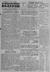 Пролетарии всех стран, соединяйтесь! шШ тевисШ а&е КОЛХОЗЫ О р г а н С е в е р н о г о Р К В К П ( б ) и р а й с о в е т а д е п у т а т о в т р у д я щ и х с я Н о в о с и б и р с к о й о б л а с т и ВОСКРЕСЕНЬЕ 23 ИЮЛЯ 1950 г. X 58 (1250) Цена 15 коп. Товарищи животноводы! Создавайте прочную корм овую б а з у о б щ е с т в е н н о м у ж и в о т н о в о д с т в у . Ускоряйте строительство и ремонт животноводче ских помещений. К дальнейшему подъему ж и в о т н о в о д с т в а в районе вот Р н а о з в в од ит ст и в е а, об э щ т е о с й твен в н а о ж г н о ейш ж е и й о с т к р о а г сл о и хо с з о яй ци с а т л в и а, ст в и с ч е е г с д к а ог с о тоя с л е о ль в центре внимания большевистской с п т а в р а т . ии В и к н ол а х ш о е зног в о рем кр я ест н ь е я л н ь зя п ты р р е Ж е дс и х т в ав ф от и е н р т о ь м в . о с д е с б т е во кол в хоз ко б л е х з оз ч е е — р н и о с ы г т й о очн п б и и о к т г а а е т у т с м т н в н а о а ж , ш е и и н с х и т я оч о т н б р и щ у к д е , я ст щ к в и о е т х н о с я продкутами животноводства и снабжает нашу промышленность сыр В ье п м и . сьме товарищу Сталину т щ р а у н ж и е е н — и д к о и би к т о ь л с х я озов в да н ва ы л н и еш о н бе е м д г л о о у д к в у ь т я и з вн н с а к о ч о с и т т т ь а е , , ль п со н о з о в д г ы а о с в ить р д о л с я е т г а о п э п т о р г о о г о о прочную кормвоую базу. Ряд х к н о о и з л е н х , о зо д о г ан о в н в о ы е к п р о в л е о с н ж т и ь д л ю я и нс и с тв в д о а е ру о г И у б . ещ ко а л В . г С о та д л и и я н и у м и ею к т кон в ц ы у хо п д ерво п г о о го п л о о л в у ь я х м д о я о з л м е о — д и н м 7 я . 2 к , а Во н р а п о о ш 1 и 0 л 0 о ов вц а м : а а м т п о о к 10 в л 8 о , к ш ол а п о свиньям 630; в колхозе«Новый л п м у о а в т т ь ь о » я к— м п о 7 о л 5 о , л д о н п ш я о к а а д к я с р о м у с п т в а н ы в о и м х л о у д на р п 1 о о 0 г г 0 а о - 1 тому скоту—53, по овцам—86 к и хо и з п е а о р ж с т е в е , и л н п ь ь о и я к м м а . — за К т 9 е 2 а л 0 р и . ла им П е М о е ч т а т р и к с , е са л т ь а и ряд других. ю л т ее К в у о с л е с х п о е в з ш о ы з н м о о н г ж о а н ш о е р с го т а и зв р и д а т л й и я он я е а жще и и в б м о о е т н хо о з в о о в дств т а а . кое В р м а о с щ п н о о р е жяен с и р и ед к с о т л во д т ц р л и я а я кт у а в ц ел п и и у я ч н м е к н о т л о ия о в ди с я т к а и а д с , а ку , о с к р с а г т к а в н е и к н о з о н н а г о осеменения животных, случка ж во и д в и о т т е н л ы я х ми с , пл к е о м т е ор нн ы ы х ми го п с р уд о а и р з - ство выделяет ряду колхозов для улучшения пород общественного с ш к а о ю т щ а. им Но у с сл ам ов ы ие м м важ д н а ы ль м ней и ше р г е о о п н о е д я ъ в е л м яе а т ж с и я вот со н з о д в а о н д и с е тва ко в рмо р в а о й й б ко а м зы К с , с ы о о т б ж у е ю а с л п е е з н ч и и и м в ю о а , ю вк в щ у р ей я с д к е о с ту ко и . л з х б о ы зо тв района повторяются одни и те с п ж т о в е л е н н о и н в ш ы и к й бк к п и о л н и а ц з н у Г р о а д г з а о в д и а в ти г я о г д о ж . с и у в д В о а т ы р х н о о й водс п тв о а дго о т н о и вк , и ио и при п ч р ин ов е ед п е л н о и я зимнегосодержания животных, д б ч е е о н н п н н у о а кс я а м ю о н т а ло б д к о н о л я ь м к п ш а л о . е й к Р т а о б о в о т а т х н а о и , д е , за ф т о е р р с а о м в н цу ы в г й е о с д р е а е нн зу е д л а - ь е л т е т а т т н н . и е й удо п в е л р е и т о в д о , р к ит к ел о ь н с т н о е ор р м ь Г м , л е а з а л ч н в ь т о н н о о а о г я о о т т н д п я о е р в л с л и ь ят н е ч н с ы я ин и е а я к к т о с а л о к х с с о о т г о з о о з ы и д т ан н и н е ю е в прочной кормовой базы и лению скотных дворов. Подобную ошибку допускают утепи ман в а, это « м Кр 