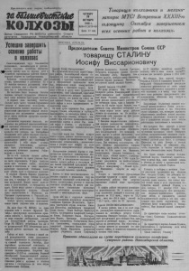 Пролетарии всех стран, соединяйтесь! шИшиеШ/мяШ КОЛХОЗЫ О р г а н С е в е р н о г о Р К В К П ( б ) и р а й о н н о г о С о в е т а д е п у т а т о в т р у д я щ и х с я Н о в о с и б и р с к о й о б л а с т и Ч Е Т В Е Р Г 2 6 О К ТЯ Б Р Я 1 8 5 0 г . . ^ 8 6 - 8 7 ( 1 2 7 9 - 8 0 Ц е н а 3 0 к о п . Товарищи колхозники и м е ха н ит заторы М Т С ! В ст р ет им X X X I I Т ю годовщину О к т я бр я за верш ением в с е х осенних работ в к о л х о з а х. Успешнзоавешриьт осенние работы в колхозах С а м оотверженны й т р у д большинства к о л х о з н и к о в , ме ханиза торов и с п е ц и а листов сельского х о з я й с т в а обеспечил ■ ^ н а ш е м у рай он у одно из первых мест в ' ^ ’ областном соревновании районов Новоси бирс кой области по хлебоз аго товкам . Р а й о н н а я сел ь с к о х о з яй с тв е н н а я вы с т а в к а , проведенная в р а й ц е н т р е 2 1 и 2 2 о к т я б р я п о к а з а л а д о с т и ж е н и я п е р е довых колхозов, к а к в области полеводст ва т а к и животноводства. Н а вы с т ав ке была п о к а з а н а б о г а т а я т е х н и к а , которой го судар ство о б е с п е ч и вает н а ш и м а ш и н н о т р а к т о р н ы е с т а н ц ии . В первы й день в ы с т а в к у посетило больше д в у х тысяч ч е л о в е к .Т р у д я щ и е с я увидели в пав и ль онах полеводства и ж и в о тн о во дс тв а к а к и м и огромными возможностям и р а с п о л а г а е т к а ж д ы й колх оз. Испол ьз уя эти возможности к о л х о з н и к и м о гу т иметь изобилие п род у ктов сельского х о зя й с тв а . Д о с т и ж е н и я передовых колхозо в, п о к а з а н ны е н а районной с ел ье ко х о зяй с тв е н - - Ц и ш й в ы с т а в к е обязывают остальные к о л хозы р а й он а мобилизовать свои силы, привлечь все резервы н а бы стр ейш ее з а в е рш е н и е всех работ т е к у щ е г о сел ьс ко х о з я й с т в е н н о г о го д а и н а ч а т ь у п о р н у ю к р о п о тл и в у ю работу по и з у ч е н и ю и п р и м е н е н и ю у себя опыта л у ч ш и х передовых к о л х о зн и к о в , уд о с т о е н н ы х быть у ч а с т н и к а м и выставки и п о л у ч и в ш и х п оч е тны е гр ам о ты Р а й и с полкома и премии. Но н е все колх озы н а ш е г о рай он а а к т и в н о боролись за право у ч а с т и я быть н а слете передовиков. В ряде колхозов плохо идет з а с ы п к а с е м я н , з а г о т о в к а кормов и подгото вка к зиме ж и в о т н о в о д ч е с к и х п о м ещ е н и й . Особенно плохо и д е т у б о р к а ль н а в отдельных к о л х о з а х . В ко л х о зе « П а м а т ь К и ров а » (председа тель т . И в о л и н ) , т а к а я ц е н н а я к у л ь т у р а к а к л е н , с площади 2 0 г е к т а р о в ст ои т е щ е н е у б р а н н о й . Колхоз имее т ль н о -се - м е н а и л ь н о - в о л о к н о , а г о с у д а р с т в у , ее сдает. Плохо ведут рас чет с го судар ством но л ь н о -п род у е ц ии колхозы «Новый п у т ь » (председатель т . Ш а т о х и н ) , им. Т е л ь м а н а ( п р едседатель т. Т е л ь н ы й ) , и м . Молотова (председатель т . Н и и т ю к о в ) . Особую т р е в о г у вызывает срыв выполн е н и я п л а н а подъема зяби в к о л х о з а х . Н а д н я х бюро Р К В К П ( б ) з а срыв в с п а ш к и зяби в колх озе « Кр асны й О к тябрь» пред упредило председателя п р а в л е н и я к о л х о з а т . Б а г р о в а и потребовало от н е г о создания необходимых условий для бесперебойной работы т р а к т о р о в . Бюро Р К В К П ( б ) потребовало т а к ж е и от руководителей М Т С обе с п е ч е н ия д в у х см енной работы тр а к то р о в н а подъеме з я б и . С е й ч а с во вс е х к о л х о з а х с новой с и лой р азв ер ты в ает ся волна с о ц и ал и с т и ч е с к о г о соревнования за достойную в с тр е ч у славной годовщины О к т я б р я . Долг п а р т 