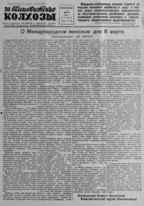П р о л е т а р и и в с е х с т р а н , с о е д и н я й т е с ь ! заШ бш еШ т снке. КОЛХОЗЫ О р г а н С е в е р н о г о Р К В К П ( б ) и р а й о н н о г о С о в е т а д е п у т а т о в т р у д я щ и х с я Н о в о с и б и р с к о й о б л а с т и ВОСКРЕСЕНЬЕ 4 М А Р Т А 1951 г . № 19 ( 1 3 1 6 ) Цееа 1Ь к о п . Женщины-колхозницы активно борются за подъем сельского хозяйства и идут в первых рядах социалистического соревнования за получение высоких устойчивых урожаев , всемерное увеличение поголовья и пр о д у к тивности общественного животноводства. { И з постановления Ц К В К П { 6 ) о международном ж е н с к о м дн е) . О Международном женсном дне 8 марта П о ст ан овл ени е Ц К В К П ( б ) Международный ж е н с к и й день 8 марта тр уд ящ и е с я Советского Союза в стречаю т в этом г о д у в обстановке мощного подъема п оли ти ч ес кой и трудовой а к т и в н о с т и м а с с ,в ы з в а н н о г о новыми победами советс к о г о народа в строительстве к о м м у н и з ма. На выборах в мес тные Советы депута тов т р у д я щ и х с я и в Верховные Совет ы с о ю зн ы х и автономных респ убли к сове т с к и й народ вновь пока зал свое мораль н о -п о л и т и ч е с к о е единство,выра зил е д и н о душное одобрение поли ти ки партии Л е н и н а — Сталина, свою готовность и впредь неустан но к р е п и т ь м о г ущ ес тв о социалистической Родины. £ В ре зульта те самоотверженного труда рабочих , ко л х о з ни ко в и интел ли ге нц и и за годы послевоенной п я т и л е т к и восс танов лено х о зя йс тв о пострадавших от войны районов с т р а ны , значительно превзойден довоенный ур овень р а зв и тия н а р о д н о г о хо зяйства Советского Союза. П р о м ы ш л е н ность, т ранспор т и сельское хо зяйство обильно ос нащены новой современной т е х н и к о й , намного выросла производительность труда . На основе подъема н а родного х о з я й с т в а н е у к л о н н о растет н а циональный доход СССР, у л у ч ш а е т с я материальное благосостояние т р у д я щ и х с я , си стем а ти ч ес ки с н и ж а ю т с я цены на т о вары массового потребления, растет п о к у п а т е л ь н а я способность населения. У с п еш но ра зви вает ся советс кая с о ц и а л и с т и ч е с ка я к у л ь т у р а . У с п е х и х о з я й с т в е н н о г о и к у л ь т у р н о г о строительства в нашей стране, последо- нательная м и рн ая п о л и т и к а СССР — п о л и т и к а борьбы за мир и сотр удничество народов, еще более повысили междуна родиый авторитет Советско го Союза. В д ос тижении успехов к о м м у н и с т и ч е с к о г о строительства большая роль п р и н адлежит советс ким ж е н щ и н а м . Во всех Областях государс тв ен н ой , х о зя й с т в е н н о й и к у л ь т у р н о й ж и з н и ж е н щ и н ы п р и н и м а ю т а к т и вв о е у ч а сти е . Больш евистс кая п а р т и я обеспечила для ж е н щ и н н аш ей с тра ны н е о г р а н и ч е н н ы е возможности ра з в и ти я и х т в о р ч е с к и х способностей и п о д няла советс кую ж е н щ и н у н а недосягаем у ю для ж е н щ и н к а п и т а л и с т и ч е с к и х с т р а н вы со ту . Вместе со всем советс ким народом ж е н щ и н ы Советско го Союза я в л яю т с я полновластными хо зяевами с в о е г о государс тва, а к т и в н ы м и строителями к о м м у н и з м а . Миллионы с л а в н ы х п а т р и о т о к добросовестно т р у д я т с я на п р е д п р и я т и я х п р о мышленности , н а трансп орте и н овостройк а х , повыш аю т свое мастерство, п р о и з водс твенную к в а л и ф и к а ц и ю , овладевают т е х н и к о й и передовыми методами труда . Свыше 3 8 0 т ы с я ч ж е н щ и н работаю т и н женерами