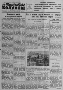 П р о лет ар и и всех стран, соединяйтесь! шШте&исйшие КОЛХОЗЫ Орган С е в е р н о г о P H В К П ( б ) и районно го С о в е т а д е п у т а т о в т р у д я щ и х с я Н о в о с и б и р с к о й о б л а с т и Улучшить уход и содержание скота ВОСКРЕСЕНЬЕ 11 МАРТА 1951 г . & 21 (1318) Цепа 15 коп. Товарищи животноводы! Шире развертывайте п р едм ай с ко е с о ц и алистическое соревнование за образцовое проведение зимовки с ко та в к а ж д о м колхозе! с Четвертый пленум Новоскбир- ского областного коыжтета партии в постановлении требует наряду с подготовкой я проведением весеннего сева успешного завершения зшмовки скота. Зимовка скота должна стоять в центре внимания всех партийных организаций, сельских Советов и правлений колхозов. Пленум областного комитета партии особое внимание обращает па обеспечение скота кормами, правильное и экономное расходование грубых, сочных и концентрированных кормов, расходование их только в соответствии с ежедневными и месячными планами по каждому колхозу. Однако постановление IV пленума обкома ВКИ(б) не во всех колхозах нашего района претворяется в жизнь. Зимовка скота проходит неудовлетворительно. В колхозах им. Тельмана (председатель правления тов. Тельный,«Борьба замир» (председатель правления тов. Мишин) и им.Крупской(председатель правления тов. Блинов)грубые корма израсходованы. Приобретенные корма расходуются небрежно.Ра- Оотвики животноводства не за нимаются подготовкой резки и запаривания её для скармливания. Изыскание кормов проходит неорганизованно. Из-за отсутствия кормов в этих колхозах допущен падеж скота. Не лучше этого и в колхозе им. Молотова (председатель правления тов. Нивтюков). При наличии достаточного запаса' кормов, но в результате варварского отношения к животным, в этом колхозе тоже допущен падеж. Мы не можем ждать миолстейот природы: взять их у нее—анша задача О ча г сельскохозяйственной культуры ( И . М и ч у р и н ) . Наш план агрозоотехнической поппа ганлм Правлениям колхозов, зоовет- специалистами района, своевременно было предложено обеспечить резку и запаривание грубых кормов, скармливание соломы и других гуменных отходов в запаренном виде и сдобренных корнеплодами, силосом,картофелем и концентрированными кормами. Это повысило бы упитанность и продуктивность скота и дало бы большую экономию кормов. Позволило бы скоту до конца зимовки получать разнообразные корма. Но это ука за ние не было выполнено в ряде колхозов. Там, где развитию и росту общественного скота придается серьезное внимание и забота, там сейчас еще имеется достаточно кормов. В течение всей зимы расходование сена,силоса и концентратов проходило в точном соответствии с планом. Правильно проводят зимовку скота колхозники сельхозартели «Вторая пятилетка» и им. Ворошилова. Скот в этих колхозах не снижает упитанности. Скотники и доярки строго соблюдают распорядок кормления и поения. На круглые сутки установлено дежурство работников ферм. Задача состоит в том, чтобы принять решительные меры но наведению должного порядка в стойловом содержании скота. Сохранить в период зимовки весь скот, не допустить снижения его продуктивности— значит успешно выполнить трехлетний плав но животноводству каждым колхозом. Районный отдел сельского хозяйства (заведующий тов. Блохин) и зооветспециалнсты обязаны резко улучшить руководство ходом зимовки