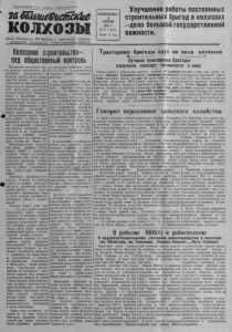 Пролетарии всех стран, соедини ^Ш м ие^иОпснЫ колхозы О р г а н С е в е р н о г о Р К В К П ( б ) и р а й о н н о г о С о в е т а д е п у т а т о в т р у д я щ и х с я Н о в о с и б и р с к о й о б л а с т и ВОСКРЕСЕНЬЕ 8 АПРЕЛЯ 1951 г. № 2 9 ( 1 3 2 6 ) Ц ена 1 5 коп . Улучшение работы по сто янны х строительных бригад в к о л х о з а х « д е л о большой государственной важности. Колхозное строитвльотво— под общественный контроль В ы п о л н е н и е т р е и е т в е г о п л а в а р а зв и ти я общественного пр од у к т и в н о г о животноводства в к о л х о з а х в а ш е г о района н е м ы с лимо без ш и р о ко ра звернутого с т р ои те ль ства ж ивотноводческих ферм и д р у г и х помещений.Кроме т о г о , проведенное у к р у п н е н и е колхозов особо остро выдвинуло вопрос о переселении мелки х деревень в новые, б л а г о у с т р о е н ные к о л х о з н ы е по селки, о строи тельстве общ е с т ве н н ы х и (прои з в о д с т в е н н ы х помещени й в центре у к р у п н е н н ы х колхозов. С е л ь х о ш р т е л и н а ш е г о , С е в е р но го .р а й о н а не имеют права ж а л о в а т ь с я на недоста ток м е с т н ы х с т р о и т е л ь н ы х материалов для типового к ол хозно го стро и те л ь ств а В и х распоряжении н а х о д я т с я огромные л е сны е м а с с и в ы , г л и г а для поделки к и р п и ч а , топливо для о б ж и га его. Необходимо то лько организов а т ь работу, п р о я в и т ь повседн е в н у ю заботу о к о л х о з н ы х с т р о й к а х . У м е л о , п о - х о з я й с к и спл а н и р о в а т ь весь объем работ, по л но стью обеспечить с т р о й к и м атериальной базой, держать весь х о д работы в б о л ь ш е в и с т с к и х р у к а х и дело н а в е р н я к а пойдет. П е р в и ч н ы е п а р т и й н ы е о р г а ни зации колхозов и с е л ь с к и х Со ветов не должны с а м о у с т р а н я т ь с я от руководства х о з я й с т венной работой, в том числе и к о л х о з н о г о строи тельства. Н у ж но умело с о ч ет а т ь п а р т и й н о - п о л и т и ч е с к у ю работу с х о з я й с т венной. Т о в а р и щ С т а л и я у ч и т нас: « . . . тот, к т о д умает в наш ей пр ак т и ч е с к о й работе отделить х о з я й с т в о от п о л и т и к и , у с и л и т ь х о з я й с т в е н н у ю работу пеной не за готови л и потребного к о л и чества леса и к строительству г о т о в я т с я к р а й н е неудовлетвори те л ьно . Вот, пр ав л ен и я колхозов им. Т е л ь м а н а (председатель т. Т е л ь н ы й ) , « К р а с н ы й факел» (тов. Х р у щ е в ) , им. М ак сим а Горько го (тов. П у з ы р е в ' , «Общий труд» ( тов. Л е г а ч е в ) не уделили долж н о го в н и м а н и я плановому с т р о и т е л ь с т в у в к о л х о з а х , не у т в е р дили своевр еменно постоянные стр оите льные бригады. В р е з у л ь та те эти сельхозартели имеют за готовленно го леса всего л иш ь по 2 - 3 процен та к общему п л а ну . Н е у д и в и т е л ь н о и то, что в э т и х колхозах и по сей день ст р о и т е л ь ны е бригады не стали самостоятельными производственн ы м и е диницами. В ор ган и з ации строительства вел ика роль районного отдела сельского х о з я й с т в а и р а й о н ного отдела с е л ь ск о г о и к о л х о з ного строи тельства. Н х щ я м о е дело— пом о г а ть правлениям кол хозов и постоянно кон тролиро в а т ь в сю многообразную работу по с т р о и т е л ь с т в у новых к о л х о з н ы х центр ов;' по оборудованию к у л ь т у р н ы х но л е вы х станов, т р а к т о р н ы х ва гончиков. Однако з аведующ и е э т и х отделов тт. Б л о х и н и М ан сур ов недоста точ н о ру ководят строительством в кол х о з ах . Для то го , чтобы с п р а в и т ь с я с большим объемом строи тель с т в а нео