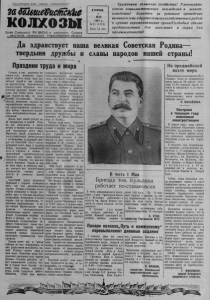Пролетарии всех стран, соединяйтесь! заШ теСитснке К О Л Х О ЗЫ Орган С е в е р н о г о Р К В К П ( б ) и р а й о н н о г о С о в е т а д е п у т а т о в т р у д я щ и х с я Н о в о с и б и р с к о й о б л а с т и Труженики сельского хозяйст ва! Умножайте успехи социалистического з ем л ед ел и я и животноводства! Боритесь з а успешное проведение весеннего сева и д р у г и х сельскохозяйственных р а б от в лучшие агротехнические сроки!Создадим обилие продовольствия д ля населения и сы рья д л я промышленности! ВТОРНИК 1 МАЯ 1951 г . № 35 ( 1332) Цена 15 коп. Д а здравствует наша великая Советская Родина— твердыня дружбы и славы народов нашей страны! Праздник труда и мира В честь 1 Мая Бригада тов. Кульпина работает по-стахановски Сегодня, в это радостное весеннее утро, миллионы трудя- . щихся земного шара, люди различных наций и рас выходят на праздничную первомайскую демонстрацию. Передовое человечество проводит боевой смотр своих сил, смотр рядов актив- ных борцов за мир, за демократию, за социализм. Твердая поступь миллионов, идущих под первомайскими знаменами, —новое предостережение поджигателям войны-американо-английским империалистическим разбойникам. Взоры всех людей доброй воли направлены к нашей Родине, где воплощены в жизнь мечты и чаяния многих поколений трудящихся всего мира. Миллоины людей, угнетаемых и Эксплуатируемых капитализмом с восхищением и надеждой смотрят на Совесткий Союз—несокрушимый оплот мира и дружбы между народами, освещающий путь к счастью и свободе. С величайшей признательностью ф обращают они слова любви к % товарищу Сталину, чье имя является знаменем борцов за мир во всем мире, к великому вождю, которого все прогрессивное человечество считает умом, честью и совестью нашей эпохи. Советский народ встречает Первомай с гордым сознанием того, что под водительством партии Ленина—Сталина он построил социализм и теперь уверенно идет к светлым вершинам коммунизма. Коммунизм в нашей стране—это не перспектива, отдаленная десятилетиями, а наше завтра. Строительство коммунизма — непосредственная практическая задача советских людей. Гигантские стройки на Волге я Днепре, на Дону и в Туркмении, осуществление великого Сталинского плана преобразования природы нашей страны являются важнейшей составной частью сталинской программы строительства коммунизма. Партия зовет нас к новым победам во имя коммунизма, во имя укрепления могущества нашей Родины—оплота мира во всем мире. Советские люди, безгранично преданные делу партии Ленина—Сталина добьются новых выдающихся успехов, чтобы в стране было больше металла, угля, машин, мануфактуры, хлеба, продуктов животноводства, чтобы еще выше поднялось могущество нашего социалистического государства, чтобы еще более быстрыми темпами итти к коммунизму. Растут силы социализма.Вместе с ними свободнои радотсно отпразднуют девь Первого мая трудящиеся стран народной демократии, успешно строящие социализм, великий китайский народ Под непобедимым знаменем Маркса — Энгельса — Ленина —Сталиан строят новую жизнь народы, населяющие гигантскую территорию, прости- рающюся от Южно-Китайского моря до Эльбы. Растут силы мира. Решения Всемирного Совета Миранашли отклик в сердцах многих сотен миллионов простых людей во всех странах земного шара. Величайшим вкладом в дело борьбы за мир явилась беседа товар