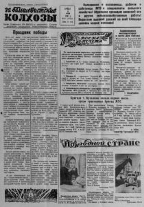 П ролетарии всех ст р а н , соединяйтесь! заШтеВисШЬе колхозы Орган Северного РК ВКП(б) и районного С о ве та депутатов трудящихся Новосибирской области П р а з д н и к победы Шесть лет назад, 9-го мая 1945 года, наша страна под руководством гениального пол-' ководца товарища И.В. Сталина победоносно завершила Великую Отечественную войну и заставила безоговорочно капитулировать германские вооруженные силы. Разбойничьи напав на Советский Союз, гитлеровские захватчики ставили своей целью поработить народы СССР, восстановить на территории нашей Родины власть помещиков и капиталистов. «Дело идет, таким ^образом, — говорил товарищ Сталин, — о жизни и смерти Советского государства, о жизни и смерти народов СССР,отом- быть народам Советского Союза свободными, или впасть в порабощение». Война явилась суровой проверкой всех материальных и духовных сил нашего народа, проверкой прочности и жизнеспособности социалистического государства. Это испытание с честью выдержали советские патриоты, проявившие беспримерный героизм и величайшую самоотверженность в деле защиты свободы и независимости своего любимого Отечества.Победили советский общественный и государственный строй, совет- . ские Вооруженные Силы, мудрая политика большевистской партии. Всемирно-историческая победа над гитлеровской Германией была подготовлена большой созидательной работой, проведенной в нашей стране в предвоенные годы. Под руководством партии Ленина—Сталина трудящиеся СССР успешно выполнили предвоенные пятилетние планы. В результате осуществления сталинской политики индустриализации страны и коллективизации сельского хозяйства СССР превратился в передовую могущественную державу. Заслуги рабочего клаееа, колхозного крестьянства я советской интеллигенции в гоыд войны товарищ Сталин охарактеризовал как беспримерный подвиг в защите своей Родины. Величайшей исторической победы братские народы страны социализма добились благодаря мудрому руководству большевистской партии. «В дни Отечественной войны,— говориттоварищСталин, — партия предстала перед нами, как вдохновитель и организатор всенародной борьбы против фашистских захватчиков. Организаторская работа партии соединила воедино и направила к общей цели все усилия советских людей, подчинив все наши си- лы и средства делу разгрома врага. За время войны партия еще более сроднилась с народом, еще теснее связалась с широкими массами трудящихся». Окончив войну, СССР приступил к мирному социалистическому строительству. В результате успешного выполнения основных задач послевоенпой пятилетки Советская держава стала еще могущественнее. В послевоенные годы социалистическая промышленность значительно превзошла довоенный уровень выпуска валовой продукции. В стране были построены и восстановлены тысячи предприятий. Сельское хозяйство значительно превысила довоенный уровень валового урожая зерновых культур. Выступая в первых рядах могучего движения борцов за мир во всем мире, трудящиеся Советского Союза в обстановке огромного трудового и политического подъема претворяют в жизнь грандиозный Сталинский план преобразования ^природы, сооружают великие стройки коммунизма на Волге, Дону, Днепре, на Украине, в Крыму и Туркмении, На происки американо-английских поджигателей новой войны наш народ от