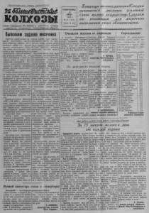 Пролетарии все х стран, соединяйтесь! ыШмиЯистайге колхозы Ор г а н С е в е р н о г о Р К В К П ( б ) и р а й о н н о г о С о в е т а д е п у т а т о в т р у д я щ и х с я Н о в о с и б и р с к о й о б л а с т и Выпонлим заданий месячника ВОСКРЕСЕНЬЕ 13 июня 1351 г . № 4 6 (1 3 4 3) Цепа 15 к о п . Товарищи молокосдат чи ки /С е го дн я начинается месячник усиленной сдачи молока г о с у д а р ст в у. С д е л а е м его решающим д л я досрочного выполнения своих о б я з а т е л ь с т в. Советс кий н а р о д ,у с п еш н о в ы полнив п осле всепную с т а л и н с к у ю п я т и л е т к у , одержал истор и ч е с к у ю победу ва фронте мирного созидательного труд а . Эта победа имеет большое з н а чение и я р к о свидетельствует о превосходстве советской системы над ка п и та л и с т и ч е с к о й . За эти годы восстановлено и вновь . п о строено свыше 6 т ы с я ч п р о м ы ш л е н н ы х п р ед пр и яти и . Полн ос тью восстановлены п р о м ы ш ленность и сельское хо зяйство районов .временно п о д в е р г а в ш и х ся о к к у п а ц и и . У с п е х и послевоенной п я ти л е т к и вдохновляют с ове тс ких людей на новые трудовые п о д в и г и , на претворение в ж и з н ь величественной программы к о м м у н и с т и ческо го строительства. С к а ж дым днем ж и з н ь миллионов сов е т с к и х людей ст ановится все более к у л ь т у р н о й и з а ж и т о ч н о й . Но с о в е т с ки е люди не п р и в ы к л и довольствоваться д о с ти г н у ты м, они н е п рер ы в но д в и ж у т с я в п е ред я р к а м и ра йона стоит задача— повсеместно перейти на т р е х к р а т н у ю д о й к у , усилить раздой к о р о в , обратив особое в н им а ни е на более молочных, добиваясь наибольшего процента ж и р а в молоке. Серьезные задачи стоят перед работн ика м и маслодельной п р о мыш лен н ости , перед р а б о т н и к а ми министерства за г о т о в о к . За последнее время ор ганы м и н и с терства заготовок ослабили р а боту и допус ти ли с н и ж е н и е н а логовой д и сц ип ли ны . В р е з у л ь тате э т о г о к о л х о з ы , «Красный О ктябрь» , «Новая ж и з н ь » , им. К а л и н и н а , им. Тельмана, « У к ра и н е ц » , допус тили ра збазари вание молока в н у т р и колхозов. В июне и июле заготовители должны ра б о т а т ь н а п р я ж е н н о и общими силами добиться у с п е х а в выполнении условий месяч н и к а . Секретари п е р в и ч н ы х п а р т и й н ы х и ко м с о м о л ь с ки х о р г а н и з а ц и й , председатели с е л ь с к и х Советов и колхозов, директора О ч и щ а е м п о с е в ы от с о р н я к о в В к о л х о з а х Нрибелинского сельсовета началась прополка посевов. Кол х о з н и ки первой и второй бригад колх оза им. М а лен кова , всего 43 человека, вышли на п роп о л ку пш е н и ц ы и за первый день пропололи семь [ ектаров. В колхозе « П у т ь к социализму» в первый день выш ли на п р о п о л к у 2 3 человека. П р о п о лоли п я т ь г е к т а р о в овса. Б р и га д и р Николай Плпхметов провел беседу с к о л х о з н и к а м и , ра зъ яснил им огромное з начение своевременного ухода за посевами. Число у ч а с т в у ю щ и х б про полке с каждым дпем у в е л и ч и вается за счет участия подростков и преста релых к о л х о з н и к о в . В. ПЕ РЦ ЕВ , с е к р е т а р ь П р и б е л и н с к о г о с е л ь с о в е т а . Соревнование к олхозов по выполнению годового п л а н а сдачи м о л о к а г о с у д а р ст в у по с о стоянию на 1 июня 1951 года (в проц ентах к г о д о вому п л а н у ) . Не затягивать подъем паров ----- г П р и н я т ы й Советом Министров маслозаводов должны развер СССР и Ц К В К П ( б ) т р е х л е т и й 1 план ра звития общест