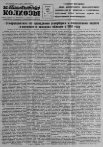 П р о л е т а р и и всех стр а н , с о е д и н я й т е с ь ! ыШтеЯитснЬе К О Л ХО ЗЫ Орган С е в е рн о го Р К В К П ( б ) и районного С о в е т а депутатов трудящихся Новосибирской области Товарищи бригадиры! Шире развертывайте социалистическое соревнование за досрочное и качественное выполнение плана заготовок кормов для общественного животноводства. ЧЕТВЕРГ 14 ИЮНЯ 1951 г. $ 47 ( .1 344) Цева 15 к о п . О мероприятиях по проведению сеноуборки и силосования кормов в к о л хо за х и со в хозах области в 1951 году Р еш ен и е № 495 И с п о л н и т е л ь н о г о к о м ит ет а Но в о сиб ир ск о го о б л а с т н о г о Совета д е п у т а т о в т р у д я щ и х с я от 6 и ю н я 1951 года. Исаолком областного Совета отмечает, что во м н о г и х ко л х о з а х и совхозах об ласти производство кормов резко отстает о т роста общественного ж и в о тн о во д с т ва , что приводит к не доко рму с к о т а , с н и ж е н и ю его п р од у ктив но с ти и зн а ч и т е л ь ны м потерям от падежа. Многие к о л х о з ы и совхозы Б а р а б и н с к о - г о , ^ д в и н с к о г о , К а р г а т с к о г о , К олыв ан - с к о г о . К о ч е н е в с к о г о К у й б ы ш е в с к о г о , У б н н - с к о г о , Т а тар с ко го и д р у г и х районов при неполной обеспеченности общественного поголовья с к о т а г р у б ы м и , кормами из г о да в год не в ы п о л н я ю т планы с е н о к о ш е н и я , в то время к о г д а большие площади сен о к о с н ы х у г о д и й остаются не с к о ш е н н ы м и . Нод предлогом недостаточности травостоя, с е н о ко ш е н и е н а ч и н а ю т с за по зданием , с ро ки сеноуборочны х работ ра с т я г и в а ю т , д о п у с ка ю т " разрыв между косовицей и сто гованием сена. Е ж е год н о н е в ы п о л н яю т с я планы с и лосования ко р м о в и грубо на р уш а е т с я т е х н и к а з а кл а д ки силоса. Силос з а к л а дывается в плохо подготовленные , необ- лицованвые ямы и тр а н ш е и , без достат о ч н о г о у п л о т н е н и я , в нерезанном виде и плохо у к р ы в а ю т с я . З а г р у з к а силосной массы в ямы и тр аншеи и з - з а плохой ор г а н и за ц и и подвоза з а т я г и в а е т с я , что пр иводит к большим потерям и с н и ж е нию к а ч е с т в а силоса. Н е в ы п о л н яю т с я планы сева к о р м о в ы х к у л ь т у р , в виду пл охого ухода за ним и , они дают низкие у рож аи . К р а й н е неудовлетворительно работают по производству кормов м а ш и н н о - т р а к торные и л у гом елиора ти вны е с та нци и . М н о г и е м а ш и н н о - т р а к т о р н ы е с т а н ц и и , особенно Сибирцевская, Г ж а т с к а я , Гор б у н о в с к а я , И ч и н с к а я , Л у г о в а я , М арш ан - с к а я , И т к у л ь с к а я , Ч е р н о в с к а я , К о ч к о в с к а я , П е р в о м а й с ка я , С у р к о в с к а я и Ч ереп анов - с к а я , вступ или в 1 9 5 0 г о д у в сеноуборк у н е под го тов лен ны м и и не обеспечили вы полнение планов т р а к т о р н о г о с е н о к о ш е н и я и си лосования кормов. Директора м н о г и х МТС и совхозов продолжают н е дооценивать з на ч ени е механизации с е н о к о ш е н и я н силосования кормов и недостато чн о м е х а н и з и р у ю т работы по сгребе - н и ю , к о п н ению и с то гов анию сена, по д в о з к е и измельчанию силосной массы. Исп ол комы м н о г и х райсоветов д е п у татов т р у д я щ и х с я не уделяют должно го в н и м а н и я правильной о р г а н и за ц и и работ в ко л х о з а х и с о в х о за х на з а г о т о в к е к о р мов» не о р г а н и з у ю т пр и в л е ч е н и я для в ы п о л н е н и я э ти х работ необходимого количе ст ва тр удо спо собны х к о л х о з н и к о в и р а б о ч и х совхозов и в период сеноу б о р к и и си лосования 