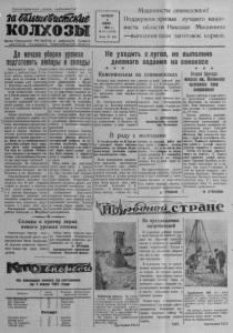 Пр ол ет а р и и всех стран, соединяйтесь! 2аШши^ие^Ш(ие КОЛХОЗЫ О р ган С е в е р н о г о Р К В К П ( б ) и р а й о н н о г о С о в е т а д е п у т а т о в т р у д я щ и х с я Н о в о с и б и р с к о й о б л а с т и До начла уброик урожая подготовить амбары и склады Приближается пора уборки у х н р о и о з е ж а м х ая у р хо а и й да о х н л з а е а , бо н з п а а о г р с о я е т в д о а у м во и с к. п и р В ов з к е а о д г л е о товкой кормов, идет подготовка К уборочной— самой важнейшей сельскохозяйственной кампании. к н и ых С к р у е б д о и м р е к к с е о т м у п р л о е ж к з а с а я н н о и о й м дн а о ет п и о з дг р в о а е т м ж ов о нт складских помещений под зерно новогоурожая, как в колхозах, так и в глубинных пунктах За- готзерно. Однако подготовка складской л ё х м о ен з к о н о в о ст .С и н тр ед о п и р о о т ст е в а л о т д ь о н я ч т ы н с е я оу б д к р е р и л а я г й ю а н т д е ы в к м н о е л и д б м а а р н о и в я и на с р к е л м а о д н о т в ко г л л х у о б з и н н ы о х к. а О м т ^ дельные руководители допускают д п а о , вто ко ре г н да ие и о з ш -з и а бо н к ес п в р о о е ш вр л е о м го енн г о о й ж по к д а гото сд в а к ч и и амб з а е р р о н в а бы г л ос а уд з а а р д с е т р в у. Так было на глубинке Чебаков- скога сельсовета,где заведует тов. Б те ы ,г к д о е в, зв в е П д р у и ю б щ ел а и я нс г к л о у м би с н ел к ь о с й ове.т Александрова. Не своевременно были подготовлены амбарыв таких укрупненных колхозах как им. Калинина и им. Маленкова. Исполнительный комитет рай- о д п я н щ н и о х го ся Со е в щ е е та 18 де м п а у я тато у в тве т р ру д ил с г т р в аф у ик н н ов о ых рем с о кл нт а у дов и в ст к р о о л и х т о ел за ьх с и д и н о с о л п в ж о л н к п ы с о р и м и с а б н т ы е я м т с т к ь о е л г о а п З д а о с л г к н о р и о т е е с з ш е т е ь р п н ю п о и о м я . ещ п С о е о д н г р г и л а о я а й товлеын к 1 июля 1951 года. рект И о с р п а ол З н а я г ю о щ тз и е й рно сб т я . зан М о а с н т у и йл д о и в должен был контролировать ход подготовки складов как на глубииных пунктах, так я в колхозах. л н о и в ем р б а ы йи л сп В о о л б к я о с з в м а я н а зи т. з с ак Ы л а ю р в ч е у и ш Й т - е ь д з м о о е г в щ ов е н о н а р и ы й по с д д л г я п от р о а в в м к л у а е с н с с и о к я в л о м а г и д о ск п и к р х о и л ё п х м о о а ш зе е р н н и а е но в в с о е го е у щ р е ожа н я. е Н в о ып э о т л о не р н е о . Бремя не ждет. Каждый день м пр у иб э л т и а ж пу ает с н ел ас ьск к охо о з т я в й е с т т с в т е в н е н н о н г о о г ч о а д с а ж — е х п л р е и б н о я п т о ь ст р а е в ш к и а т м е . ль Н н а ы д е о м с е е р й ы с к та у т с к т о р в анен в ию подг и о м т е о ю вк щ е и с х к с л я ад н с е к д и о х помещений. Председатели сельских Советов, п га а н р и ти за й ц н и ы и е и об к я о за м н с ы омол о ь б с е к с и п е еч о и р т ь в по ед в е с н ед и н ем евны п й одг к от он ов т к р и оль ск з л а адс п к р о о й ё к ж м а н к х о о . с б З т ы е и т р ь в но с к с о ы н л о п х в а о о н з г о а о х у и р в о н ж а а н г я а л д у е б ж д и н о н о л е место и сохранено от хищений и норчи. Очень важно для получения сухого зерва иметь в каждом к н к о и а л й . хо П з р е и у с б у г о ш а р л и к з л а ч к и у и н и э о т в и о х к го ры с т о ы о е у р р у о ж т ж о е а я будет проходить беспрерывно и о о в б н ой е а с з п д е а о ч п с и о р в т о е ч д к н и о о л е п х е о р в з ы е ам д по г л о н н с а е у ш н д е и а г р е о ств р п о а е м й р . Своевременно подготовить д н ск а о р л с с а у т д ш в с е к и н и л н е к о и й п — ом д в е е а щ л ж о е н н о б и с о т я л и , ь . ш т о о й к П а о , э го з то е су м р у д