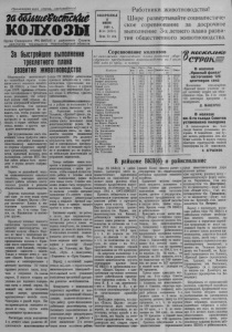 П р о л ет а р и и всех ст ран , со е диняйтесь! заШ бш еРиаШ Ье КОЛХОЗЫ О р г а н С е в е р н о г о Р К В К П ( б ) и р а й о н н о г о С о в е т а д е п у т а т о в т р у д я щ и х с я Н о в о с и б и р с к о й о б л а с т и За быстрейшее выполнение трехлетнего плана развития животноводства О бщ е с тв е н н о е животноводств о — в а ж н е й ш а я отрасль социал и с т и ч е с к о г о сельского х о з я й с т в а . Ц К В К П ( б ) и Совет М и н и стров СССР, п р и н и м а я исто рическое пост ан ов лен и е о т р е хл е т и ем п л а н е , у к а з ы в а л и , что в сем ер ный подъем этой отрасли я в л я е тс я ц е н тр аль н ой з адач е й сельс к о г о х о зя й с тв а . Они призвали к о л х о зн о е крестьянство не п о ж а л е т ь сил, чтобы у с п е ш н о п р е творить в ж и з н ь , н а м е ч е н н у ю п ро г р ам м у и з а к о р о т к и й с ро к создать в с т р а н е изобилие мяса, масла , молока и д р у г и х про - дукт ов животноводства . Для о с у щ е с т в л е н и я этого с т а л и н с к о г о п л а н а тр ебу е тс я повсед невное , неослабное в н и м а н и е к общ ест в ен н ом у животноводству со стороны пе рв и чны х п а р т и й н ы х о р г а н и з а ц и й , с е л ь с к и х Советов, п р а в л е н и й колхозов, всех к о л х о з н и к о в , рабочих М Т С . Особа я забота должна быть п рояв лен а в период л е т н е го с о д е р ж а н и я с к о т а . Борясь з а д ал ь н е й ш и й п одъ ем соц и али ст и ческо го сельско го х о з я й с т в а , некоторые колх озы н а ш е г о р а й о н а добились з н а ч и те ль ны х у с п е х о в в р а зв и ти и о б щ е с т в е н н о го животноводства. Досрочно выпол нили т р е х л е т н и й п л а н по всем видам с к о т а колхозы « П а м я т ь К и р о в а » , « В т о р а я п я т и л е т к а » . Б л и з к и к вы п олне нию т р е х л е т н е г о плана колх озы им . 6 - г о съезда Сове то в , им. Ворошилова и н е к о т о ры е д р у г и е . П р а в ил ьн о п о н и м а я в а ж н о с т ь в ы п ол н е н и я т р е х л е т н е г о пла н а р а з в и т и я ж и в о т н о в о д с т в а к о л х о з н и к и к о л х о з а « П а м я т ь К и р о в а » , во главе с з аведующим ж и вотноводством то в. Иволиным и председателем к о л х о з а т . Ю р к и ным мно го поработали над р е ш е н и е м э той большой , г о с у д а р с т в е н н о й в а ж н о с т и — з адачи . Т о л ь к о в т е ч е н и е июня в к о л хо зе « П а м я т ь Кирова» было з а к у п л е н о и з а к о н т р а к т о в а н о у м е с т н о г о н а с е л е н и я 3 2 головы к р у п н о г о р о гато го с к о т а , п о л у ч е н о и с о х р а н е н о 2 4 головы поросят. В к о л х о з е созданы все у сл ов ия для х о р о ш е г о с о д е р ж а н и я с к о т а в л е т н и й период. Н а к а ж д ы й вид с к о т а построены л е т н и е л а г е р и , о р г а н и з о в а н а к р у г л о с у т о ч н а я пастьба с к о т а , и о д к о р м к а и раздой к о ро в . Б ы к и - п р о и з в о д и т е л и н а х о д я т с я о т дельно от с т ада , с л у ч к а м а т о к производится о р г а н и зо в а н н о . Рассмо трев и т о г и , выполнения 3 - х л е т н е г о пла н а р а з в и т и я о б щ е с т в е н н о г о ж и в о тн о во дс тв а за ию н ь Р К В К П ( б ) и райисполком п р и з н а л и победителем в социали ст ич еском серевновании к о л - х о з « П а м я т ь Кирова» и решили в р у ч и т ь ем у п ер е ходящ ее К р а с ное з н а м я и почетные грамоты р а йис полком а . О д н а к о , о б с т а н о в к а ,с л о ж и в ш а я ся в р а й о н е по выполнению 3 - х л е т н е г о п л а н а , вызывает т р е в о г у . Отдельные колхозы : им. Т е л ь м а н а , « К р а с ны й ф а к ел » , им. М оло т ов а , « У к р а и н е ц » и и м . К а л и н и н а п л о х о пополняют свои ж и в о т н о в о д ч е с к и е фермы. Н е удовлетворительно ведут з а 