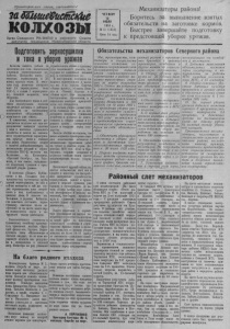 Пролетарии всех стран, соединяйтесь! заШише&иеШкке КОЛХОЗЫ О р г а н С е в е р н о г о Р К В К П ( б ) и р а й о н н о г о С о в е т а д е п у т а т о в т р у д я щ и х с я Н о в о с и б и р с к о й о б л а с т и Подготовить зерносушилки и тока к уборке урожая Колхозы нашего района за последние дна года значительно укрепили зерносушильное хозяйство. Построено вновь 17 типовых зерносушилок и 26 новых крытых токов. В текущем году намечено построить еще 12 зериосушилок типа ПЗС-З, а также 3 зерносушилки, большой мощности, типа Обеднина. Для быстрейшего ввоад в действие зерносушилок колхозы заключили договоры с райпром- комбанатом на изготовление внутреннего оборудования. 7 комплектов уже готова. К сожалению, отдельные руководители колхозов всё еще недооценивают важнотси наличия у себя в колхозах сушильного хозяйства и совсем не занимаются строительством зерносушилок, крытых токов и складов под зерно. Недопустимо медлят с оплатой райпромкомбинату. за изготовление деталей к зерносушилкам ПЗС-З, колхозы им. Калиниина, им. Кагановича, «Красный Октябрь», им. Тель- мава, и тем самым, задерживают подготовку сушилок к предстоящей уборке урожая. В колхозах «Память Куйбышева» и им. Тельмана еще в прошлом году заготовлены срубы зданий зерносушилок, но они и сейчас находятся в той же стадии строительства хотя потребность в них приближается с каждым днем. В колхозе им. Тельмана, в деревне Кобатово. где намечено поставить зерносушилку, ежегодно из-за от сутствия её на месте много зерна подвергается порче и затрудняет темпы хлебосдачи. Безответственно относится к сушильному хозяйству председатель правления колхоза «Красный факел»тов. Хрущев. Зерносушилка типа «Колхозница» в колхозе имелась, но поволе нерадивого хозяина она разрушена и превращена в скотный двор. Несмотря на ряд указаний строительного отдела о производстве надлежащего ремонта, тов. Хрущев не принимает никаких мер к восстановлению её. В запущенном состоянии находятся зерносушилки в колхозах им. 6-го съезад. Советов, «Новая жизнь», «Память Ленина» и «Память Кирова» и в «Новом пути». Они захламлены посторонними предметами, а в отдельных колхозах приспособлены под свинарники. Доначала уборки урожая остаются считание дни, но за исключением немногих сушильные хозяйства в колхозах не подготовлены к уборке урожая и угрожают срыву своевременной сушки и отгрузке зерна государству. Нельзя обойти молчанием, что наши машинно-тракторные станции недостаточно заботятся о механизация трудоёмких работ на сушке и очистке зерна. Директоры МТС т.т. Ятис и Пр-о скурнин, старшие механики и агрономы считают своим долгом механизировать только уборку урожая. Неотложной задачей сейчас является мобилизация всех сил и средств в колхозах на быстрейшее завершение строительства зерносушилок, ремонт и приведение в порядок сушилок, уже бывших в эксплоатации. До начала уборки хлебов надопровести дезинфекцию и побелку помещений, освободить прилегающую к сушилкам площадь' от всякого хлама и произвести огораживание. Задача советских и партийных организаций на местах повседневно осуществлять контроль за ходом рабто по подготовке сушильного хозяйства и строи тельства крытых токов в колхозах помня,что до начала уборки осталось не более 15-17 дней,и от готовности сушильного хозяйства будет зависеть выполнение плана хлебозагото