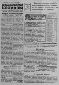 П ролетарии всех стран, соединяйтесь5 шМииевистскЬе колхозы О р г а н С е в е р н о г о Р К В К П ( б ) и р а й о н н о г о С о в е т а д е п у т а т о в т р у д я щ и х с я Н о в о с и б и р с к о й о б л а с т и Выполним государственный план хлебозаготовок к 1 сентября Наш район вступил в период л м е а н с и со я вой те у м б п о о р в ки хл у е р б о ос ж д а а я чи. и ус В и се мысли и стремления тружеников колхозных полей направлены сейчас к тому, как быстрее и без потерь убрать выращенный обильный урожай и досрочно выполнить первую заповедь- р п а о с с ч т П е а е т в р к е а д с м ов . г ы ос е уд к а о р л ст х в оз о ы м р п ай о он хл а е в б о о одушевленные заботой партии, советского правительства и лично товарища Сталина о колхозном крестьянстве, проявляющейся в с о р з н с а я о н т а е й щ л т п ь е е о с н х л т и н н в и и а о с к - т о д к ь й о ю о , л с б х р е о р о з у р ч о т в а н с н о с , ч а к п и е т с 1 е р а б с т в я е ь о н с к о я т л б я а я б с с государством по хлебопоставкам т х е оза С о р е б т г р е о а л д щ и н е я ни м е «К ы к р о а п л с е н х ч о ы а з т й н а и ем к О о к в т в я с б е р г л а ь ь з >\ еп в ср ы о о с х ч т л н у е о п б г и о о в сд ш р а и а ч с х е ч ,в е ы и т н а п и о ц л с и н а и г т в о о с ш р у а д и м а х р и н с а тв 1 д о 0 м о августа государственный план хлебозаготовок на 21 процент. Обращаясь с призывом ко т в в о а се т р м ь ам и к х о н л а х п ш о р е з и г н м о и е к р а у р м , ай ч о л н и е а ны м с е п е х о л а с ь н л х е и о д з з о а артели «Красный 0ктябрь»за два н д за и н с я я ы , , па у в с п и о л с в и л л е и зак т р п е о р м м и п а н ы я Р т о и х д л я и е н б ы о о с б д р 1 а а 8 ч щ 0 и 0 е , пудов добротонго сибирского з г ч е о у р с н е а л к . ь ол с У о х с о в п з ет е ы а ш Б н о о « л П ь в ш а е м д е я - у К т т у ь л х и л К к е и б о р в о о с с в д к а о а » и «Память Ленина». Ежедневно график сдачи зерна государству имиперевыполняется. Нарастают темпы хлебосдачи в колхозах им. Калинина и«Вторая пятилетка». т х я оз б н р П и ь о к » д о д в в ер к к л ж о ю и л ч в х и а о я л з и а с и ь н « и К ц в р и а а у с т б н и о ы в р й у ку к О о к л и хлебосдачу рабочие и служащие райцентра, оказывая помощь к е м о т о л л х у ь о ч ц з а ы а щ м. ая С О с е я в т ер в н з м о р й о о л с о л с д ы р е е ж х д ь н . н е е й о К т ш о с м к т с а о о лы, работая на очистке зерна в колхозе им. Калинина И ня х ю м т ла н д о ш р и м е у т н о а вари 1 щ 5 и 0 , пр т о а ц в к е ы н п т ж о о в е л , . изъявили желание внести свой Все Обращение ко семилет них и н ра ей щ М ен шы и к , е о м л у ы чит с о е е л з л н я ь а х к о о з С м а е р и в т в е е ш р л н и и о сь й «К с с р р о а е б с д ный Октябрь», решили, что наша средняя школа, считывающая боле щихся, может оказать б 5 о 0 л 0 ьш у у ч ю н аа помощь колхозам в уборке и сдаче хлеба государству,поэтому обязуемся: организовать всех учащихся на уборку урожая, и до пачала учебного года под руковдоством учителей, ежедоевно^выходить в в колхоз им. Крупской на тепосильвый вклад в общее дело у к б а орки под и х р л у е к б о о в с о д д а с ч т и в . ом 23 ст у а ч р е ш ни ей п р и а о ли нерв в ожа к т о о л й хоз И е а и в м г . ус К та руп у с б к и о й горох чт участвовали в сборе к з о а л л о и сье п в и . он Хо ер р ы оший Ве п р р х и - м Кр ер ас п п о о к я а р - ской школы, в колхозе «Новый путь», на подработкзе рна. с в т у у К п с и е с л л о и ь ж х а о к л з е с а н д р и а т ю ч е е л , д и о х : л « с е О и б х б а щ п г и о о й р су н т д е р а у п р д р ст и » , им. Максима Горького, «Красный факел» и«Победитель».Очевидно,