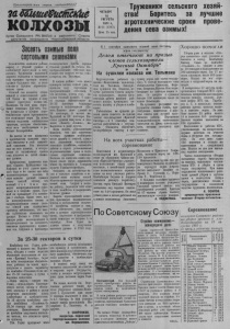 2 ЗА Б О Л Ь Ш Е В И С Т С К И Е КО Л Х О ЗЫ 16 а в г у с т а 1551 г о д а № 65 (1562) П а р т и й н а я ж и з н ь Первейшая обязанность коммуниста применяется механизация по грузки и очистки зерн а . З а гр у зк а машин зерном из б у нк ер а про до лж ает ся в с е г о 2 минуты. Н а снимке : на току с о в х о з а имени П е т р о в с к о г о . Ф о т о П . К а ш к е л я . П р е с с к л и ш е Т А С С З а выполнение взятых обязательств ляе П тс о я лит п и е ч р е в с е к й о ш е ей обр о а б з я о з в а а н н н и о е ст я ь в ю каждого коммуниста. Изучать теорию марксизма—ленинизма значат освещать себе путь в решении любых задач, стоящих п т е о р до ед м к в ом о м в у л н а и д с е т н о и м и . Л т у е ч о ш р и и м ей ме и т т и е и з л у и ч В ьн е я н о в й п и л р е я о м р е ш т аб л с и о я от с м ы т о . р м г и о е и д т у о н д а я ш с е а й м р а о б с п о т а т о р а я ла самостоятельно над изучением ф м и ар и к . си С стс н к а о ч - а л л е а нин у с ч к е о б й ного фи г л о о д с а ов сети партийного просвещения я составила личный план учебы. Наметила определенное время д ч л е я ние изу з ч и е м ни ы я я ря и да зуч р и а л б а от. р В або т т е ы Ф.Энгельса:«Людвиг Фейербах и к ло он со е ф ц и н и е » м и- е « ц А к н о т й и- к Д л ю ас р с и и н че г с » к , р ой або ф т и ы товарища Сталина: «Анархизм или социализм» и «О диалогическом и историческом материализме»; Изучение этих ценнейших работ основоположников марксизКомсомольское собрание кол- х д д о и ы я л а о н « а П « у т х т о л г ь е и бо к у р б а с о б о р о ц т к ы и е ал я п и е х з р л м в е у о б » й ос д д о а е б ч к с е а уМолодежь на собрании в своих выступлениях подвергла б х т р о а о е в р з з о к а н в о , а , й д п о к п л р о у и щ с т т а и и д к в и е ше р е о у к к о о п л в о о о т д р с 1 а т в 0 в у о к х г о л е л е к оставив виновных в этом без наказания. Молодежь указала на плохую организацию труда в бригаде тов. Илихме- т ки ова у . ро В жа н я ап и ря х ж л е е н б н оз ы а е гот д о н во и к убо д р о десяти человек трудоспособных в его бригадеше выходят на работу. мы В х, ко н л о хозе кач п е р с о т х в о о дит ег с о ев оч о е з н и ь низкое. Семена для посева как следует не очищены и не проТруженики колхозной ни охвачены единым нием—как можно рать хлеб с полей б и ыст с р тр е д е е е м р л у е е б в досрочно выполнить первую заповедь к н о ой лхо п з о а— х р л а е с б с о ч п и о т с а т т а ь в с к я ам с . рошую погоду хорошо Р В од и х и д о е т уборка и обмолот, но иногда уборку останавливает ненастье и хлеб осыпается стоя на корню, принося, тем самым, колхозу большие потери. При продолжительном б х н и л а в е ст б а ь ю о е в т . о х с Д л о о е б ж е б д н а и но к и опасе в н етр п ы ерест п о р й н и е земле, солома теряет устойчивость и п со о б т н ер а ь в с ы о п з р р я е м вш ля е т г ь о ся. хл О е п б а а с , н н е о с с п п т о р ь и таких случаях, возрастает с каждым днем. Полегший и спутанный хлеб л т е р г у ш дн и е х е уб х и л р е а б т а ь х . Зер п н р о и на дож п д о я х быстро портится и прорастает. Бри наступлении сухой погоды, д п у о е с т ле ор п г р а о н ш и е з д ов ш а и т х ь до б ж ы д с е т й р , ую с е л г е о уборку всеми средствами, не избегая даже уборки вручную, п и а н ю ач т е ся. такие хлеба быстро осым ш а и —ря л е е т ни п н о и л з и м т а ич з е н с а ки чи й тель к н р о уго р з а о с р , помогает в практической работе. ный В к и ом ю и л т е ет тек п ущ ар е т го и год н а ап р р а а й в о и н л шеня на месячные курсы л п а а с г т а н н о д м ист к о о в ми ф т и е л т о е со п ф а и р и ти п и 