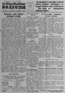П ролетарии всех стран, соединяйтесь! ш Ш ш ^и а м н ке К О Л Х О З Ы Орган Северного РК ВКП(б) и районного Совета депутатов трудящихся Новосибирской области ГВ О С К Р Е С Е Н Ь Е , 9 С Е Н Т Я Б Р Я г . № 72 ( 1 3 6 9 ) Цена 1 5 к о п . Не позднее 10 сентября каж ды й колхоз должен выполнить г о сударственный план хлебосдачи. Все силы на завершение хлебозаготовок! Празднику »День урожая“ -- достойную встречу С к а ж д ы м годом у в е л и ч и в а е т ся забота и помощ ь колхозному к р е с т ь я н с т в у со стороны вашей п а р т и и и Советского государс тва. Особенно большая помощь о к а з а н а в этом г о д у н аш е м у Сев е р н о м у р а йон у . Всё это создало в озможность ра ньш е на ц е л ы й месяц, в сравнении с п р о ш лым годом, передовым артелям р а йон а в ы п о л н и ть план хлебозаг о т о в о к . Т о ч н ы е расчеты п о к а з ы в а ю т , что при использовании всех и м е ю щ и х с я возможностей я опера ти в н о г о ру ко в одств а со сторо- вы се ль с ки х Советов и п равлений колхозов все сельхозартели н а ш е г о р а й о н а м о г у т безусловно выполнить план х ле бо за го тов о к к 1 0 с е нтя бря , а все остальные работы— до 15 сентября. Т а к и м образом, создались условия, к о г д а р а й о н ны й п р а з д н и к «День у р о ж а я » , слет п е редовиков, 3 - ю р а й о н н у ю сель с к о х о з я й с т в е н н у ю в ы с т а в к у и р а й о н н у ю я р м а р к у мы можем п ровести в се нтябре ,п осле з ав ер ш е н и я оче р е д н ы х работ. Райком п а р т и и и райисполком н а з н а ч и ли этот день на 16 сентября. Что же н у ж н о для того, ч т о бы о р г а н и з о в а т ь «Дню у р о ж а я » дос то йн ую встречу ? Это, в о - п е р в ы х . К а ж д ы й ко л х о з должен не позднее 10 с е н т я б р я вы п олн и ть г о с у д а р с тв е н н ы й план хле бо за го тов о к . Во - в т о р ы х , не позднее 1 5 сентября зав е рш и т ь во всех ар телях все очередные се ль с ко х о зя й с тв е н н ы е работы : к о с о в и ц у и обмолот з е р н о в ы х к у л ь т у р , сбор соломы и половы , у б о р к у , обмолот и расстил л ь н а , уб о р ку всех д р у г и х к у л ь т у р . В - т р е т ь и х , создать п р о ч н у ю о с н о в у для у р о ж а я б у д ущ е г о года : полностью з а с ы п а т ь в ы с о ко к а ч е с т в е н н ы е с е мена, в ы п о л н и ть план сева о з и м ы х , подъема зяби и ч е р н ы х паров, провести лущение с т е р н и . В - ч е т в е р т ы х , р а с с ч и т а т ь ся с государством по п оставкам се ль хо зп роду к то в и денежным п л а т е ж а м .И в - п я т ы х , о тре м он тировать все живо тноводческие п о м ещ е н и я , заготовить вдоволь к ормов для с к о т а , в ы п о л н и т ь план р а з в и т и я общественного живо тн ов одс тв а на 1951 год. На п р а з д н и к будут п р и г л а ш ены те сельсоветы, колхозы и МТС, к о торы е справились с поставленными выше задачами , передовики колхозов , МТС и п р е д п р и я т и й район а , л у ч ш и е ком б айн еры , т р а к тори с ты , б р и гадиры т р а к т о р н ы х и полеводч е с к и х бри га д, заведующие г л у б и н к а м и за го т зе рн о и агенты у п о л м и н з а г а , председатели сельс к и х Советов и колхозов , с е к ретари п е р в и ч н ы х п а р т и й н ы х и к о м с о м о л ь с ки х о р г а н и з а ц и й вместе с ко л х о з н и к а м и , добивш и м и с я в ы с о к и х производственн ы х показателей. Н а слете передовиков п о д в е д ут ся и то г и с о ци али с ти ч ес ко го соревнования за период хлебоу б о р к и и хлебозаго тово к.Победи т е л и б у д у т вручены перехо дящие К р а с н ы е знамена и П о ч е т ные грамоты райкома В К П ( б ) и р а йи с п ол ко м а . Б у д у т п р и н я т ы все меры для л