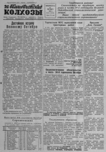 П р ол ет а ри и всех стран , соединяйтесь! К О Л Х О ЗЫ Орган С е в е р н о г о Р К В К П ( б ) и р а й о н н о г о С о в е т а д е пу т а т о в т р у д я щ и х с я Н о в о с и б и р с к о й о бла с т и Т р у дящ и е с я р а й о н а ! Становитесь на т р удов ую в а х т у мира в честь 34-й годовщины В ел и к о й Октябрьской социалистической револ ю ц и и . Выше знамя предоктябрьского социалистического соревнования ! В О С К Р Е С Е Н Ь Е 14 О КТ ЯБ РЯ 1951 г. № 83 ( 1 3 8 0 ) Цеаа 1Ь коа. Достойную встречу Великому Октябрю Тартасская М Т С выполнила план тракторных работ Осталось менее месяца, когда народи могучего Советского С о юза и все прогрессивное человечество будут отмечать великий праздник — 3 4 - ю годовщину Великой Октябрьской соци ал и с тической революции. По всей нашей стране ширится с новой силой соревнование в честь п р и ближающегося всенародного праздника, за досрочное вы п о л нение годового плана в п р о м ы ш ленности и завершение всех сельскохозяйственных работ в сельском хозяйстве. В связи с проведением в н аш ей стране к ампании по сбору подписей под Обращением В с е мирного Совета Мира 3 4 - я годовщина Октября будет отмечаться в обстановке нового производственного подъема т рудящ их ся в борьбе за сохранение и укрепление мира. Стремясь внести свой благородный вклад в справедливое дело мира рабочие, колхозн ики, м е х а н и з а т о ры становятся на трудовую вахту мира в честь Великого Октября. В нашей области, в начале октября с патриотическим призывом ко всем колхозникам, рабочим М Т С и совхозов о развертывании предоктябрьского соревнования выступил и к о л хозники артели «Путь Октября» У с т ь - Т а р к с к о г о района. Этот почин с радостью был подхвачен колхозами нашего района. Н а призыв у с т ь - т а р к ц е в г о р я чо отк л и к н у л и сь колхозники колхозов им. 6 - г о съезда Советов, «Вторая пятилетка» , «Крас ный Октябрь», механизаторы Тартасской МТС. Е щ е 2 0 сентября с призывом о развертывании соревнования в честь Великого Октября в нашем районе выступили работники торговых и заготовительн ы х ор ганизаций, которых поддержали многие предприятия района. В ходе развернувшегося пред- о к т я б р ь с к о г о соревнования к о л х о з н и к и , механизаторы и рабочие коллективы уже сейчас добились замечательных п о к а зателей. 10 октября механизаторы Тартасской МТС досрочно выполнили план т р а к т о р н ы х работ. Еще ?5 сентября т р а к торная бригада тов. Краснова первой в районе в честь Октября выполнила досрочно план подъема зяби. Колхозники артелей «Вторая пятилетка» , им. 6 - г о съезда Советов, «Красный Октябрь» , «Памя ть Кирова» з а сыпали полностью семена, з а канчивают в ближайшие дни все сельскохозяйственные работы и ремонт скотопомещений. Однако в ходе социалистического соревнования еще много недостатков. В т а к и х колхозах, к а к имени Маленкова, « К р а с ны й факел» еще не принято д о л ж н ы х мер к развертыванию предоктябрьского соревнования, зябь п а ш у т и засыпают семена очень медленно, ремонтируют плохо скотопомещения и п р е кратили заготовку кормов. Р я д колхозов д о сих пор не вступили в соревнование. Отдельные организации, правда, включились в соревнование, взяли обязательства, но на этом и остановились. Вот, например, работники тор гую щих организаций. Приняли общие обязательства, но соревнования между сельпо, между продавцами не организовали, план товарооборота 