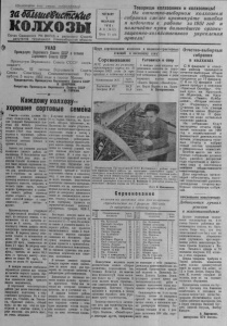 Пролетарии всех стран, соединяйтесь! ЧЕТВЕРГ 7 КОЛХОЗЫ ФЕВРАЛЯ 1952 г. №11 (1412) Орган Северного Р К ВКП(б) и районного Совета депутатов трудящихся Новосибирской области Цена 15 коп. т Товарищи колхозники и колхозницы! На отчетно-выборном колхозном собрании смелее критикуйте ошибки и недочеты в работе за 1951 год и намечайте пути дальнейшего органи- зационно-хозяйственного укрепления артели! ■> УКАЗ Президиума Верховного Совета СССР о созыве Верховного Совета СССР но С Пвл о р я з е в е з т а и : т д ь иум Верховного Совета С С С Р поста III сессию Верховного Совета » Союза Советских Социалистических публик 5 марта 1952 года в городе Москве. Рес Председатель Президиума Верховного Совета СССР - Н ШВЕРНИК, ьекретарь Президиума Верховного Совета СССР А. ГОРКИН. ----------* ---------- I Каждому колхозу- хорошие сортовые семена н н э и у т и м о С м а у е р м зш е о Ц н б е К л а н и — и с й п о о с В л н Ф К к о е П о в в м ( а р б , а ) л у ь р с в к о а о ж г а о о я сн . п о л в П е а о установил всем районам нашей области не позднее 1949 года завершить п р е о р в е а х н о н д ым к , спл б о о ш ле н е ым, уро р ж а а й й о н н ы и м сортовым посевам озимых и «ровых культур. Однако это указание многими колхозами нашего района не в х в м ы о о н в о з п о о ги б л в м н ы в е л н б 1 о о о . з 9 л а 5 ь с В ш 1 е е ян б г о о п л о о ь д с л ш о у о р и в т н и о л с в н т и ы ы в ш м е ь и п к о о с с л е е н е менами. Это произошло потому, ч зо т в о и ря а д гро р но ук м о ы води н те а лей мес к т о ах лхо н е уделяют должного внимания качеству посвеного материала, не стараются вывести, сохранить и посеять такие сорта, которые я х х орош н о аш п е р г о о изра р с а т й аю он т а: в у п с ш л е о н в и и ц а сортво «гарнет» и «диамант», овес «золотой дождь» виженец», рожь «вя и тк « а в » ыд и дру П ги р е а . вительством утвержден г д в о и а с р с у и т д , м а о р п с с о т т и в к е о н т н о о ы р т о й м и у х п с ос е к е м а в е ч н н е а о с , т й в с в а та з н д а е лятся на 3 класса. По этому стандарту еемена должны имеьт с з с л а я т е т е д с л я ую и. щ с и е К м е е п н е к а р а в ч с о е о м ст у в в е с к х н л о н а ж ы с е с е с у ть п ю о о т к н а н о е менее 95 проц., чистотой не менее 99 проц., влажностью не с б у о —ле вс 1 х 7 ож п ес р т о ь ц. Ко н в е тор м о е м н у ее клас90 проц., чистота не менее 98,5 п ж ст р е о с о т т ц а ь .; н н к е е м т м р е е е н н т е е ь е ем 9 9 у 7 0 к п л р п а о р с ц с о е у н ц — т ., о в в. сх ч о и В каждом колхозе необходимо стремиться довести все семена с н д е о ы в е к с а е п ч м о е я к ст а н з в , ат п и е е м л р и е в ю о н щ го и и ж х к е л к а а с ч с т е а р с . е т т в ь В е е ы н го класса запрещается. В передовых сельхозартелях района уже давно закончили или завершают подготовку к севу н х се о а м з , а е х н « н К о и р г м а о с . н м ы С а т й т а е л р и и ф н а а л а к , а, е и л м Н » . , о Т « в е О л б к ь щ о м и л а й т ст р у у п д и » ли до к сих оч п и о с р тке ещ се е м н ян е , п а ри в ряде колхозов эта рабоат идет, но очень медленно. В лучших колхозах районами. с 6 к - о г й о , с « ъ В е т зд ор а ая Сове п т я о т в и , ле и т м ка . » К , ру и п м . Калинина на опыте убедились, какое значение имеетправильная подготовка семян к посеву и с р е н о ж ы ог к е о е о г , о у д к р д н л о о о а ж в с е а с д й в а е ы н н ы с с н е е е ы в м , а е е ю н д т а о . п р Э а е т й р т о о о в л н о ь я г и к в о о р - и о в л в т в о а о ы с н ь однимиз главных условий, что э ки т е и у к р о о л ж х а о и зы . II пол в уча эт ю о т м г в о ы д с у о в э а с т е л н и н х п е о м а 