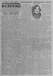 Пролетарии, всех стран, соединяйтесь! шШшие&исйя&е КОЛХОЗЫ Орган Северно го РК ВКП (б ) и районного С о в е та деп у та тов тр удящ ихся Новосибирской области N8 18 (1419) [ВОСКРЕСЕНЬЕ, 2 МАРТА 1952 года | Цена 15 коп. О мерах по подъему урожайности зерновых и крупяных культур в колхозах района в 1952 году Бессмертный гений русского народа Николай Вирта Рассматривая этот вопрос исполком райсовета п бюро РК ВКЩб) отметили, что в кол хозах «Память Ленина», имени Максима Горького, «Новая жизнь», имени Сталина, имени Ворошилова и некоторых дру гих недопустимо медленно идет подготовка к весеннему севу. Парторганизации указанных колхозов и сельские Советы не сумели мобилизовать колхозников на подъем урожайности. Подготовка механизаторских кадров и обучение колхозников на агротехнических курсах также идет неудовлетворительно. Что же необходимо сделать, чтобы обеспечить во всех кол хозах района успешную подго товку и проведение сева? Райисполком и бюро райкома партии наметили ряд конкрет ных мер, безусловное выполне ние которых должно обеспечить образцовую подготовку и прове дение сева,тем самым будут за ложены основы к подъему уро жайности. Прежде всего, нужно придать особое значение обеспе чению каждого колхоза собст венными сортовыми высокока чественным семенами. Для это го к 10 марта закончить по всем колхозам очистку и про верку семенного зерна на по севные качества.Семена с повы шенной влажностью— немедлен но просушить. Где еще не проведено, нужно в самые сжа тые сроки отобрать и направить образцы семян на повторную проверку в госинспекцию, за кончить обмен рядовых семян на сортовые. Ремонт всех тракторов, плу гов, сеялок, культиваторов и прицепов в МТС и сельхозин- вентаря в колхозах закончить не позднее 15 марта, обратив особое внимание на качество ремонта. К этому же сроку должны быть подобраны и пред ставлены на утверждение по стоянный состав работников трактовных бригад МТС,с таким расчетом, чтобы все трактора работали в две смены. Резко улучшить подготовку и пере подготовку механизаторских кад ров. Должны быть приняты меры к обеспечению инструментами и запчастями всех тракторных бригад, к завозке нефтепродук тов до начала полевых работ на весь весенний сев. Колхозы обязаны отремонтировать, а где нет, изготовить для тракторных отрядов помещения и трактор ные вагончики. Добиться, чтобы в каждом колхозе был безусловно выпол нен план по накоплению и вы возке на поля местных удобре ний,а также вывезены все мине ральные удобрения со складов. Сельхозотделу райисполкома обеспечить размещение посева по каждому колхозу укрупнен ными массивами, по лучшим предшественникам, с учетом дальнейшего перехода к освое нию севооборотов. В марте месяце при МТС провести десятидневный семи нар всех прицепщиков,плугарей, сеяльщиков, а при райсельхоз- отделе провести пятидневный семинар с бригадирами полевод ческих бригад и трехдневные курсы яровизаторов. Председатели правлений кол хозов и агрономы МТС и седь- хозотдела до 30 марта обязаны обеспечить выполнение плана яровизации, своевременно под готовить для этого помещения, инвентарь и оборудование. В каждом колхозе организовать обогрев семян по методу ака демика Лысенко. Для проведения подкормки озимых, в первую очередь се менных участков, заготовить органо-миниральных удобрений согласно довед