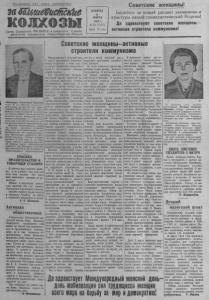 Пролетарии всех стран, соединяйтесь! Советские женщины! ыШмиеРиста&е КОЛХОЗЫ О р г а н С е в е р н о г о Р К В К П ( б ) и районного С о в е т а депутатов трудящихся Ново сибир с кой области СУББОТА 8 МАРТА 1952 г . JS 20 (1421) Цена 15 коп. Боритесь за новый расцвет экономики и культуры нашей социалистической Родины! Да здравствуют советские женщины— активные строители коммунизма! Советские женщины-активные строители коммунизма Александра Степановна Ларченко н д н о у к о о йю о в л и щ о ф ч е а е й 2 , р 0 м Н М е о л , Т в ет о Фи з р Т к а р н о б о и л о и х х т ц о а к 1 з е 6 о а т го н и л а м е с т . к е о л К л ь за с х а к в о г о е з а го Совета. Много сотен кр> иного р са о н г д ат р о а го Ст с е к п о а т н а овн в а ы .' ра С сти п л р а ошА л л о е г к о года она получает за выслугу лет 15 проц.трудодней дополнительно. Зимовка общественного скота на фертие проходит успешно: к в в о о е т е сь но с с в б к о е о д р т с е т ж в вз а е н н т и н е р а , а п б о о с л о т н ц н о и и с к а т л а ь ми ю с и ти об ч ж е е и с с пщч е е е н ч н е к и н о я , х к в . о м р В е м с а 1 т м9 е 5 и 2 с , г р о п а д о б у и от т н с А я и . ка в С м . и п Л о с а м в р о е ей фермы, взяла обязательство д н о и б я и п ть о с р я од е н щос е ти бо и ль п шро ег д о укт у и л в у н ч о ш ст е и общественного животноводства. СПАСИБО ПРАВИТЕЛЬСТВУ И ТОВАРИЩУ СТАЛИНУ В детстве, при царском режи ме, я не училась, так ка к мой отец был бедным. Это была доля миллионов женщин до ре волюции. Сейчас я вырастила шесте рых сыновей. Все они учатся, счастливые и радостные в жизни. Спасибо нашему Правительству и товарищу Сталину за заботу о советских женщинах и детях. А. 0. Шпакова. Активная общественница Учительницу Чебаковской на чальной школы Нину Ивановну Ивашкевич трудящиеся села знают не только как вниматель ную и трудолюбивую учитель ницу, но и как активную об щественницу. Нина Ивановна неустанно ведет массово-разъяс нительную работу среди населе ния. Только за последние пять месяцев она прочитала колхоз никам 9 лекций и докладов, провела много бесед. Комсомол ка Ивашкевич успешно проводит занятия с молодежью в кружке по изучению биографии товари ща И. В. Сталина. Она система тически оказывает помощь в выпуске колхозной стенной га зеты и принимает активное участие в проведении всех хо- зяйствеино-политических меро приятий на селе. Все свободное от работы вре мя Нина Ивановна отдает об щественному делу. В. Филимонов. Международный женский день 8 марта трудящиеся Советского Союза встречают в этом году в условиях небывалого экономиче ского и культурного подъема вашей страны. Под руководством коммуни стической партии советский на род успешно выполнил первую послевоенную пятилетку и в 1951 голу достиг новых круп ных успехов в области промыш ленности, сельского хозяйства, культуры. Широко разверну лось строительство великих строек коммуни зма— гиган тских гидроэлектростанций, судоход ных и оросительных каналов. Из года в год у нас повышает ся материальное благосостояние грудящихся, снлжаютса цены на товары, ширится жилищное строительство в городе и дерев не. Победы советского народа в области мирного строительства свидетельствуют о силе и мо гуществе нашего государства, уверенно строящего коммунизм. Во всех областях общественно- политической, хозяйственной и культурной жизнь женщины при нимают самое актлявое участие. Великая Октябрьская социа листическая 