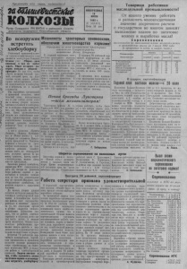 Пролетарии всех стран, соединяйтесь! заМшиевийпсние КОЛХОЗЫ Орган Северного РК ВКП(б) и районного Совета депутатов трудящихся Новосибирской области ВОСКРЕСЕНЬЕ 13 ИЮЛЯ 1952 г. № 56(1457) Цена 10 коп. Во всеоружии встретить хлебоуборку Решающей кампанией в ито ге сельскохозяйственного года является хлебоуборка.Товарищ Сталин учит: «Уборка—дело сезонное и она не любит ждать. Убрал во время-вы играл, опоздал с уборкой— проиграл». Но для того, чтобы убрать во-время богатый уро жай, который зреет на кол хозных нолях нашего района, нужно заблаговременно отлич но подготовиться к хлебоубор ке и встретить ее в полной готовности. Ряд партийных организаций п правлений колхозов, имея богатый опыт, использовали его и уже сейчас почти гото вы к началу уборки посевов. Активно готовятся к хлебоубор ке в колхозах«Заря коммуниз ма», нм. Крупской, нм. Моло това. Здесь укомплектованы людьми все комбайновые агре гаты, отремонтированы зерно очистительные машины,транс портные средства, подготав ливаются тока и сушильное хозяйство; А вот в колхозах «Память Ленина», «Память Куйбыше ва» и «Новая жизнь» к хле боуборке не готовятся. Предсе датели правлений тт. Чикунов, Елфимов и Баталов не орга низуют колхозников на ком плексное решение хозяйст венных задач, не используют всех резервов артели. К ре монту сушилок, жаток, зерно очистительных машин здесь еще не приступали. Закончив ремонт комбайнов, директоры МТС самоуспокои лись. Не смотря на решения бюро райкома партии о не достатках в ремонте комбай нов, до сих пор решительных мер не принято.Медленно пдет оборудование комбайнов, не решены вопросы с запасными частями. До начала уборки урожая остается не больше декады.Под готовка к хлебоуборочной'кам пании в большинстве колхо зов района идет неудовлетво рительно и вызывает тревогу за то, что некоторые артели к уборке окажутся неподго товленными. Достаточно ска зать, что по району отремон тировано в колхозах всего пя тая часть жаток н меньше трети молотилок. Однако сель- хозотдел райисполкома про являет явную вялость и мед лительность в руководстве кол хозами по подготовке к уборке. Встречая VII районную пар тийную конференцию, партий ные организации п правления колхозов должны развернуть шпре соревнование за отлич ную подготовку МТС п колхо зов района к хлебоуборочной кампании. Задача состоит в том, чтобы выполнить планы заготовки кормов и во всеору жии встретить хлебоуборку! Машинисты тракторных сенокосилок, обеспечим животноводство кормами! Обращение ко всем машинистам тракторных сенокосилок Северного района машиниста Янова Кочержко Товарищи работники маслодельной промышленности! От вашего умения работать и разъяснять молокосдатчикам значение досрочного расчета с государством во многом зависит выполнение планов по заготовке молока и выработке масла! С о р е в н о в а н и е маслозаводов по выполнению плана молокопоставок и производства масла на 1 июля 1952 года (в процентах к годов, и кварт, план.) Я, старший машинист сено косилки тракторного агрегата бригады № 9,Тартасской МТС, работая на лугах колхоза им. Кагановича, включился в со ревнование на заготовке кор мов п беру обязательство за сезон, до начала хлебоуборки, убрать не менее 900 гектаров трав с хорошим качеством. В этих целях я старательно уха живаю за машинами н еже дневно буду выполнять норму на 1