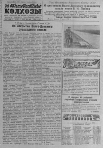 '-О Пролетарии всех стран, соединяйтесь! шШбшеЯисМс&е КОЛХОЗЫ Орган Северного РК ВКП(б) и районного Совета депутатов трудящихся Новосибирской области № 57 (1458) I ЧЕТВЕРГ, 17 ИЮЛЯ 1952 года | Цена 10 коп. Указ Президиума Верховного Совета СССР О присвоении^Волго-Донскому судоходному каналу имени В. И. Ленина Согласно предложения Совета Министров СССР и ЦК ВКП(б) присвоить Волго-Донскому судоходному каналу имя В. И. Ленина и именовать его — «Волго-Донской судоходный канал имени В. И. Ленина». Председатель Президиума Верховного Совета СССР Н. ШВЕРНИК. Секретарь Президиума Верховного Совета СССР А. ГОРКИН. Москва, Кремль. 10 июля 1952 г. В Совете Министров Союза ССР Об открытии Волго-Донского судоходного канала смо С т о р в ел ет М р и а н п и о с р т т ров С ст С р С о Р ите р л а е с й Волго-Донского судоходного в к т а е е н л с а ь л с а тв п е р и н е н д з о с а й е к д к л а о ю т м е ч л и е е н с м с и и е и ко в м о П и р с г а с л и в а и и с е т к о м о в к г . о е Со со к с о о у р л д о у о в ж х ы о е д н м н и о й К г . о М В . о к л п а г н о о а - л Д п а о р н и и у в с и т т а е н л о ь в ст и в л а , ч п то о з с а т д р а о н и и т е ельс П т р в а у г н и т о р а - о л в Д с а в о т , о н а д н с Ц у к ц и о и м г и в л о я э и н к с с с к у с п о о д л о й о у р х а о у т д ж а г н е ц и о н и д г и ю р о й оэ В л д е к о л к л а я орошения первой очередив л в 1 а ы 0 с 0 х ти з т е ы м с е в . л ы ь п г о е в л к н т Р е а о н р с о о т в ов в ск з у о а с й с т у а ш но л о в и б ленный срок. д н о ы в В а й ) п к т о а с В е н ч т о е р а л о л н г и е о н е д - ы Д л о : и н 1 н с о 9 к й 4 о 9 й — 10 1 с 9 1 у 5 д 2 к о и х л о г о д о з м 1 а е 3 м т и р , п с л 3 о 1 т н и 3 а н с а о с м с у н и д ы о и х м о и дн с д т ы а а м м н б и ц а и м ш я и м л , и ю , 7 водосбросами и водоспусками, н н 2 ж ы ы д а м м е в н и и а и р я п и п м е й у и р н н е , о к п - - т р р 8 а е а м м в м а о и м н о , с т и т н , а ы п м о м р и с и и т , с а т н п з а о а а н в р г я р о о м а ч м и н и м о е й т п р д р о и о в р к о ; а г н о а й ль д н л ой ино а й в 1 т 0 ом 0 о к б и и л л о ь б) Цимлянский гидроузел' в составе земляной плотины д сл л и и в н н о о й й 12,7 б 5 ет к о и н л н о о м й етр п а, ло в т о и д н о ы н д эл ы ли е х к н т ш о р й л о ю ст з а 4 о н 9 в ц 5 , и ,5 и, су м д е о т 2 х р о а д , н с о у г д г о о и х д к о р а д о нала между шлюзами длиной 4,9 километра, аванпорта, о д г р о р о е л р х у о о ж о в д ж е н о н н в о о и г г я о п о , о н а и п р л р о т и ш т а г и к о а н ж ц с е с и е ; е о й н н н ж о о е г г о л о ез с п н о е о в) Донской магистральный н о н о р и г о я о си в те в л о ь д п н о л з ы о а т й б и о н р к е н ан ог а Ц о л им о с л т о я о н г р о с у к л ж о о г в е о п о ги р р д е у д ж р е о е л у н и з и т л я е а л Н ьн и д о ж о г н о е г к -Д о а л н о о н а в л с н к а о о д г г о л о и р н а о с с й о 27 километров, д с ск к л о и и й н й ой р р а а с с 7 п п 2 р р , е 9 е д д е е к л л и и и л т т о е е м л л е ь ь т н Н н р ы и ы а й ж , й н к к е А а а - н Д н зо а а о в л л н длиной 92,2 километра; г) новые железнодорожные линии от станции Морозов- ская Сталинградской железной д у у з о з р л л о а а ги и до д о о с т т Ц Ц а и н и м ц м и л л я и я н н с К с к у к о б о г е г о о рле г г и и д д С р р т о о а линградской железной дороги общей протяженностью 174 км. На указанных сооружениях выполнено: земляных работ (выемок и насыпей) в объеме л б 1 о е 5 з т 2 о — , б 1 е 2 т , м 9 о 6 н л н н ы . х мл к и н у . бо б м е е т к т о у р н б о н о в м ы , е х тр р ж о а в е , работ по креплению откосов земляных сооружений на площади 2,9 млн. кв. метров, уложено каменных банкетов, фильтров и дренажей 1,6 млн. к