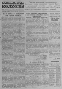 Пролетарии всех стран, соединяйтесь! ыШш£висбШ&е КОЛХОЗЫ Орган Северного РК ВКП(б) и районного Совета депутатов трудящихся Новосибирской области № 63 (1464) | ЧЕТВЕРГ, 7 АВГУСТА 1952 года | Цена 10 коп. Товарищи колхозники и механизаторы! Выполним планы накопления кормов, дружно и организованно проведем уборку урожая , хлебозаготовки и весь цикл летне-осенних работ. Мобилизуем для этого все силы и средства. ВЕСТИ БОРЬБУ С ПОТЕРЯМИ ПРИ УБОРКЕ УРОЖАЯ Облисполкомом и обкомом ВКП(б) намечены конкретные меры по борьбе с потерями при уборке урожая. В постановлении отмечается, что в прошлом го ду в колхозах и совхозах об ласти допускались потери зер на пз-за неудовлетворительной организации уборочных работ и плохого контроля со сторо ны партийных, советских и сельскохозяйственных органов. Для предотвращения потерь облисполком н обком ВКП(б) обязывают партийные, совет ские,сельскохозяйственные ор ганы, директоров МТС, пред седателей колхозов немедлен но включить в работу все ком байны, жатки, лобогрейки и другие средства уборкп. На участках с низкорослым хле бом и с наличием подгона при менять простые уборочные машины. Производить обкосы и прокосы хлебов. Оборудовать все комбайны необходимыми приспособлени ями для уборки низкорослых, полеглых хлебов и хлебов с подгоном, а также зерноуло вителями, половосборщикамп и соломокопнителями. Запре тить уборку комбайнами на высоком срезе. На низкорос лых хлебах производить срез не выше 7—10 сантиметров. Обеспечить правильную регу лировку комбайнов, не допу ская оставления _ колосьев, неполного вымолота и дробле ния зерна, а также потерь хле ба в соломе ц полове. Раз грузку бункеров производить на ходу в хорошо подготов ленные плотные бестарки.Про извести наращивание выгруз ных шнеков парусиной и обо рудовать разгрузочные пло щадки. При уборке хлебов просты ми .уборочными машинами п вручную организовать свое временную вязку снопов вслед за косовицей, с одновремен ным сбором п подгребанием колосьев, постановку снопов в суслоны и после просушки их проводить немедленное скирдование п обмолот. При перевозке снопов дни ща бричек обшивать плотными досками, застилать пологами. Организовать обмолот хлебов не позднее 4 —5 дней после начала косовицы. Обеспечить на всех убороч ных полях обязательный под- бор п сгребание колосьев кон ными граблями. Для лучшего сбора колосьев зубья конных граблей переплести проволо кой. Широко практиковать ручной сбор колосьев. Не до пускать приёмку нолей, на которых не проведены эти ра боты. Принять дополнительные меры к тому, чтобы в ближай шие дни закончить новое стро ительство крытых токов, а также привести в полную го товность все зерносушилки, имеющиеся крытые тока п зерноочистительные машины, обеспечив их круглосуточную работу. Обеспечить обязательное взвешивание всего хлеба, по ступающего от комбайнов и молотилок, правильный учёт п отправку зерна с токов на за готовительные пункты, сушил ки н склады строго но весу и с накладной. Запретить учет поступающего и отправляемо го зерна мерными ящиками, ведрами и другими недопу стимыми способами. Организовать охрану н конт роль за сохранностью хлеба в поле, на токах, при молоть бе п перевозках. Выделить весовщиков, кладовщиков, -сто рожей и объездчиков. Обеспечить в сжатые сроки уборку урожая с семенных участков, немедл