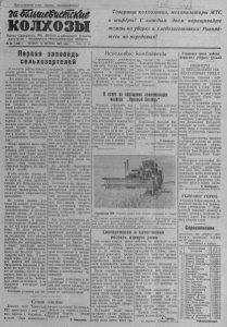 Пролетарии всех стран, соединяйтесь! ыШтеЯисШ&е КОЛХОЗЫ Орган Северного РК ВКП(б) и районного СовеУа депутатов трудящихся Новосибирской области № 65 (1466П ЧЕТВЕРГ, 14 АВГУСТА 1852 Т^а Г Цена 10 ко т е к /, Товарищи колхозники , механизаторы М ТС и шофёры! С каждым днем наращивайте темпы на уборке и хлебозаготовках! Равняй тесь на передовых! Первая заповедь сельхозартелей В колхозах района началась уборка урожая. Хлеб пошел в закрома государству. Что может бытьблагороднее в и ат о ь тв с е т т а с л т и в н е с н к н о е г е о , ка у к каз н а е ни за я бы и с честью выполнять его: «...не т к д о и о а т в ч в к л и и е и , к ф с а о й р р т а п с з е е и в с р ь е р в р у ы н й о х и т т е т ж е е и гл х д а , х в н л н и е е о б й б о й . о у з б п а о е г з р р о а вая заповедь — выполнение плана хлебозаготовок...» Передовые колхозники и м по е л х н ан и и ть зат д о о р л ы г М пе Т р С ед го Р т о о д в и ы ной вы и партией—в сжатые сроки, с г в а ы т с ы о й ким у к р а о ч ж ес а т й в , ом вы у р б а р щ ат е ь нн б ы о й прилежным и дом и досрочно ч р е а с с т с н ч ы и м тат т ь р с у я с ка г м о М . с о у ж д н ар о ст п в р о и м ве п с о ти хл м е н б о о г п о ос п та р в и - меров правильного С ни п м е а р н в и ы я х э д то н й ей гл уб ав о н р о к й и д за р д у а ж ч н и п о . о л в с е о и д в у е Б т т о а л с , ь д ш ач е « у - З К а з у р е л р я и н к а о к в с о с е м к л о м ь г х у о о н з и а с з р е м л т а ь е » , с « к К о р В й ас э н и т ы их й д а р О р у к т г т и е я л е б я . р х ь», х и о м р . ош К о ру о п р - г т к а и а н р и о з в з е к о р а в н а а н ег а н о а . с М уш т о о б к и к а а л х и и , зу т п е р о т д а с н р я а с б п в о о с т я р тягловая сила, созданы с д т ы оя и н з ны л е учш тр и а х н , сп д о о р б т р н о ы со е ве б с р т и н г ы п а х о колхозников. Но успехи десятка х п с о к а з о р о х т в о и з й я н н й е ы ст е д в , о е л н ж н с н о ы ы в е етс у к и с и п е з о , а к г а о и т с в о е а в л к т и о ь ь л тельные органы. В болыиин- стве-то колхозов хлеб идёт на пункты медленно. К примеру в сельхозартели «Новый путь» к до ачк си а. х п Н о а р ца т р о и к т ах вре с д к н о а п я и р л а о с с ь с н о ы тн г и ос ц у е д н а т р н ст ер в о у в х в л се е г б о а, д а еся с т д к а и центнеров. На помощь колхозу выделены две автомашины, да и своего транспорта много, однако хлеб задерживается. к с К н у а е о д х р л а о х р в о с и з т з м в и е е у р м е н т . в с а с М я , ег о о т л о 4 о г л 0 т д и 0 о а ш ва ь к ц а е к с н 6 д т а н н л а ц е е р н г т о о т о в . в д П а е р т л е е д в н се а в д с а п е т о е м л ж о ь д щ ё п т ь р , , а ч к в т т л о о е - н к т т и о о я -т з о т а . п н К р е и о го р з сд у а е б е т л о а т е к с т у в . ои Д зе х а р ж н к е а ол н х о а оз н с н у н и ш е к к о у в м и об и п и о л н д и е полностью использует свой транспорт. Основным условием для бес прерывной ляется комб с а д й а н ч о и вая зерн у а борк я а в . Поэтому на косовицу хлебов должны быть включены все у з н о б у в о ю а р т о ь м чн о и ы щ х е ь. н м Н е а о о ш бх и о к н д о ы и е- м г и о де и п с а в по п к л о о ь л л хозах не наблюдается нужной с б е а й йн ча ер с С н е а в п ер р н яж ой ен В н 1 о Т с С ти т . . У К со о в м , м н р е я аб ть о « т С а т Л ю а е л щ н и и и н й н ец а - в » 6 ,н » а к ч о н а л с о х т в о о о з й е пр м о а « с ш т П и а а ивает, допускает потери и н н о я р е м тс а я. выр К аб о о м т б к а и йн им н н е е вы и по м л е ет второй очистки. А ведь т.Усов давал обязательство работать хорошо п не допускать брака. Сейчас необходимо также, чтобывсе зерноочистительные м л в и а ат ш ь и к н д р ы у ел г о и ло т 