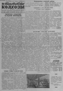 Пролетарии всех стран, соединяйтесь! ___________ i------- ---- ‘заШмие&мпсНке КОЛХОЗЫ Орган Северного РК ВКП(б) и районного Совета депутатов трудящихся Новосибирской области № 77 (1478) | ЧЕТВЕРГ, 25 СЕНТЯБРЯ 1952 года | Цена 10 коп РАССЧИТАТЬСЯ С ГОСУДАРСТВОМ ПО ПРОДКУТАМ ЖИВОТНОВОДСТВА Вся страна, весь наш народ охвачен н ов ы м трудовым подъёмом в честь X I I съезда Коммунистической партии. Труженики и нашего района с т т и р т е ь м э я т т у ся з т н о а ж м е ен д а о т с е т л о ь й н н у о ю в д ст а р т е у . с п т о в л Р о н я я д т ю р т уд к я о щ о л б х и я о х з з с а о я т в е у л с ь н п с е т ш в б а н о . о л С ь е ш в л ы и ь н хозартели «Память к б а ы » шев п а о » лно я сть « ю Втор р а а я ссч п и я т т а и л л К и е у с т ь й по поставкам мяса. На 90—80 процентов рассчитались по э а т л о ь м н у ые вид сд у а п т о ч с и т к а и вок Сев и е н р д н и о в г и о ду п Гражданцевского сельсоветов. л « о П к а Р а м а к я с о т с л ч ь х и о т з а ы л К и и « с Н р ь а о м в н я а о т » ь , с Л да е ч н е и « н П а м » у , т о ь к ва, соц и и м а . лиз Ж м д у а » н , ова и , м. « М К а р л а е с н н к ы о й факел». Близки к завершению т п в со а а л л в а е и н и А т с о о ь в « в П в . ж а о у р и т т т т ь е е л л к и С и о т л а х л и о м и м з н н ы . о а г » В и . о х р Р о а ш с с и с е л ч л о и ь им. 7-го съезда Советов, «Красный Октябрь», «Общий труд» планы мясопоставок выполнили лишь на 50—34 процента. При этом не организован нагул скота, предназначенного для н сд и а ю чи п , ого ч л т о о вь в я еде н т а к фер с м о а к х р . ащ О е б этом председатели колхозов з зу н ю аю т т, от н д о ел в ьн се ы -т е ак г и урт н ы е , ор с га т н е и м , чтобы сдавать скот хорошей упитанности. Ч т е е б л П а и л к о о х в Б о ск о о л р г ь а о ш с , с е чи - т И К ы о у в т л а ю и ю к к т а о с н в я о с в к с о к ж г о о и - , го, Останниского сельсоветов. Сельхозартели «Украйней», им. Сталина годовой план с с к д ч о и ач т н ы и а ва м 4 ю о 0 л т — с о я к 5 а 0 в и п ы н р п д о о и ц л в . н П и и л д л о у и х а о л т ь о н р л ы а ь с е сдатчики Верх-Красноярского, Остяцкого, Н-Елнзаровского х л с у е о с е т л н з а ь а и н с х я о о в в у и е и л т т у о р ь ч в а ш . с к х Н и о о т е н д о ь т о б р в х о у а о л ч н д ь е и и т я мо з м а п о в о л с к о т т о к у е л а м п , , Награждение учителей района Залипла Анна Адамовна— учительница и заведующая Украинской начальной школы и Копытова Елизавета Семеновна— тельница Прпбелппской семилетней школы. Указом Президиума Верховного Совета СССР от 22 августа 195-2 года за выслугу те л л е я т и Се б в е е з р у н п о р г е о чн р у а ю йон р а аб м о е т д у ал н ь а ю граждены учиучи «За трудо вое отличие»: Соревнование в честь XIX съезда партии Слово свое дерЖим Как только радио принесло |крепи и агитаторов на каждом весть о созыве 5 октября XIXI производственном участке, ко- и ни е я по пл н ан аз а на с ч д е а н ч и и ю д м о ол в о ы к п а олн г е о сударству. тов Н ко е й всё в порядке и с заго iñepcTii. а В р о т р е о л ш и ило « в П а у , т « ь Кр С а т с а н л ы и Е й н сл а и ф », ак се ел н л » м ьх . оз и ност д ь р ю уги н е о с р д а а с ч с е чит ш ал е и р с с ь ти, по т л о м к р у яд н к и о к з м о м м л а х у » о н , з и о и з в м м , . у К к » а , а л к ин и и « м н З . а а р , С я т « а П л к у и о т н м ь а только наполовину и меньше выполнили свои обязательства. Не рассчитались до сих пор еще некоторые жители Биазин- с го ко П с г е о л л , а ь н О со с в т з е я а т ц г о о к в т о . о г в о к , и Фе я д и о ц ровс т к о о ж е выполнен не всеми колхозами и хозяйствами колхозников. Н т к у о ед 