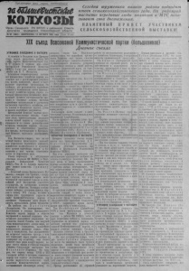 Пролетарии всех стран, соединяйтесь! КОЛХОЗЫ Орган Северного РК ВНП(б) и районного Совета депутатов трудящихся Новосибирской области № 82 (1483Н ВОСКРЕСЕНЬЕ, 12 ОКТЯБРЯ 1952 года | Цена 10 коп. Сегодня труженики нашего района подводят итоги сельскохозяйственного года . На районной выставке передовые люди колхозов и МТС пока зывают свои достижения. ПЛАМЕННЫЙ П Р И В Е Т УЧАСТНИКАМ СЕЛЬСКОХОЗЯЙСТВЕННОЙ ВЫСТАВКИ! XIX съезд ВсесозюнойКоммунистической партии (большевиков) Дневник съезда УТРЕННЕЕ ЗАСЕДАНИЕ 6 ОКТЯБРЯ 6 октября в Большом зале Кремлев ского дворца продолжал работу XIX стГе|д партии. Председательствует тов. II. Хрущёв. В порядке дня— отчет Центральной Ревизионной Комиссии # ВКЩб). Слово для доклада предостав- • лйется тов. П. Г. Москатову. , А Докладчик охарактеризовал состоя ние финансового хозяйства партии, по ложение дел с рассмотрением докумен- . тов, писем, заявлений, жалоб в цент ральные партийные организации. Он сообщил, что руководители партийных органов в большинстве своём правиль но ведут хозяйство партии, строго со блюдают финансовую дисциплину. Цент ральный Комитет систематически про верял и оказывал помощь местным партийным организациям в улучшении постановки партийного хозяйства, учё та членов и кандидатов партии, учёта и выдачи партийных документов. Центральный Комитет партии полу чает многочисленные письма. Совет ские люди, 'преисполненные желанием помочь нашей партии и государству, f 1 обращаются по самым разнообразным вопросам, имеющим нередко государ ственное и общественное значение. Все письма, поступающие в Централь ный Комитет, тщательно рассматрива ются. Тов. Москатов говорит, что за от чётный период происходило дальней шее укрепление партийного аппарата, повышение политического и культур ного уровня партийных кадров и по вышения у них чувства ответствен ности за порученное дело. Съезд переходит к обсуждению отчетных докладов ЦК ВКП(б) и Цент ральной Ревизионной Комиссии ВКП(б). -Тов. Н. С. Хрущёв предостав ляет первое слово тов. Г р и ш и н у (Москва). — Отчетный доклад Центрального Ко митета,— говорит тов. Гришин,— воору жает партию и советский народ вели чественной программой борьбы за даль нейший рост могущества советского государства, за построение коммуни стического общества. Всемирно-истори ческие победы,с которыми пришла пар тия к своему XIX съезду, вселяют в сердца всех трудящихся гордость за нашу Коммунистическую партию и вызывают стремления идти вперёд и вперёд, преодолевать любые трудности. , На трибуне тов. П а т о л п ч е в (Белоруссия). Он подчеркивает, что изложенные в докладе Центрального Комитета задачи партии в области внутренней и внешней политики обес печивают дальнейшее укрепление мо гущества нашей Родины, как ведущей силы международного лагеря мира, де мократии п социализма, дальнейшее победоносное движение нашего обще ства к коммунизму. Зал аплодисмента ми встречает заявление оратора о том, что советский народ горячо одобрит п поддержит эту политику, еще теснее сплотит своп ряды вокруг партии, во круг своего вождя и учителя товарища Сталина. Следующим выступает тов. М е л ь н и к о в (Украина). Он гово рит, что период между XVIII и XIX съездами войдёт в историю советского народа как период величайшего тор- жества марксистско-ленинских идей, политики Коммунистической партии, составляющей ж