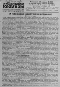 -----/ V с/ Пролетарии всех стран, соединяйтесь! заШтсвиопскЬе КОЛХОЗЫ Орган Северного РК ВНП(б) и районного Совета депутатов трудящихся Новосибирской области № 83 (1484) I ЧЕТВЕРГ, 16 ОКТЯБРЯ 1952"77да~ | Цена 10 ксп. Резолюция XIX съезда ВКП(б) по отчетному докладу Секретаря ЦК ВКП(б) тов. Маленкова Г. М. о работе ЦК ВКП(б) ( П р и н я т а е д и н о г л а с н о ) Заслушав и обсудив отчетный доклад Секретаря ЦК ВКП(б) тов. Маленкова Г. М. о работе ЦК ВКП(б), XIX съезд ВКП(б) поста новляет: Одобридъ политическую линию и практическую работу ЦК ВКП(б), XIX съезд Всесоюзной Коммунистической партии (большевиков) Дневник съезда В Е Ч Е Р Н Е Е З А С ЕД АН И Е 7 ОК ТЯБ РЯ На вечернем заседании продолжались прения по отчетным докладам Цент рального Комитета ВКП(б) и Централь ной Ревизионной Комиссии ВКП(б). Председательствующий тов. Л. М. Ка г а н о в и ч предоставляет слово т. Б е л я е в у (Алтайский край).Ора тор говорит о больших успехах в раз витии промышленности, сельского хо зяйства п культуры края. Отмечая, что Кулундинские степи подвергаются частым засухам т. Беля ев считает необходимым развернуть строительство гидросооружений, поз воляющих использовать воды реки Обь для орошения. Выступивший вслед за тем т. II р а с с (Молотовская область) сообщил в сво ей речи, что область благодаря огром ной заботе партии и правительства стала одним из крупнейших индуст риальных центров страны. Тов. Брасс ставит вопрос о дальнейшем развитии в области гидротехнического строи тельства, об использовании огромных водных запасов уральских рек. Слово получает т. Е г о р о в (Ка рело-Финская* ССР). Он рассказывает об успехах, достигнутых трудящимися Карело-Финской республики. На трибуне т. Иг н а т о в (Красно дарский край). Он говорит о том, что за годы от XVIII до XIX съезда тру дящиеся Кубани, как и весь советский народ, под руководством Центрального Комитета партии достигли замечатель ных успехов в хозяйственном и куль турном строительстве. v Тов. Игнатов подробно останав ливается па развитии сельского хо зяйства края. Взволнованную речь о величии пар тии Ленина—Сталина, 'о советском на роде, достигшем под руководством пар тии Ленина—Сталина исторических побед, произносит т. К о р и е й ч у к (Украинская ССР). После очередного короткого переры ва съезд возобновляет работу. Появле ние в президиуме съезда товарища И. В. Сталина и его верных сорат ников делегаты и гости встречают бур ной, продолжительной овацией. Все встают. Раздаются приветственные воз гласы: «Да здравствует товарищ Сталин!», «Товарищу Сталину—ура!». Следующимвыступает т. Раз заков (Киргизская ССР). Благодаря неуклон ному осуществлению ленинско-сталин ской национальной политики партии, говорит он, киргизский народ за годы советской власти достиг больших ус пехов в своём политическом, эконо мическом и культурном развитии. Председательствующий предоставляет слово делегату съезда Маршалу Совет ского Союза, военному министру СС Р тов. Василевскому тепло встречен ному съездом. Тов. Василевский говорит о том, что солдаты, сержанты, офицеры и ге нералы живут общими чувствами со всем народом. Армейские коммунисты и все советские воины пришли к XIX съезду партии с новыми успехами в боевой и политической подготовке, как никогда сплоченными вокруг горячо любимого вождя ивеликого полководца товарища Сталина. —Состояние боевой и оперативной по