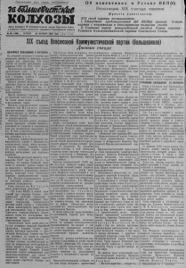 Пролетарии всех стран, соединяйтесь! ъаШшёшпМке КОЛХОЗЫ Орган Северного РК Коммунистической партии Советского Союза и районного Совета депутатов трудящихся Новосибирской области № 85 (1486) I ЧЕТВЕРГ, 23 ОКТЯБРЯ 1952 года" | Цена 10 коп. XIX съезд Всесоюзной Об и з ме не ния х в У с т а в е ВКП(б) Резолюция XIX съезда партии (Принята единогласно) . X IX съезд партии постановляет: 1. Утвердить представленный ЦК ВКП(б) проект Устава партии с поправками и дополнениями комиссии съезда. 2. Считать впредь утвержденный съездом Устав партии — Уставом коммунистической партии Советского Союза. Коммунистической парти (большевиков) Дневник съезда ВЕЧЕРНЕЕ ЗАСЕДАНИЕ 3 ОКТЯБРЯ до Н л а жа в л е и ч с е ь рн п е р м ен за и с я ед п ан о ии тр 9 еть о е к м тя у бр п я ун п к р т о у порядка дня—«Директивы XIX съезда партии по пятому пятилетнему плану развития СССР на 1951—1955 годы». Председательствующий т. Аристов предоставляет слово т. К у т ы р„е в у ( в С а в е е т рд о ло б в о с л к ь а ш я и о х бла у с с т п ь е ). хах Он в ра р с а с з к в а и з т ы и и промышленности Урала. н п е р н и В и я ы ю т п и у я с с х к 1 о 9 в б 4 л а 0 а ло ст г в о и ой до у м в п е р л о б и д о ч у л и к е л ц с и я и че п н о а м с п р в р ав е д 4 р ш а и з О н а о . ра ст т О о р с р о о е б н к е и н р е н и . о тик б у ы ет стр п о ла р н а о зв в и ы в е аетс о я рг м ан а ы за серьёзные недостатки в их работе. Он ставит также вопрос о комплексном использовании сырья. лен Мно и с н т и и стр то с в у . дост М рои а т л ел ы ьн ш о е й в промы н ш о Святпл свое выступление вопросам развития машиностроения в пятой пятилетке. О го н О м о с т а о шм бе и е н н ч н о а о с е т т р б б о о о е л л н ь ь ш и ш я и а . е я у р с а п бо е т х а и , у с к о а в з е ы т в ск ае о т р б о ш о о р и т и а н т т . е о К л р д я , л м я н п и и р м м о п е , д о х е а в л с н а о ч и н з а з а д с а а т ц н н и и о н и ю с а т ш и т и и , р м у о о и д т с о н в ё о о м м е с а к я н ш и т и с и х ю я но м р 1 с а т а 4 - к н у ы б е Р о а в б к ы о о е м тн б ш и ай к а н и га ы ю м щ и а и ш е т и . н э о к д с с т . к р а о в и а т т е о л р ь ы но , й уго п л р ь о мышленности, говорит т. Малышев под' аплодисменты съезда, могут сегодня с гордостью заявить товарищу Сталину, что они в состоянии создать любые машины, необходимые для народного хозяйства. ков С о л дс е т д в у а ющ С и С м СР выс т т о у в п . ае Ю т м с и у ни п ст о р в х . лоп О н о л л т о ет м к е в и ч ы а п е п о т о л , н в ч е т а н л о о о з в с о а м да у п н р и е у е в р ы о ч ж ш е а т е ю в н е и р е х т м л о . о й П п о ка п у я р б т о и в ы ню урожайности хлопчатника, заявляет оратор, Советский Союз значительно опередил капиталистические страны. Тов. Юсупов останавливается Далее на некоторых вопросах дальнейшего развития хлопководства. Слово получает тов. М.А. С ус ло в , тепло встреченный делегатами. а н л о ь м —н и ы ч X й е I с X к т и р е с у ъ д ез п т д о ро в В б ар К л и е П мщ ( ы б а ) С и т с а о н л ц о и и в н а ы л а й изм « а Э ге к н о и в С тя С щ С и Р е »,—г п о е в р б с р п и е т кт о и н в , ы откры по в б а е ю д т онос б н л о е г с о шествия нашей страны к коммунизму р и ом вн н ов е ь исс д я е к м а о е н м с у т ю рир с у и ю л т у п и ер м ед ог вс у е щ м ес м тв и о в с и о е м н в у е н щ т о с е г к о с о тв г с о а тро с я о п , ц е и е р г а ед о лис н т к е и а о п ч с е и п с т о к а р о л и г и м о с ы ти о е ч б е щ с е п к с р и т е м общественным строем. Значительную часть своей речи тов. Суслов посвящает вопросам партийной пропаганды. Товарищ Сталин в н е и д з л а и ц в и 