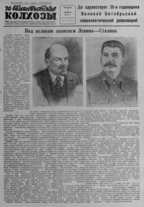 /пролетарии всех стран, соединяйтесь! шМтеЯисШШа КОЛХОЗЫ Орган Северного РК Коммунистической^партии Советского Союза и районного Совета депутатов трудящихся Новосибирской области пятница 7 НОЯБРЯ 1952 г. №89-90 (1490-91) Цена 20 коп. Да здравствует 35-я годовщина В е л и к о й О к т я б р ь с к о й социалистической революции! Под великим знаменем Ленина— Сталина Сегодня советский народ, трудящиеся всех стран отме чают 35-ю годовщину Великой Октябрьской социалистической революции . Наша Родина встре чает этот великий праздник в обстановке огромного полити ческого и производственного подъема, вызванного истори ческими решениями XIX съез да партии Ленина—Сталина. Съезд Коммунистической пар тии убедительно продемонст рировал великие всемирно-исто рические победы советского народа, ярким светом марк сизма-ленинизма осветил даль нейший путь к новым, еще более славным победам ком мунизма в нашей стране, к дальнейшему, еще более' ши рокому н мощному сплочению международных демократиче ских сил в интересах защиты мира во всем мире. Съезд показал величайшее единство рядов нашей партии, возросшую сплоченность пар тии вокруг ленинско-сталин ского Центрального Комитета, вокруг великого Сталина. Историческое выступление то варища Сталина на этом съез де было воспринято всем на родом с величайшим вооду шевлением. Сталинский гений озаряет трудящимся всех стран верный путь к полной победе коммунизма. ❖ * ❖ Тридцать пять лет назад самый передовой, самый рево люционный в мире рабочий класс России добился под ру ководством партии Л е ни н а - Сталина победы Великой Ок тябрьской социалистической революции. Великая Октябрьская социа листическая революция от крыла новую эру в истории человечества — эру пролетар ских революций. Тридцать пять лет, прошед шие с тех нор, как под мо гучим ударом рабочего класса России рухнул на одной ше стой части земного шара строй эксплуатации и классового угнетения и система мирового капитализма перестала суще ствовать как единое целое, с исключительной наглядностью продемонстрировали величай шую жизнеутверждающую си лу немеркнущих идей Октября. Силы социализма неизмеримо выросли, а силы капитализма значительно уменьшились. Сила п мощь Советского государства ярко проявились в ходе Великой Отечественной войны. Советский народ раз громил гитлеровскую Герма нию, освободил народы Евро пы от фашистского рабства, спас мировую цивилизацию. В этой тяжелой войне победил советский общественный и го сударственный строй, победи ла Советская Армия, победила мудрая, дальновидная полити ка партии Ленина—Сталина. Борьбой советского народа за победу коммунизма руко водит испытанная в боях пар тия коммунистов, вооружен ная гениальной сталинской программой коммунистического строительства. «Ныне главные задачи Коммунистической пар тии Советского Союза,—гово рится в решениях XIX съезда партии,— состоят в том, чтобы построить коммунистическое общество путём постепенного перехода от социализма к ком мунизму, непрерывно повышать материальный и культурный уровень общества, воспитывать членов общества в духе интер национализма и установления братских связей с трудящими ся всех стран, всемерно у к реплять активную оборону Со ветской Родины от агрессив ных действий её врагов». В послевоенный период со ветский народ добился но