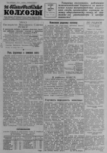 Пролетарии всех стран, соединяйтесь! задшше&исшке КОЛХОЗЫ Орган Северного РК Коммунистической партии Советского Союза и районного Совета депутатов трудящихся Новосибирской области Товарищи колхозники, работника животноводства! Боритесь за выпол нение плана воспроизводства колхоз ного стада, организуйте хорошую зи мовку общественному скоту, не сни жайте его упитанности и продук тивности! ЧЕТВЕРГ 18 ДЕКАБРЯ 1952 г. № 101(1502) Цена 10 коп. УКАЗ Президиума Верховного Совета РСФСР 0 проведении выборов в краевые, областные, окруж ные, районные, городские, сельские и поселковые Советы депутатов трудящихся РСФСР Президиум Верховного Совета Российской Советской Феде ративной Социалистической Республики постановляет: Назначить выборы в краевые, областные, окружные, рай онные. городские, сельские и поселковые Советы депутатов трудящихся РСФСР на воскресенье 22 февраля 1953 года. Председатель Президиума Верховного Совета РСФСР > М. ТАРАСОВ. Секретарь Президиума Верховного Совета РСФСР И. ЗИМИН. Москва, 15 декабря 1952 года. Роль фуражира в зимовке скота Огромные задачи поставлены пятилетним планом в области развития животноводства и по днятия его продуктивности.Вы полнение этих задач за висит от того, как поставлен учет скота, племенное дело, как организован стойловый период, также от того по-хо зяйски ли относятся работни ки ферм,правления колхозов к тому, чтобы в помещениях было тепло, уютно, чисто, что бы скот получал ежедневно свой полный рацион корма, чтобы все корма расходовались с веса, по норме, были учте ны и охранялись. Значительная роль в бере жливости, охране кормов, пра вильном их расходовании при надлежит фуражиру. В каждом колхозе эта единица должна быть центральной фигурой в животноводстве. Фуражиры-кладовщики на значаются правлениями сель хозартелей из числа лучших, проверенных колхозников, и назначаются они в зависимо сти от мест зимовки скота. Фуражир обязан следить за правильным складированием сена и соломы, вести книгу учета поступления и расходо вания кормов, ежесуточно, в установленное время отпускать корма заведующим фермами по весу, согласно выписанных ордеров, отчитываться перед правлением о поступлении и расходовании кормов. В ряде колхозов так и по ступают. Выделены фуражиры в сельхозартелях «Память Ки рова»—!. Васильков, им. Во рошилова — т. Останина, «Путь к коммунизму»—т.Ака тьев п в других. Все ори хоро шо работают, строго по нор ме, весу и в определенные часы отпускают корм, учиты вают и отчитываются перед правлениями в расходовании кормов. А вот в колхозах «Новая жизнь» и «Общий труд» фура жиров нет. И как результат, корма расходуются без меры и веса. Не налажен учет кор мов, н сколько пх израсходо вано правления не знают. За это говорят такие факты,когда в отчетах о расходовании кор мов артель «Новая жизнь» дает одно п то же количество наличия сена и соломы на 1 и на 15 декабря.Фактически же кормов перерасходовано бо лее 2 тысяч центнеров. А в колхозе «Общий труд» на 15 декабря даже оказалось кормов в наличии больше, чем на 1 декабря. По тысяче и более центнеров допущен перерасход грубых кормов в сельхозарте лях «Заря коммунизма», «Память Куйбышева», им. Ка гановича. Впереди еще долгая сибир ская зима. Ряд же артелей не выполнили планов накопления кормов и в целях сбережения их фуражиры здесь необходимы. Отделу сель