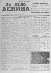 , 3 а д е л о Л е н и н а " 15 и ю н я 1 9 6 5 г о д а & / / Ч / / Ч / / + / / + / / » / / ц / / ц . ,у щ.// ц . / / ц . / / щ / / Ц / / Ц . / / Щ / / Щ / / ч / / щ / / Ч /у ' Ч - / / ч / л К нашим ч и т а т е л я м и с е л ь к о р а м У в а ж а е м ы е т о в а р и щ и ! П о с л е т р е х л е т н е г о п е р е р ы в а с е г о д н я в ы ш е л в с в е т п е р в ы й н о м е р н а ш е й г а з е т ы . О н а р а с с ч и т а н а н а м а с с о в о г о ч и т а т е л я . О ч е м б у д е т п и с а т ь г а з е т а ? Р е д а к ц и я н а м е ч а е т ш и р о к о п р о п а г а н д и р о в а т ь п е р е д о в о й о п ы т к о л х о з н о г о п р о и з в о д с т в а и о к а з ы в а т ь п о м о щ ь к о л х о з н и к а м в н е д р я т ь е г о на к а ж д о й ф е р м е , в к а ж д о й б р и г а д е . Г а з е т а б у д е т о с в е щ а т ь д е л а , ж и з н ь , б ы т в с е х т р у д я щ и х с я р а й о н а , р а с с к а з ы в а т ь о д о с т и ж е н и я х с е л ь с к о г о х о з я й с т в а , п р о м ы ш л е н н о с т и , к у л ь т у р ы , н а р о д н о г о о б р а з о в а н и я , т о р г о в л и , з д р а в о о х р а н е н и я и т. д. Н а ш а г а з е т а б у д е т р а с с к а з ы в а т ь о ж и з н и и д е я т е л ь н о с т и п а р т и й н ы х , п р о ф с о ю з н ы х и к о м с о м о л ь с к и х о р г а н и з а ц и й , о р а б о т е п р о п а г а н д и с т о в , а г и т а т о р о в , л е к т о р о в . Г а з е т а б у д е т п о м о г а т ь т р у д я щ и м с я у с т р а н я т ь н е д о с т а т к и в р а б о т е , к р и т и к о в а т ь н е р а д и в ы х , л о д ы р е й , р а з л и ч н о г о р о д а т у н е я д ц е в , н а р у ш и т е л е й о б щ е с т в е н н о г о п о р я д к а , в с е х т е х , кто м е ш а е т с п о к о й н о ж и т ь и т р у д и т ь с я л ю д я м . Н о г а з е т а м о ж е т б ы т ь и н т е р е с н о й и н у ж н о й к а ж д о м у т р у д я щ е м у с я т о л ь к о в т ом с л у ч а е , е с л и в е е ра бот е , у ч а с т в у ю т с а м и ч и т а т е л и , к о г д а р я д о в ы е к о л х о з н и к и , р а б о ч и е , и н т е л л и г е н т ы с а м и п и ш у т в г а з е т у , р а с с к а з ы в а ю т о с в о и х т о в а р и щ а х по т р у д у . % Р е д а к ц и я п р и г л а ш а е т в с е х с о т р у д н и ч а т ь в г а з е т е , о н а в а ш а , т о в а р и щ и , п о т о м у и д о л ж н а с о з д а в а т ь с я в а ш и м и р у к а м и . И т а к , п е р в ы й н о м е р в ы п о л у ч и л и . Ж д е м в а ш и х п и с е м , з а м е т о к , с т а т е й в с л е д у ю щ и е н о м е р а . Р Е Д А К Ц И Я . / / ■ к / / 'к / / - к / / - к / / - к / / - к У / - к / / - к / / + / / + / / + / / + /7 - k /S - k / / * S S + S /+ Л У Р О Ж А Ю - Д О Б Р У Ю В С Т Р Е Ч У У ремонтников „Сельхозтехники" Г о р я ч и е д н и с е в а — п о з а д и . П р и б л и ж а е т с я н о в а я к а м п а н и я — п о р а з а г о т о в о к к ормов , а з а т е м и х л е б о у б о р к а . П е р е д р е м о н т н и к а ми о б ъ е д и н е н и я „ С е л ь х о з т е х н и к и " в с т а л а н е о т л о ж н а я з а д а ч а — к о л х о з а м им. X X I I с ъ е з д а К П СС и „ В о с х о д " с в о е в р е м е н н о п р и в е с т и в г о т о в н о с т ь 20 з е р н о в ы х к омба йнов и д в а с и л о с о у б о р о ч н ы х . О т л и ч н о р е м о н т а р у ю т с в о и м а ш и н ы о п ы т н ы е комб а й н е р ы К . С. У с о в и М. А. Мо и с е е в . У н и х у ч а т с я м о л о д ы е к омб а й н е р ы . М а ш и н ы п о и з н о е и л и с ь ' Тю - р я д о ч н о . И б о л ь ш о е з а т р у д н е н и е , к о г д а н а с к л а д е н е т к а к о й - л и б о ч а с т и . Т о г д а н а п о м о щь п р и х о д я т т о к а р и и с л е с а р и м а с т е р с к о й . Д о б р о с о в е с т н о т р у д я т с я т о к а р и В. В. П а в л ы ч е в и И, А. К а й г о р о д о в . Е ж е д н е в но о ни в ы п о л н я ю т с м е н н ы е з а д а н и я н а 140 п р о ц е н т о в и б о л е е . Т а к а я ж е п р о и з в о д и т е л ь н о с т ь т р у д а у с л е с а р е й П. Г . А н д р е е в а и С. А. Н а з а р о в а . И н и ц и а т о р а м и с о р е в н о в а н и я з а д о с р о ч н о е з а в е р ш е н и е р е м о н т а к омб