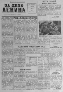 П р о л е т а р и и в с е х с т р а н , с о е д и н я й т е с ь ! З А Д Е Л О № 22 (2727) 4 а в г у с т а 1965 г. Ср е да Ц е н а 2 коп. О р г а н С е в е р н о г о р а й к о м а К П С С и р а й о н н о г о С о в е т а д е п у т а т о в т р у д я щ и х с я Н о в о с и б и р с к о й о б л а с т и Д л я х о з я й с т в н а ше г о р а й о н а в о з д е л ы в а н и е р ж и не я в л я е т с я но вым де лом. Хл е б о р о бы об этой к у л ь т у ре с д а в н и х пор г о в о р я т к а к о в ы с о к о у р о ж а й н о й и выг о дн ой . И это верно. Д а ж е в с а мые з а с у ш л и в ы е г о д ы р о ж ь д а ё т н е пл о х и е у р о ж а и . У б е д и т е л ь ным пр и м е р о м м о ж е т с л у ж и т ь ны н е шн и й год. Н е б л а г о п р и я т н ы е по г о дны е у с л о в и я п а г у б н о с к а з а л и с ь на росте и р а з в ит ии я р о в ы х к у л ь т у р , в то в р е м я , к а к с поле й , з а н я т ы х р о ж ь ю , пов семес тно с о б и р ают в ы сокий у р о ж а й . Это о б ъ я с н я е т с я н е ко т орыми б и о л о г и ч е с к и ми о с о б е н н о с т я м и р ж и . Ср е д и з е р н о в ы х к у л ь т у р р о ж ь с а м а я х о л о д о с т ой к а я . Она не п р е д ъ я в л я е т б о л ь ших т р е б о в а н ий к т епл у , пр о р а с т а е т при т ем п е р а т у ре, б л и з к о й к нулю. Р о ж ь не т р е б о в а т е л ь н а к почве, хо рошо и с п о л ь з у е т осенне- з им н и е ос адк и, л у чш е , чем я р о в ы е , пе р ен о си т в е с е ннюю з а с у х у . Обще и з ве с т е н и тот ф а к т , что она спос о бствуе т о ч ище н ию поле й от с о р н я к о в , я в л я е т с я х о рошим пр е дше с т в е нн ик о м д л я я р о в о й п ш е н и цы и д р у г и х к у л ь т у р . Х л е б о р о б а ми т а к ж е з а м е ч е н о , что р о ж ь в с е г д а д а ё т более в ы сокий у р о ж а й , ч е м пше н и ц а . Р а н н е е с о з р е в а н и е п о з в о л я е т н а ч и н а т ь у б о р к у её в пе рвой д е к а д е а в г у с т а , что н е м а л о в а ж н о в о р г а ни з а ц и о н н о - х о з яй с т в е нн ом о т н о ше ни и . Р о ж ь д а е т р а з р я д к у в р а б о т е и во в р е м я в е с е нн е г о сева. Н е с м о т р я на все эти ц е н н ы е особеннос ти , р о ж ь в пос ев ах т е к у щ е г о г о д а з а н и м а е т н е мн о г и м б о л е е д е с я т и проц ен т о в от п л о щ а д и з е р н о в ы х к у л ь т у р . А ведь н е д а л е к о то в р е м я , к о г д а ей у д е л я л о с ь б о л ьш е в н им а н и я , чем с е й час. П о с л е д с т в и я н е д о оц е н к и р ж и н ы н ч е и с п ы т ы в а ют м н о г и е х о з яй с т в а . Не о б х о димо и с п р а в и т ь э т у о ш и б ку. П р а в и л ь н о п о с т у п а ют р у к о в о д и т е л и к о л х о з о в « Н о в а я ж и з н ь » , « З а в е т ы И л ь и ч а » , им. М. Г о р ь к о г о и д р у г и х . Они в этом г о д у сме л о и д у т на у в е л и ч е ние по с ев о в р ж и . П р а в л е ние к о л х о з а « Н о в а я ж и з н ь » п л а н и р у е т в б л и ж а й ш и е 2 — 3 г о д а д о в е с т и ее по с е вы до 2 5 — 3 0 п роц е н т о в от п л о щ а д и з е р н о в ы х . Это з а с л у ж и в а е т в с е о б щ е г о о до б р е ни я . Чт о к а с а е т с я а г р о т е х н и ки в о з д е л ы в а н и я р ж и , то она н и ч е м не о т л и ч а е т с я Рожь—выгодная культура B E C T I I С П О Л Е Й П Е Р В Ы Е КВИТАНЦИИ М е х а н и з а т о р Ы и к о л х о з н и к и н а ш е й с е л Ь х о з а р - т е л и н а ч а л и м а с с о в у ю у б о р к у рЖи . К о м б а й н е р Ы В. Е. К о н д р а т е н к о , К. И. С а н д з ю к , К. С . У с о в Е. Е. В е д е р н и к о в , В. Ф . С е д н е в , М . Я. С л о б о д ч и - к о в и д р у г и е с п е р в Ы х д н е й ж а т в Ы в Ь т о л н я ю т и п е р е в ы п о л н я ю т с м е н н Ы е н о р м Ы . Н и ч е г о п л о х о г о н е с к а ж е ш Ь и о к а ч е с т в е их р а б о т Ы . П о с т у п а ю щ е е н а т о к а з е р н о с д а е м г о с у д а р с т в у . О т в е з т и п е р в у ю м а ш и н у н а х л е б о п р и е м н Ы й п у н к т в Ь т а л а ч е
