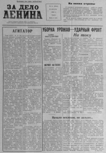ЗА ДЕЛО № 31 (2736) 25 а в г у с т а 1965 г. Ср е да Це н а 2 коп. Орг ан С е в е р н о г о райкома КПСС и р а й о н н о г о Сове т а д е п у т а т о в т р у д я щи х с я Н о в о с и б и р с к о й о блас ти Н а п о л я х с т р а н ы В ч е т в ё рт ой п я т и д н е в к е а в г у с т а х л е б а по с т р а н е скошены на п л оща д и 10,8 м и л л и о н а г е к т а ро в . В м а с совую ж а т в у в к люч и л и с ь в с я Сибирь , У р а л , Ц е л и н ный кр ай . С н а ч а л а у бо р к и з ерновые и зернобобовые скошены на 66 м и л л и о н а х 991 т ы с я ч е г е к т а р о в —55 процентов п л о ща д и пос ев а . На 57,5 ми л л и о н а г е к т а р а х у р о ж а й обмолочен. На 20 а в г у с т а озимые п о с е я н ы п о ч т и на 6 м и л л и онах г е кта ров . З я б ь в с п а х а н а на 13,8 ми л л и о н а г е к т ара х . А Г И Т А Т О Р Ч л е н КПСС В. И. Пет у х о в а з а в е д у е т с ел ь с к о й библиотекой в Ново-Тро- ицке. „ Хо з я й с т в о " у неё большое . Но это не меша е т ей добросове стно в ы п о л н я т ь и о б щ е с т в е н ную работу : В а л е н т и н а Ив ановна а г и т а т о р на жи в о т н о в о д ч е с к о й ферме . ГТЬжалуй, нет такого д н я , чтобы она не п р о в е л а бе с е д у с доя рками и п а с т у х а м и —то о р е ш е н и я х март овског о П л е н у м а Ц К КПСС, то о с о б ыт ия х в с т р а н е и з а ру б е жо м , то о д е л а х в колхоз е . З д е с ь она в ы п у с к а е т „боевые л и с т к и " , „колючки" , „ мо лн ии " , а и т о г и с о р е в н о в а ни я р е г у л я р н о з а н о с и т н а с т е нд „Кто с е г о д н я в п е р е д и ? " Всё это помогает ж и вотноводам н а хо д и т ь новые р е з е р в ы д л я п о в ы ш е н и я п р о д у к т и в н о с т и скота . И не с л у ч а й н о , что в к о л л е к т и в е в ы р о с л и т а кие ма с т е р а , к а к до я р к и А. Ф. Дордоно в а и Т. Д. К р у г л о в а , н а д о и вши е з а 7 м е с я ц е в более 15 ц е н тнеров молока на корову к а ж д а я . А ферма з а н я л а пе р в о е место по к о л х о з у . Умение дойти до к а ж дого чел о в е ка — основное в работе а г и т а т о р а комм у н и с т а Ва ле нт ины П е т у ховой. Среди ж и в о т н о в о дов есть ещё т акие , ко-: торые п о р т я т н а с т р о е н и е д р у г и м . Од н а жды п р о и з о ш л а н е п р и я т н а я с с о р а м е ж д у А. Ко ч е р е жк о и Н. Б у г л е е в о й . хАгитатор немедленно в м е ш а л а с ь . Поб е с е до в а л а . Не помог ло. Т о г д а она и д ё т в п а р т бюро, в п р а в л е н и е к о л х о за. Ин ци д ен т был у л а жен . Сейча с д о я р к и работают д р у ж н о , хорошо. А вот д р у г о й с л у ч а й . А. Ш т р а у б не об е с п е ч ил коров т ё п л о й водой. О его п р о с т у п к е п о я в и л а с ь „колючка" . Подо б н ы х фактов п о с л е э т о г о у ж е не на блюда л о с ь . В а л е н т и н а Ивано в н а с т а р а е т с я в н е д р я т ь п е р е довой опыт в п р о и з в о д ство. С этой це лью е щё в а п р е л е она о р г а н и з о в а л а ч и т а т е л ь с к у ю к о н ф е ренцию на т е м у — с е л ь с ки е р а ц и о н а л и з а т о р ы . П р и г л а с и л а т р а к т о ри с т о в , комбайнеров, мех а ни ка , б р и г а д и р а и д р у г и х к о л хоз ников . Все п о н я л и , что можно м е х а н и з и р о в а т ь с ки р д о в а ни е с ена . К а к это д е л а е т с я п р ак т и ч е с к и ? Д л я и з у ч е н и я р е ш и л и п о с л а т ь д в у х м е х а ни з а т о ров В. Ш т р а у б а и Г . К р у г л о в а —в К е ме р о в скую о б л а с т ь . В о з в р а т и в ш и с ь из командировки, они в з я л и с ь п е р е о б о р у д о в а т ь комбайн„С- 6“д л я подборки сена . Подб орщи к с д е л а л и у да чн о . Ново Т р о иц к а я б р и г а д а з а г о т о в и л а с ена 12100 центне ров. Из ни х почти п о л о ви н а подобрана своим подборщиком. Т а к а г и т а тор с у м е л а з аинт е рё с о в а т ь новинкой и до
