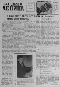П р о л е т а р и и в с е х с т р а н , с о е д и н я й т е с ь ! ЗА Д Е Л О ЛЕНИНА О р г а н С е в е р н о г о р а й к о м а К П С С и р а й о н н о г о С о в е т а д е п у т а т о в т р у д я щ и х с я Н о в о с и б и р с к о й о б л а с т и № 32 ( 2 7 3 7 ) 27 а в г у с т а 1905 г . П я т н и ц а Ц е п а 2 к о п . Н р а с н о д а р с н и й н р а й . У ч е н и ц ы К а н е в с к о й с р е д н е й ш к о л ы к о м с о м о л к и В а л е н т и н а З о - л о г и н а ( с п р а в а ) и Л ю д м и л а Ж а д ь к о в о т у ж е ч е т в ё р тый г о д в л е т н и е к а н и к у л ы р а б о т а ют в и з и р о в щ и ц а - ми на х л е б о п р и ё м но м п у н к т е . Ф о т о Е. Ш у л е - п о в а . Ф о т о х р о н и к а Т А С С В КОМПЛЕКСЕ ВЕСТИ ВСЕ ПОЛЕВЫЕ РАБОТЫ ! Уберемхлеба без потерь П р и з ы в м е х а н и з а т о р о в и к о л х о з н и к о в с е л ь х о з а р т е л и им. X X I I с ъ е з д а К П С С у б р а т ь у р о ж а й в с а м ы е с ж а т ы е с р о к и и б е з п о т е р ь н а ш ё л г о р я ч у ю п о д д е р ж к у в о в с е х х о з я й с т в а х р а й о н а . И х о т я п о г о д а н е б а л у е т х л е б о р о б о в —ч а с т о п е р е п а д а ю т д о ж д и —в с ё ш и р е р а з в ё р т ы в а е т с я у б о р к а з е р н о в ы х . К о л х о з ы „ В о с х о д 11, „ П а м я т ь Л е н и н а 14 и „ П у т ь к к о м м у н и з м у 4 с л е д о м з а к о с о в и ц е й р ж и н а ч а л и у б и р а т ь я р о в ы е к у л ь т у р ы . К о м б а й н ё р ы и з э т и х х о з я й с т в В. А ф а н а с ь е в , Г . Г о л у б е в , И. С мы к , А. С е м е н о в , Н. В а с и л ь е в и А. П е р ц е в и з к о л х о з а „ Н о в а я ж и з н ь 4 и м н о г и е д р у г и е о т в е ч а ю т н а п р и з ы в в ы с о к о й п р о и з в о д и т е л ь н о с т ь ю т р у д а . В ы с о к у ю в ы р а б о т к у о н и с о ч е т а ю т с о т л и ч н ы м к а ч е с т в о м р а б о т ы : не д о п у с к а ю т о г р е х о в , а к к у р а т н о о б к а ш и в а ю т п о л я , с т а р а ю т с я н е о с т а в и т ь н а к о р н ю н и о д н о г о к о л о с а . М е х а н и з а т о р ы п о н и м а ют , ч т о п р и н ы н е ш н и х у с л о в и я х н у ж н ы и с к л ю ч и т е л ь н а я б е р е ж л и в о с т ь , с о х р а н е н и е к а ж д о г о з е р н а . В е д ь п о т е р я н а г е к т а р е л и ш ь о д н о г о к и л о г р а м м а з е р н а п р и н е с ё т р а й о н у у р о н , и с ч и с л я ю щ и й с я с о т н я м и ц е н т н е р о в х л е б а . С э т и м н е л ь з я н е с ч и т а т ь с я . ; В о т п о ч е м у р у к о в о д и т е л и к о л х о з о в им. X X I I с ъ е з д а К П С С , „ З а в е т ы И л ь и ч а 44, „ П а м я т ь Л е н и н а 44, „ П у т ь к к о м м у н и з м у 4 и д р у г и х , с п е ц и а л и с т ы и м е х а н и з а т о р ы с с а м о г о н а ч а л а у б о р о ч н о й с т р а д ы п р е д п р и н и м а ю т в с е м е р ы д л я т о г о , ч т о б ы у б р а т ь х л е б а б е з п о т е р ь . К с о ж а л е н и ю , и м е ю т с я д о с а д н ы е у п у щ е н и я . Не у в и д и ш ь н и о д н о й м а ш и н ы н а о т в о з к е з е р н а от к о м б а й н о в и л и н а о т г р у з к е е г о г о с у д а р с т в у , ч т о б ы о н а б ы л а у к р ы т а б р е з е н т о м и л и м е ш к о в и н о й . Н а у х а б а х и к р у т ы х п о в о р о т а х и з к у з о в о в в ы с ы п а е т с я з е р н о , и н е к и л о г р а м м а м и — п у д а м и . Р у к о в о д и т е л и ж е к о л х о з о в у п о р н о с т а р а ю т с я н е з а м е ч а т ь э т о г о . А п о р а бы о б р а т и т ь н а т а к о й к а н а л п о т е р ь х л е б а с е р ь ё з н о е в н и м а н и е . П о с т у п а ю т с и г н а л ы о т о м , ч т о д о п у с к а ю т с я п о т е р и з е р н а н а ж а т в е в р е з у л ь т а т е п л о х о й р е г у л и р о в к и н е к о т о р ы х у з л о в к о м б а й н о в . Т а к , у к о м б а й н е р а и з к о л х о з а им. X X I I с ъ е з д а К П С С В. М а д ж а р о , п е р в ы й г о д р а б о т а ю щ е г о н а у б о р к е , п р о д о л ж и т е л ь но е в р е м я б а р а х л и л м о т о р м а ш и н ы . Ш н е к ' х е д е р а з а б и в а л с я х л е 