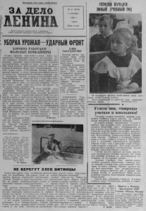 Люди мастерской В к о л х о з е « П а м я т ь Л е н и н а » е с т ь м е х а н и ч е с к а я м а с т е р с к а я . К а ж д о е у т р о с ю д а с п е ш и т В а с и л и й М и х а й л о в и ч К о р ч а г и н . С е й ч а с е м у 5 0 л е т , и з н и х о к о л о 13 он р а б о т а е т т о к а р е м п я т о г о р а з р я д а . Д а в н о п о л ю б и л он т о к а р н о е д е л о , • е щ е к о г д а у ч и л с я н а Д а л ь н е м В о с т о к е . Т а м ж е В а с и л и й М и х а й л о в и ч т р у д и л с я на з а в о д е . Н о е г о в с ё в р е м я т я н у л о в с е л о . И он п р и е х а л в В е р х - К р а с н о я р к у . О п ы т н ы й м е т а л л и с т п о л у ч и л т о к а р н ы й с т а н о к . И з а к и п е л а р а б о т а . Р у к и м а с т е р а с н и м а л и со с т а н к а р а з л и ч н ы е д е т а л и , б е з к о т о р ы х н е о б о й т и с ь к о м б а й н а м и т р а к т о р а м . И с т и н н а я л ю б о в ь к п р о ф е с с и и , п ы т л и в о с т ь п о з в о л я ю т т о к а р ю д е л а т ь л ю б ы е д е т а л и , в ы п о л н я т ь з а к а з ы и д л я д р у г и х к о л х о з о в и о р г а н и з а ци й . Д о д в у х н о р м в с м е н у — вот е г о п о к а з а т е л ь т р у д а . « Н е т т а к о й д е т а л и , к о т о р у ю бы не с у м е л в ы т о ч и т ь В а с и л и й М и х а й л о в и ч » , —г о в о р я т о н ё м т о в а р и щ и по р а б о т е . В ы с о к а я п р о и з в о д и т е л ь н о с т ь т р у д а и у с л е с а р я И в а н а П е т р о в и ч а Г а в р и л о в а . И з о б р е т а т е л ь ност ь , с м е к а л к а , с н о р о в к а , о п ы т — вот что о т л и ч а е т к о м м у н и с т а И . П. Г а в р и л о в а . Н е о д и н г о д он р е г у л и р у е т т о п л и в н ы е н а с о с ы , р е м о н т и р у е т э л е к т р о о б о р у д о в а н и е т р а к т о р ов и к омб а йн о в . " А е с л и п о н а д о б и т с я , он с т а н о в и т с я м е д н и к о м , к у н з е ц о м . П р и м е р у п е р е д о в ы х р а б о ч и х с л е д у ю т и д р у г и е м е х а н и з а т о р ы . О н и т о ж е в л ю б л е н ы в с в о и п р о ф е с с и и — это э л е к т р и к Н и к о л а й В а с и л ь е в и ч Б р и - д и г и н , к у з н е ц Н и к о л а й И в а н о в и ч С л о б о д ч и к о в . Д н ё м и ночью м о ж е т к о в а т ь он, е с л и э то не о б х о - > д и м о д л я у б о р к и у р о ж а я , д л я л ю д е й . А кто не з н а е т в к о л х о з е « П а м я т ь Л е н и н а » н о р м и р о в щ и ц у А н н у П а в л о в н у Д а н ч е н к о ? Б о л е е 2 0 л е т н а з а д о н а в п е р в ы е в с т а л а з а ш т у р в а л к о мб а й н а . Это б ы л о ' с у р о в о е в р е м я В е л и к о й О т е ч е с т в е н н о й в о йн ы . Р о д и н е н у ж е н б ы л х л е б , в с ё д л я ф р о н т а — и А н н а П а в л о в н а т р и г о д а р а б о т а л а на к о м б а й н е . А б ы л а е щ е д е в ч о н к о й . Х о р о ш о з н а я т е х н и к у , о н а н а в с ю ж и з н ь с в я з а л а с в ою с у д ь б у с м а с т е р с к о й , с м а ш и н а м и . М е х а н и з а т о р ы в е р х - к р а с н о я р с к о й м а с т е р с к о й т в ё р д о у с в о и л и т а к о е п р а в и л о : « В ы с о к о е к а ч е с т в о р е м о н т а — з а л о г у с п е ш н о г о п р о в е д е н и я с е л ь с к о х о з я й с т в е н н ы х р а б о т » . И в с е г д а т р у д я т с я по д т а к и м д е в и з о м . В. Щеголев. Н н ам в р а й о н прибыла для работы группа м о л о д ы х у ч и т елей , вы пус ннин ов В о ро н е ж с к о г о педагогичесногр учи лищ а . П о л у ч и в направления, м е т о д и ч е с н у ю л ит ерат уру и у ч е б н и к и , они р а зъ е ха л и с ь по с е л ам и д еревням. На н аш ем с ним ке вы ви дит е Николая Н о з и н ц е в а ( с л е в а ) , напра вл яю щ е го ся у ч и т е л ь ствовать в ш ко лу д. Томиловки , и Григория Нурнина, п о л у чившего н а з н ач ен ие в Ичи н сн ую н а ч а л ь н ую школу. П о з д р а в л я е м м о л о д ы х у ч и т е л е й с н ач ал ом уч еб но го года и ж е л а е м им у с п е х о в на их благородном п ед а г о