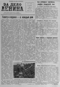 П р о л е т а р и и в с е х с т р а н , с о е д и н я й т е с ь ! З А Д Е Л О № 38 ( 2 7 4 3 ) 10 с е н т я б р я 1965 Г . П я т н и ц а Ц е н а 2 код . О р г а н С е в е р н о г о р а й к о м а К П С С и р а й о н н о г о С о в е т а д е п у т а т о в т р у д я щ и х с я Н о в о с и б и р с к о й о б л а с т и Газету ижурнал— в каждый дом П е р в о г о с е н т я б р я в н а ш е м р а й о н е , к а к и по в сей с т р а н е , н а ч а л а с ь п о д п и с к а н а ж у р н а л ы и г а з е т ы н а 1 9 6 6 г о д . Г а з е т ы и ж у р н а л ы в х о д я т в н а ш у ж и з н ь к а к н а д е ж н ы е д р у з ь я , м у д р ы е с о в е т ч и к и в т р у д е , у ч ё б е и б ы т у . В н ы н е ш н е м г о д у т р у д я щ и е с я н а ш е г о р а й о н а по п о д п и с к е п о л у ч а ю т о к о л о д е с я т и т ы с я ч э к з е м п л я р о в г а з е т и ж у р н а л о в . Д у х о в н ы е з а п р о с ы л ю д е й с т а н о в я т с я б о л е е ш и р о к и м и и р а з н о о б р а з н ы м и . Г а з е т ы и ж у р н а л ы о б о б щ а ю т о п ы т м и л л и о н о в и к а к б ы р а с к р ы в а ю т н а с т е ж ь т в о ё о к но в б о л ь ш о й м и р . Мы з н а е м т ы с я ч и п р и м е р о в , к о г д а г а з е т н а я з а м е т к а п о м о г л а н а й т и п о т е р я н н ы х в в о й н у д о р о г и х с е р д ц у л ю д е й , к о г д а р а с с к а з т р а к т о р и с т а п о м о г т ы с я ч а м м е х а н и з а т о р о в р е ш и т ь с л о ж н е й ш у ю п р о б л е м у . Д а м а л о л и п р и м е р о в п о м о щ и , х о з я й с т в е н н ы х с о в е т о в, с п е ц и а л ь н ы х р е к о м е н д а ц и й е ж е д н е в н о п у б л и к у е т с я в н а ш и х г а з е т а х и ж у р н а л а х . А в о п р о с ы в о с п и т а н и я д е т е й , с о в е т ы в р а ч а — в с ё э т о м ы ч е р п а е м и з п е р и о д и ч е с к о й п е ч а т и . * У н а с в р а й о н е б о л ь ш и н ст во ж и т е л е й — а к т и в н ы е п о д п и с ч и к и н а г а з е т ы и ж у р н а л ы . И с к а ж д ы м г о д о м в о з р а с т а е т с п р о с . Л ю д и и н т е р е с у ю т с я б у к в а л ь н о в с е м . Н а п р и м е р , п е д а г о г в ы п и с ы в а е т о б ы ч но не т о л ь к о с в ою « У ч и т е л ь с к у ю г а з е т у » . Он и н т е р е с у е т с я к о л х о з н ы м п р о и з в о д с т в о м , е м у б л и з к и к о м с о м о л ь с к и е и п и о н е р с к и е т е м ы . Г а з е т ы « С о в е т с к а я С и б и р ь » , « С е л ь с к а я ж и з н ь » , « И з в е с т и я » , « К о м с о м о л ь с к а я п р а в д а » , « П р а в д а » и д р у г и е , ж у р н а л ы — « К р е с т ь я н к а » , « Р а б о т н и ц а » , « О г о н ё к » , « К о м м у н и с т » , « К р о к о д и л » и м н о г и е д р у г и е - - п о л ь з у ю т с я у ч и т а т е л е й б о л ь ш и м а в т о р и т е т о м . Б о л ь ш а я ч а с т ь т р а к т о р и с т о в , к о м б а й н е р о в п о л у ч а е т ж у р н а л « С е л ь с к и й м е х а н и з а т о р » , м е д и ц и н с к и е р а б о т н и к и — « З д о р о в ь е » , в о д и т е л и а в т о м о б и л е й — « З а р у л ё м » . Б о л ь ш о й с п р о с у р о д и т е л е й н а ж у р н а л ы « С е м ь я и ш к о л а » , « Д о ш к о л ь н о е в о с п и т а н и е » . Н о в с е х и н т е р е с у ю т д е л а н а ш е г о р а й о н а . К а к и д ё т б о р ь б а з а б о л ь ш о е м о л о к о в к о л х о з а х , к т о в п е р е д и н а с е н о у б о р к е и х л е б о у б о р к е . А к т о у н а с с а м ы й ч у т к и й , в н и м а т е л ь н ы й д о к т о р , у м е л ы й м е х а н и з а т о р , о п ы т н ы й а г р о н о м , ж и в о т н о в о д и т. д . , чем ж и в ё т н а ш а к о м с о м о л и я и п и о н е р и я . Обо в с ё м э т ом м о ж н о у з н а т ь на с т р а н и ц а х р а й о н н о й г а з е т ы « З а д е л о Л е н и н а » . Г а з е т а с т а л а в ы х о д и т ь с о в с е м н е д а в но. Но с п р о с н а н е ё с к а ж д ы м д н ё м в о з р а с т а е т . Х о ч е т с я и м е т ь н е с к о л ь к о г а з е т и ж у р н а л о в . Но к а к и х в ы п и с а т ь с р а з у на ц е л ы й г о д ? В е д ь д л я э то г о п о т р е б 