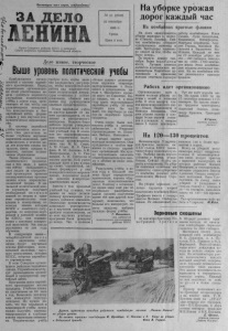 П р о л е т а р и и в с е х с т р а н , с о е д и н я й т е с ь ! З А Д Е Л О № 4 3 ( 2 7 4 8 ) 22 с е н т я б р я 1 9 6 5 Г . С р е д а Ц е н а 2 к о п . О р г а н С е в е р н о г о р а й к о м а К П С С и р а й о н н о г о С о в е т а д е п у т а т о в т р у д я щ и х с я Н о в о с и б и р с к о й о б л а с т и Д е л о ж и в о е , т в о р ч е с к о е Выше уроев нь политической учбеы П р и б л и ж а е т с я н а ч а л о з а н я т и й в- с и с т е м е п а р т и й - н о г о п р о с в е щ е н и я . П е р е д п е р в и ч н ы м и о р г а н и з а ц и я - д ~ м и с т о и т о т в е т с т в е н н а я з а - д а ч а — д о б и т ь с я к о р е н н о г о у л у ч ш е н и я п о л и т и ч е с к о й у ч ё б ы в н о в о м г о д у , о р г а - ^ н и з о в а т ь е ё т а к , ч т о б ы о н а * j у д о в л е т в о р я л а к о м м у н и с т о в , к о м с о м о л ь ц е в и б е с - п а р т и й н ы й а к т и в , ф о р м и - А р о в а л а у н и х н а у ч н о е к о м - о м у н и с т и ч е с к о е м и р о в о з з р е ние . В с и с т е м у п а р т и й н о й у ч ё б ы в н о с и т с я м н о г о но- в о г о . О н а р а с с ч и т а н а н а б о л е е г л у б о к о е и з у ч е н и е м а р к с и з м а - л е н и н и з м а , д а ё т в о з м о ж н о с т ь в т е ч е н и е р я д а л е т п о л у ч и т ь с п е р в а н а ч а л ь н о е , з а т е м с р е д н е е и, н а к о н е ц , в ы с ш е е п о л и т и ч е с к о е о б р а з о в а н и е . Т а к и м о б р а з о м , с и с т е м а п о л и т и ч е с к о г о п р о с в е щ е н и я в т о м в и д е , в к а к о м о н а с е й ч а с с к л а д ы в а е т с я , д а с т л ю д я м з а о п р е д е л ё н н ы й п р о м е ж у т о к в р е м е н и т р е б у е т т о г о , ч т о б ы з а н я т и я п р о в о д и л и с ь р е г у л я р но, ч т о б ы с а м о с т о я т е л ь н а я р а б о т а н а д п е р в о и с т о ч н и к а м и п о л и т и ч е с к о й л и т е р а т у р ы с о ч е т а л а с ь с с о б е с е д о в а н и я м и , о б м е н о м м н е н и я м и п о д р у к о в о д с т в о м о п ы т н ы х п р о п а г а н д и с т о в . У с п е х п а р т и й н о й у ч ё б ы во м н о г о м з а в и с и т от н а ш и х п р о п а г а н д и с т о в , о т и х з н а н и я и м е т о д и ч е с к о г о м а с т е р с т в а . Н е д а в н о б ю р о р а й к о м а п а р т и и у т в е р д и л о р у к о в о д и т е л е й ш к о л н а н о в ы й у ч е б н ы й г о д . В о с н о в н о м э т о к в а л и ф и ц и р о в а н н ы е , т е о р е т и ч е с к и п о д г о т о в л е н н ы е п р о п а г а н д и с т ы , т а к и е к а к М. М. С м ы к , А. М. Ю д и н , И . Я . Т и м о ф е е в , Н . М. А н о х и н а , А . Е . М и т р о ф а н о в а , А . П . Г л а - м а з д и н , А . Н. П е т у х о в а и м н о г и е д р у г и е . О н и у м е л о н а х о д я т п у т и к у м у и с е р д ц у с в о и х с л у ш а т е л е й , а к т и в н о ф о р м и р у ю т у н и х к о м м у н и с т и ч е с к о е м и р о в о з - На уборк е у р о ж а я д о р о г каждый час - Н а к о м б а й н а х к р а с н ы е ф л а ж к и п о с л е д о в а т е л ь н ы е п р о ч н ы е , 3Р е н и е > п о д н и м а ю т л ю д е й ^ ^ н а р е ш е н и е к о н к р е т н ы х з н а н и я о с н о в м а р к с и с т к о л е н и н с к о й т е о р и и . В н а ч а л ь н о й п о л и т и ч е с к о й ш к о л е с л у ш а т е л и п о л у ч а ю т н е о б х о д и м ы й м и н и м у м з н а н и й п о т е о р и и и п р а к т и к е с т р о и т е л ь с т в а с о ц и а л и з м а и к о м м у н и з м а , о с н о в н ы м э т а п а м и с т о р и и К П С С и с о в е т с к о г о г о с у д а р с т в а , по в о п р о с а м в н у т р е н н е й и в н е ш н е й п о л и т и к и К П С С , о н и п о з н а к о м я т с я с о с н о в а м и к о н к р е т н о й э к о н о м и к и . Э т а ш к о л а р а с с ч и т а н а н а д в а г о д а о б у ч е н и я . В с л е д у ю щ е м з в е н е — ч е т ы р ё х г о д и ч н о й ш к о л е о с н о в м а р к с и з м а - л е н и н и з м а —б у д у т и з у ч а т ь с я о с н о в ы ф и л о с о ф и и , п о л и т и ч е с к о й э к о н о м и и , • н а у ч н о г о к о м м у н и з м а , и с т о р и и К П С С ,