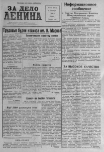 П р о л е т а р и и в с е х с т р а н , с о е д и н я й т е с ь ! З А Д Е Л О № 46 (2751) 29 сентября 1965 Г . Среда Цена 2 коп. Орган Северного райкома К П С С и районного Совета депутатов трудящихся Новосибирской области Трудовыебудни колхоза и .м К. Маркса Информационное сообщение После уборки хлебов основное внимание колхозников нашей артели обращено на очистку и засыпку семян. В зерносклад Бергуль- ской бригады поступило с двух токов 230 центнеров чистого сухого гороха. Здесь же засыпано 1000 центнеров пропущенной на «ОС-3» пшеницы сорта «диамант». 547 центнеров очищенной семенной пшеницы находится в складе посёлка Мало-Карагаевка. На обоих токах имеем 2000 центнеров овса «золотой дождь». Чистого будет не меньше 1500 центЗаканчиваем очистку семян У ЧАЩ И ЕС Я ПОМОГЛИ КОЛХО ЗУ Каж дый год учащиеся нашей школы помогают колхозу им. К . Маркса копать картофель. Не остались в стороне они и нынче. Старшеклассники вышли на поле вместе со своими классными руководителями Л. М. Носовой, В. П. Егоровым, М. С. Петровой, Т. П. Савастеевым, В. И. Махныткиной и Е . С. Бя- киной. Физический труд для них был делом привычным. Работа спорилась. За четыре дня учащиеся выкопали картофель на площади 5 гектаров. Л . Ю р е в и ч , директор Бергульской восьмилетней школы. неров. Этого количества семян хватит на всю планируемую площадь. Сейчас быстро идёт его очистка. Особенно хорошо эта работа организована в Бергульской бригаде. Прямо поточный метод. Ш о фёр П. И. Иванов от сушилки завозит зерно под навес. Группа женщин — Ф . Н. Шерстобитова, А.Г1. Кириллова, А. В. Якимова и Е . В. Смертева разгружают машину, а другая группа колхозниц засыпа ет овёс в ковш «ОС-3». X. С. Голубцова и В. А. Хохлова подают у ж е очи щенные семена на ленточный т р а н с п о р т ё р , который своей верхней частью заходит в проём окна. Считанные минуты, и очищенный овёс в складе. Засыпку семенного материала закончим к 1 октября. Д . Б е л о в , председатель. Работа спорится Продолжительное время бергульские механизаторы не могли по-настоящему развернуть вспашку зяби из-за того, что плохо убиралась с полей солома. Тогда на сволакивание её был послан с сенокоса трактор с навесной волокушей. Григорий Спиридонов за несколько дней подготовил для пахоты 500 гектаров. Чтобы солома не портилась от дождей, Пётр Е го ров на большей части этой площади подправил кучи стогометателем. Дело оставалось за п а х а р я м и . Трактористы установ и л и строгое правило: работать только в две смены, пахать обязательно с предплуж никами. Работа пошла быстрее. За короткий срок прирост составил 300 гектаров. Из плана 1000 бер- гульцы подняли свыше 600 гектаров. Лучших показателей добились на пахоте Иван Платов и Ермолай Аниб роев. К аж ды й из них вспахал по 170 гектаров зяби. 130 гектаров на счету Ивана Петрова. М. Г о л у б ц о в , агроном. ТЕХНИКУ— НА ЛИНЕЙКУ ГОТОВНОСТИ К а к и в прошлом году, мы решили хранить техниЕщё 1 5 0 0 ц е н т н е р о в с е н а Сентябрьское небо чисто заволакивается хмурыми, косматыми тучами. Нет- нет да зарядит дождь. А тут ещё болотистая, кочковатая местность. Это очень затрудняет косовицу трав и другие работы, связанные с заготовкой сена. Преодолевая трудности, 11 механизаторов колхоза ведут заготовку кормов на землях госфонда. Алексей Васильевич Павлов принимал участие в создании копнообразовате- ля, а теперь работает на нём вместе с трактористом Юрием Вас