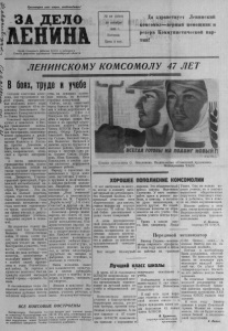 З А Д Е Л О ЛЕНИНА О р г а н С е в е р н о г о р а й к о м а К П С С и р а й о н н о г о С о в е т а д е п у т а т о в т р у д я щ и х с я Н о в о с и б и р с к о й о б л а с т и Да з д р а в с т в у е т Л е н и н с к и й к ом сом ол— в е р н ы й п о м о щ н и к и р е з е р в К о м м у н и с т и ч е с к о й п а р * т и и ! ЛЕНИНСКОМУ КОМСОМОЛУ 47 Л Е Т В бяо,х труде и учебе С ег одня с о в е т с к а я молод е ж ь , в с е т р у д я щ и е с я н а цией с т р а н ы , п р о г р е с с и в н а я мо ло д еж ь в с е г о мира отм еч ает сл а в н у ю 47-ю г о д о в щ и н у В с е сою зн о г о Л е нинского К омм у н и с т и ч е ск о го Союза Молодежи. К омсомол з а р о д и л с я , р о с , м у ж а л и з а к а л я л с я в б и т в а х г р а ж д а н с к о й войны. Д е с я т к и т ы с я ч к ом сом о л ь цев б е с с т р а ш н о , с а м о о т в е р женно с р а ж а л и с ь в р я д а х молодой К р а сн о й Армии п роти в Юденича и К о л ч а ка, п р о т и в Д еникина и В р а н г е л я , проти в а н г л и й с к и х , ам ери к ан ски х , я п о н с ких и прочих и н т е р в е н тов . А к о г д а з а к о н ч и л а с ь г р а ж д а н с к а я войн а, к омсомол, молодежь п о ш л а на с ам ы е т р у д н ы е у ч а с т к и с о ци ал и с ти ч е ск о г о с т р о и т е л ь с т в а . Д н еп р о г э с , С тали н г р а д с к и й т р а к т о р н ы й , Г о р ь ковский автомобильный з а воды , М а гн и тк а , К у з н е ц к - с тр ой , Т у р к с и б . . . Это д а леко не "полный перечен ь с тр оек , г д е гл а вн ой силой были комсомольцы . Г о д ы д овоенны х п я т и л е т о к — это г о ды п оистине г е р о и ч е с к о г о т р у д а молодёжи . В то ж е в р е м я юноши и д е в у ш ки н апр яж ё нн о у ч и л и с ь , о в л а д е в а я н ау кой и т е х н и кой. Но поднимал г о л о в у ф а ш и з м . 1941 го д . Н а ч а л а с ь В е л и к а я О т е ч е с т в е н н а я война. И с н о в а сотни т ы с я ч , миллионы юношей и д е в у ш е к у х о д я т на фронт. Б е с с т р а ш и е , м у ж е с т в о , с той к о с т ь , г о т о в н о с т ь о т д а т ь ж и з н ь во имя п о б е д ы —эти к а ч е с т в а , во с п и т а н ны е в м олодёжи в а ш е й п ар ти ей , с особой силой п р о я в и л и с ь в г о ды О т е ч е с т в е н ной войны . З а ге р ои зм и м у ж е с т в о комсомол был н а г р а ж д ё н в ы с ш е й н а г р а д о й нашей с т р а н ы —орденом Л е нина. В п о с л е в о ен н ы е г о ды Л е нинский комсомол с н о в а на п е р е д о вы х р у б е ж а х в о с с т а - | н и я м и , у ч и т е с ь р а б о т а т ь и новлени я н ародного х о з я й - | ж и т ь п о-ко мм у н и с т и ч е с к и 1 с т в а , н а освоении ц ел ин н ы х з е м е л ь , на в ел и ки х с т р о й к а х коммунизма. С е й ч а с , к о г д а сов етский н арод б о р е т с я з а п р е т в о р е ние в ж и з н ь .мартов ского и с е н т я б р ь с к о г о (19135 г . ) П ленумов ЦК КПСС , молод ё ж ь в п е р в ы х р я д а х . Это видно и н а примере комсом ольце в н а ш е г о района. Члены В Л К С М Иван Коче- р еж к о, Ф ё д о р Т рофимов , Анатолий В а с и л ь е в , В и к то р Седн е в , Е в г е н и й Ш е р у - ( ков, В а л е н т и н В а с и л ь е в и де сятки д р у г и х т р у д я т с я в к о л х о з а х район а , выполняя нормы в п о л т о р а —д в а р а з а . Дояр ки О л ь г а Шафи- ков а, Нина Б л и н о в а , Нина К о н о в а л о в а и многие д р у ги е я в л я ю т с я передовыми дояр кам и района . Н а р я д у с хорошими пок а з а т е л я м и в т р у д е молод е ж ь н аст о й ч и в о у ч и т с я — в к р у ж к а х и п о л и т ш к о л а х , в ш к о л а х р а б о ч ей м оло д е жи. Н апример , витинские комсомольцы у ч а т с я г к р у ж к е „ Н а ш ленинский к ом с ом о л " , а комсомольцы к о л х о зо в им. М. Г о р ь к о г о , „ Б о р ь б а з а м и р " , „7-й с ъ е з ^ С о в е т о в " и д р у г и х — в п о л и т ш к о л а х партийной с е ти . К о м с о м о л 