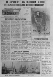 ДА ЗДРАВСТВУЕТ 48-я ГОДОВЩИНА ВЕЛИКОЙ ОКТЯБРЬСКОЙ СОЦИАЛИСТИЧЕСКОЙ РЕВОЛЮЦИИ! В о с к р е с е н ь е Це н а 2 коп. О р г а н С е в е р н о г о р а й к о м а К П С С и р а й о н н о г о С о в е т а д е п у т а т о в т р у д я щ и х с я Н о в о с и б и р с к о й о б л а с т и ПОБЕДОНОСНОДЕВИЖЕНИЕ ИСОТ РИ 2 6 о к т я б р я 1 9 1 7 г о д а В. И. Л е н и н п о з д р а в и л с в о и х б л и ж а й ш и х с о р а т н и к о в : — С п е р в ы м д н ё м с о ц и а л и с т и ч е с к о й р е в о л ю ц и и ! Д а . э т о бы л п е р в ы й д е н ь н о в о й э р ы ч е л о в е ч е с т в а , э п о х и к р у ш е н и я к а п и т а л и з м а и у т в е р ж д е н и я к о м м у н и з м а . В е л и к а я о ч и с т и т е л ь н а я г р о з а , н а ч а л о к о т о р о й б ы л о п о л о ж е н о з а л п о м „ А в р о р ы " , и п о н ы н е п р о д о л ж а е т ' б у ш е в а т ь н а д п л а н е т о й . И с т о р и я не з н а е т с о б ы т и я б о л е е з н а ч и т е л ь н о г о , ч ем п о б е д о н о с н ы й О к т я б р ь . Н е с л ы х а н н ы й р е в о л ю ц и о н н ы й п о д в и г н а р о д а , р у к о в о д и м о г о К о м м у н и с т и ч е с к о й п а р т и е й , в с к о л ы х н у л и в д о х н о в и л т р у д я щ и е с я м а с с ы в с е х с т р а н и к о н т и н е н т о в , п о т р я с и р а с к о л о л п р е ж д е е д и н ы й с о б с т в е н н и ч е с к и й м и р на д в а л а г е р я — к а п и т а л и с т и ч е с к и й и с о ц и а л и с т и ч е с к и й . В н а ш е в р е м я с о ц и а л и з м ст ал п р а к т и ч е с к и м д е л о м с о т е н м и л л и о н о в л ю д е й , з н а м е н е м р е в о л ю ц и о н н о г о д в и ж е н и я р а б о ч е г о к л а с с а в с е г о м и р а . В э т о м н е м е р к н у щ а я с и л а и д е й О к т я б ря , п р о д о л ж а ю щ и х с в о ё у в е р е н н о е и н е у д е р ж и м о е ш е с т в и е п о п л а н е т е . К а ж д а я О к т я б р ь с к а я г о д о в щ и н а— э т о как бы в е х а на г е р о и ч е с к о м и с л а в н о м п у т и , н о вая с т у п е н ь в б о р ь б е з а т о р ж е с т в о в е л и к о г о и б е с с м е р т н о г о д е л а О к т я б р я . О г л я д ы в а я с ь на п р о й д е н н ы й з а с о р о к в о с е м ь л е т п у т ь , с о в е т с к и й н а р о д и м е е т в с е о с н о в а н и я и с п ы т ы в а т ь ч у в с т в о г о р д о с т и о т т о г о , ч т о и м е н н о на е г о д о л ю выпала т р у д н а я , н о в м е с т е с т ем п о ч е т н а я и б л а г о р о д н а я в с е м и р н о - и с т о р и ч е с к а я р о л ь р а з в е д ч и ка и а в а н г а р д а в п р о к л а д ы в а нии н о в о г о п у т и р а з в и т и я о б щ е с т в а , н е и з в е д а н н о й д о р о г и в с в е т л о е б у д у щ е е . О н , с о в е т с к и й н а р о д , в о п л о т и л в ж и в о й д е й с т в и т е л ь н о с т и с а м ы е с м е л ы е м еч ты п е р е д о в о г о ч е л о в е ч е с т в а . О т к у в а л д ы , п р я х и и с о х и д о с о з д а н и я п е р в о к л а с с н ы х , с о в е р ш е н н ы х м аш и н , с в е р х м о щ н ы х с т а н к о в и с в е р х т о ч н ы х п р и б о р о в , д о с а м о г о м о щ н о г о в м и р е а т о м н о г о л е д о к о л а „Л е н и н " , д о к о с м и ч е с к и х к о р а б л е й . О т у ж а с а ю щ е й б е с п р о с в е т н о й б е д н о с т и и н у ж д ы к в е л и ч а й ш е м у п р о г р е с с у в о в с е х о б л а с т я х ж и з н и —т а к овы в е х и н о в о й и с т о р и и ^ н а ш е й Р о д и н ы . . . . . Н а ш п у т ь не был л ё г к и м . С о в е т с к о м у н а р о д у п р и ш л о с ь и с п ы т а т ь на с е б е в с е ф о р м ы п р о т и в о д е й с т в и я с т а р о г о м и р а , п е р е ж и т ь три в ой ны , н а в я з а н н ы е и м п е р и а л и с т а м и , в т о м ч и с л е т я ж е л е й ш у ю и к р о в о п р о л и т н у ю в о й н у с н е м е ц к о - ф а ш и с т с к и м и з а х в а т ч и к а м и . О т м е ч а я о ч е р е д н у ю О к т я б р ь с к у ю г о д о в щ и н у , мы с н о в а и с н о в а с ч у в с т в о м и с к р е н н е г о п о ч и т а н и я и б л а г о г о в е н и я в с п о м и