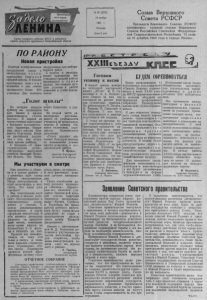 О р г а н С е в е р н о г о р а й к о м а К П С С и р а й о н н о г о С о в е т а д е п у т а т о в т р у д я щ и х с я Н о в о с и б и р с к о й о б л а с т и № 6 7 ( 2 7 7 2 ) 19 н о я б р я 1 9 6 5 г. П я т н и ц а Ц е н а 2 к оп . Созыв Верховного Совета Р С Ф С Р П р е з и д и у м В е р х о в н о г о С о в е т а Р С Ф С Р п о с т а н о в и л : с о з в а т ь с е с с и ю В е р х о в н о г о С о в е т а Р о с с и й с к о й С о в е т с к о й Ф е д е р а т и в н о й С о ц и а л и с т и ч е с к о й Р е с п у б л и к и VI с о з Ы - в а 16 д е к а б р я 1 9 6 5 г о д а в г о р о д е М о с к в е . ► ► ПО Р А Й О Н У Новая п р и с тр о й к а К о н т о р а к о м м у н а л ь н ы х п р е д п р и я т и й с д а л а в э к с п л у а т а ц и ю н о в у ю п р и с т р о й к у С е в е р н о й с р е д н е й ш к о л ы . В в о с ь м и п р о с т о р н ы х к л а с с н ы х к о м н а т а х в д в е с м е н ы з а н и м а ю т с я б о л е е 4 0 0 у ч е н и к о в . Д в е к о м н а т ы о б о р у д о в а н ы д л я л а б о р а т о р н ы х р а б о т . С п у с к о м в э к с п л у а т а ц и ю п р и с т р о й к и в се у ч а щ и е с я с р е д н е й ш к о л ы з а н и м а ю т с я в о д н о м з д а н и и . Это с о з д а л о л у ч ш и е у с л о в и я в р а б о т е у ч и т е л е й и у ч ё б е ш к о л ь ни к о в . Голос школы“ П о в е ч е р а м к а ж д у ю с у б б о т у м ы о р г а н и з у е м д л я п а п а ш и м а м а ш р а д и о п е р е д а ч у « Г о л о с ш к о л ы » . В п е р в о й е ё ч а с т и у ч и т е л я в ы с т у п а ю т с б е с е д а м и в о с п и т а т е л ь н о г о х а р а к т е р а . Н а п р и м е р , з а в у ч ш к о л ы Е л и з а в е т а С е р г е е в н а Б я к и - н а р а с с к а з а л а р о д и т е л я м о т ом , к а к с о х р а н и т ь з р е н и е р е б ё н к у . ’ С б е с е д а м и « О с а м о с т о я т е л ь н о с т и д е т е й » , « И г р у ш к и » в ы с т у п и л и у ч и т е л я В а с и л и й П е т р о в и ч Е г о р о в , Т и т П и м а - н о в и ч С а в а с т е е в и д р у г и е . Во в т о р о й ч а с т и р а д и о п е р е д а ч р а с с к а з ы в а е т с я об у с п е в а е м о с т и у ч а щ и х с я з а п р о ш е д ш у ю н е д е л ю . В п р и м е р с т а в я т с я о т л и ч н и к и , х о р о ш и с т ы . К р и т и к у ю т с я д в о е ч н и к и . « Г о л о с ш к о л ы » о к а з ы в а е т б о л ь ш у ю п о м о щ ь по п о в ы ш е н и ю у с п е в а е м о с т и у ч е н и к о в , в в о с п и т а т е л ь н о й р а б о т е . Л . Ю р евич , д и р е к т о р Бергу.>у>ской в о с ь м и л е т н е й ш колы . Мы у ч а с тв у е м в смотре К а к и з в е с т н о , в о б л а с т и и в н а ш е м р а й о н е с 1 с е н т я б р я и д ё т с м о т р р а б о т ы к и н о у с т а н о в о к . Н а ш а к и н о у с т а н о в к а и к л у б в к л ю ч и л и с ь в э т о т с м о т р . Ч т о н а м и у ж е с д е л а н о ? М ы п о д г о т о в и л и к л у б к р а б о т е в з и м н и х у с л о в и я х . К и н о а п п а р а т н ы е и к и н о п р о е к т о р ы с о д е р ж а т с я в ч и с т о т е . С ц е л ь ю р е к л а м и р о в а н и я к и н о ф и л ь м о в в к л у б е о ф о р м л е н к и н о у г о л о к . В н ё м и м е е т с я р е п е р т у а р ф и л ь м о в н а п р е д с т о я щ и й м е с я ц , в ы в е ш и в а ю т с я я р к и е а ф и ш и н а б л и ж а й ш и е 2 —3 ф и л ь м а и л и б р е т т о н а н и х . П р о в е л и м ы к и н о ф е с т и в а л ь н а т е м у « О т т ь м ы к с в е т у » и п о к а з а л и ф и л ь м ы « А р м а г е д д о н » , « Г р е ш н и ц а » , « К о н е ц с в е т а » . П л а н и р у е м п р о в е с т и в т о р о й к и н о ф е с т и в а л ь н а т е м у « С м е я т ь с я , п р а в о , не г р е ш н о » . В э т о т ф е с т и в а л ь п о к а ж е м л у ч ш и е к и н о к о м е д и и . С к о р о в о з о б н о в и м р а б о т у д е т с к о г о к и н о т е а т р а « П и о н е р » . Д и р е к т о р о м е г о н а з н а ч е н у ч а щ и й с я Б и а з и н с к о й с р е д н е й ш к о л ы А н а т о л и й К и р и л л о в , к и н о м е х а н и к а м и — Б у г а ё в , С е м ё н о в и Т е р е н т ь е в . Во в р е 