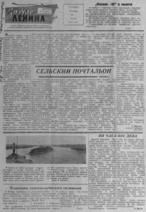 № 7 0 ( 2 7 7 5 ) 2 6 н о я б р я 196. 5 г . П я т н и ц а Ц е н а 2 к о п . О р г а н С е в е р н о г о р а й к о м а К П С С н р а й о н н о г о С о в е т а д е п у т а т о в т р у д я щ и х с я Н о в о с и б и р с к о й о б л а с т и „Ко смо с— 96“ в полете 23 н о я б р я в С о в е т с к о м Союз е п р о и з в е д е н о ч е р е д н о й з а п у с к и с к у с с т в е н н о г о с п у т н и к а З е м л и „ К о с м о с - 9 6 “ . Н а б о р т у с п у т н и к а у с т а н о в л е н а н а у ч н а я а п п а р а т у р а , п р е д н а з н а ч е н н а я д л я п р о д о л ж е н и я и с с л е д о в а н и й к о с м и ч е с к о г о п р о с т р а н с т в а . Н а ч а л ь н ы й п е р и о д о б р а щ е н и я с п у т н и к а —89, 6 м и н у т ы , м а к с и м а л ь н о е р а с с т о я н и е от п о в е р х н о с т и З е м л и (в а п о г е е ) 310 км, м и н и м а л ь н о е (в п е р и г е е ) —227 км. У с т а н о в л е н н а я н а с п у т н и к е а п п а р а т у р а р а б о т а е т н о р м а л ь н о . ТА СС I Iо че тна, с л о ж н а и р а з - ■ч ^ ио с т о р о н н я р а б о т а п о ч - Г р т а л ь о н а . Он а не о г р а н и ч и - ^ ч а е т с я т о л ь к о д о с т а в к о й г а з е т и ж у р н а л о в , п и с е м , д е н е ж н ы х п е р е в о д о в и т е л е г р а м м . П о ч т а л ь о н д о с т а в ля е т ' и п р и н и м а е т з а к а з н ы е п и с ь м а , б а н д е р о л и и т е л е г р а м м ы . Ои я в л я е т с я а к т и в н ы м р а с п р о с т р а н и т е л е м г а з е т и ж у р н а л о в п у т е м п р и е м а п о д п и с к и и л и п р о д а ж и . В р е з у л ь т а т е у п о р н о г о т р у д а в с е г о к о л л е к т и в а , в т ом ч и с л е и п о ч т а л ь о н о в , р а й о н н ы й у з е л с в я з и з а 10 м е с я ц е в э т о г о г о д а п е р е в ы п о л н и л в с е п л а н о в ы е п о к а з а т е л и и п о л у ч и л п р а в о н а н а ч и с л е н и е ф о и д а п р е д п р и я т и я . У л у ч ш е н и е р а б о т ы п о ч т о в о й с в я з и во мног ом з а в и с и т от х о р о ш о р а б о т а ю щ е й д о с т а в о ч н о й с л у ж б ы , от п о ч т а л ь о н о в . С е л ь с к и е п о ч т а л ь о н ы р а й о н а е ж е д н е в н о д о с т а в л я ю т н а с е л е нию, к о л х о з а м и о р г а н и з а ц и я м т ы с я ч и п о ч т о в ы х о т п р а в л е н и й . Из г о д а в г о д п о в ы ш а ю т с я к у л ь т у р н ы е з а п р о с ы н а с е л е н и я , они с т а н о в я т с я в с ё б о л е е ш и р о к и м и и р а з н о о б р а з н ы м и . К а к н а д е ж н ы е д р у з ь я в х о д я т в н а ш у ж и з н ь м у д р ы е с о в е т ч и к и —г а з е т а и ж у р н а л . Г а з е т ы и ж у р н а л ы в ы п и с ы в а е т к а ж д а я с е м ь я , н а с ы щ е н н о с т ь п е ч а т ь ю р а с т е т . Н а 1966 г о д п е р и о д и ч е с к о й п е ч а т и у ж е в ы п и с а н о н а о д н у ч е т в е р т ь б о л ь ш е , ч е м в 1965 г о д у . Б о л ь ш у ю по м ощь в п о д п и с к е нам о к а з а л и п а р т и й н ы е и к о м с о м о л ь с к и е о р г а н и з а ц и и , общ е с т в е н н ы е р а с п р о с т р а н и т е л и . Б о л ь ш о й т р у д в э то в а ж н о е д е л о в л о ж и л и и п о ч т а л ь о н ы . З а д а ч а п о ч т а л ь о н а т е п е р ь с о с т о и т в т ом , чтобы с в о е в р е м е н н о д о с т а в и т ь к а ж д о м у п о д п и с ч и к у г а з е т у и ж у р н а л , д р у г у ю к о р р е с п о н д е н ц и ю . д о н . Он а з а с л у ж и л а б о л ь ш о е у в а ж е н и е и д о в е р и е т р у д я щ и х с я . П о ч т у п р и в е з л и в о т д е л е н и е с в я з и . А л е к с а н д р а Ми х а й л о в н а , ч т о бы и з б е ж а т ь о ш и б о к , т щ а т е л ь н о с о р т и р у е т е е по н а с е л е н н ы м п у н к т а м . По т ом п о д б и р а е т и ' у к л а д ы в а е т в с у м к у п и с ь м а , г а з е т ы и ж у р н а л ы . С п е р в ы х ж е д н е й с в о е й р а б о т ы А л е к с а н д р а М и х а й л о в н а н а ч а л а и з у ч а т ь с в о й п о с т а в о ч н ы й у ч а с т о к , о т а - — А мне н у ж н о д в е м а р к и , — п р о с и т д е в о ч к а . — Х о ч у н а п и с а т ь баб у т п 