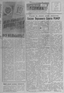 № 80 (27 8 5 ) 19 д е к а б р я 1965 г . В о с к р е с е н ь е Ц е н а 2 коп. О рган С е в е р н о г о ра йкома КПСС и р а й о н н о г о Со в ет а д е п у т а т о в тр удящ и хся Н о в о с и б и р с к о й обл асти Р о с с и я на п о р о г е новой п я т и л е тки Сесия Верховного Совета РСФСР М о с к в а , 16 д е к а б р я ТАСС) . С е г о д н я в Б о л ь шом К р е м л ё в с к о м Д в о р ц е ' о т к р ы л а с ь Y I - я с е с с и я В е р ховног о С о в е т а Р С Ф С Р ш е с т о г о с о з ы в а . 10 ч а с о в у т р а . Д е п у т а т ы и г о с т и т е п л о п р и в е т с т в у ют п о я в л е н и е в л о ж а х п р е з и д и у м а т о в а р и щ е й J I . И. р а с л я х н а р о д н о г о х о з я й с т в а Р С Ф С Р п р о в о д и л и с ь з н а ч и т е л ь н ы е к а п и т а л ь н ы е р а б о т ы . Вс е г о , по п р е д в а р и т е л ь н ы м д а н н ы м , б у д е т с д а н о в э к с п л у а т а ц и ю о с н о в н ы х г о с у д а р с т в е н н ы х в о б ъ ё м е 13,8 мЛрд. Д е н ь 1 9 ] д е к а б р я т р у д я щ и е с я Р о с с и й с к о и Ф е д е р а ц и и в с т р е ч а ю т , к а к н а р о д н ы й п р а з д н и к . В э т о т д е н ь с о с т о я т с я в ыб о р ы н а р о д н ы х с у д е й . Н а о с н о в а н и и К о н с т и т у ц и и СССР и Н о л о ж е - В с е м и э тими к а ч е с т в а ми о б л а д а е т н а ш к а н д и д а т в н а р о д н ы е с у д ь и Н а т а л ь я П е т р о в н а Х а р у - з и н а , к а н д и д а т у р ; к о т о рой. в ы д в и н у т а н т э т от в ы с о к и й п о с т к о л х о з н и к а ми с е л ь х о з а р т е л и им. н и я н а р о д н ы е с у д ь и и з - М. Г о р ь к о г о . Н а т а л ь я Пе т р я в л я е т с я ч л е н о м К о м м у н и с т и ч е с к о й п а р т и и , имеет с р е д н е е юр и д и ч е с к о е о б р а з о в а н и е . Она б о л е е 20 л е т р а б о т а е т н а р о д н ым с у д ь ё й н а ш е г о “р а й она. З а э т о в р е м я р а з б и р а л а с ь в т ы с я ч а х ж а л о б т р у д я щ и х с я , в м е с т е с н а р о д н ы м и з а с е д а т е л я м и р а с е м а т р и в а л а р а з л ич- и ы е д е л а о н а р у ш е н и я х З а к о н а . И в с е г д а н а х о д и л а п р а в и л ь н ы е р е ш е н и я . И не т с о м н е н и я , что и з б и р а т е л и р а йо н а с е г о д н я в с е , к а к один , п р и д у т н а и з б и р а т е л ь н ы е у ч а с т к и и о т д а д у т с в ои г о л о с а з а Н а т а л ь ю П е т р о в н у Х а р у з и н у , е д и н о г л а с н о и з б е р у т её с в о и м с у д ь ё й . Т о в а р и щ и и з б и р а т е л и ! Г о л о с о в а н и е н а ч а л о с ь в ш е с т ь ч а с о в у т р а . Д р у ж но и о р г а н и з о в а н н о п р и х о д и т е н а и з б и р а т е л ь - б ы т ь ч е л о в е к б е з у к о р и з - н ы е у ч а с т к и и г о л о с у й т е ц е н н о й ч е с т н о с т и , ч у т - з а Н а т а л ь ю П е т р о в н у к и й и в н и м а т е л ь н ы й , Х а р у з и н у — л у ч ш е г о х о р о ш о з н а ю щ и й ж и з н ь , п р е д с т а в и т е л я н а ш е й ц а р - п о н и м а ю щ и й н у ж д ы т р у - т и п , н а ш е г о н а р о д а , д я щ и х с я . * В с е н а выборы! сю/'^эЛеаЛе&ЛеАаАвЛаеАзеАеаЛеяАеаЛвАавЛавЛеАч Первойрусской революции посвящается В и н с т и т у т е м а р к с и з м а - л е н и н и з м а п р и Ц К К П С С 1 4 д е к а б р я о т к р ы л а с ь н а у ч н а я с е с с и я , п о с в я щ е н н а я 6 0 - л е т и р э р е в о л ю ц и и 1 9 0 5 — 1 9 0 7 г г . в Р о с с и и . С д о к л а д о м об и с т о р и ч е с к о м з н а ч е н и и п е р в о й р у с с к о й р е в о л ю ц и и в ы с т у п и л а к а д е м и к П . Н. П о с п е л о в . о н р а ю т с я г р а ж д а н а м и н а о с н о в е в с е о б щ е г о , р а в ного и п р я м о г о и з б и р а т е л ь н о г о п р а в а п р и т а й ном г о л о с о в а н и и . А это з н а ч и т , ч т о в с е г р а ж д а н е , д о с т и г ш и е 1 8 - л е т н е г о в о з р а с т а , н е з а в и с и м о от н а ц и о н а л ь н о с т и , о б р а з о в а н и я , т р у д о в о й д е я т е л ь н о с т и , в е р о и с п о в е д а н и я , имеют пр а в о у ч а с 