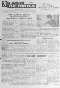 П р о л е т а р и и в с е х с т р а н , со е д и н я й т е с ь ! О р г а н С е в е р н о г о р а й к о м а К П С С и р а й о н н о г о С о в е т а д е п у т а т о в т р у д я щ и х с я Н о в о с и б и р с к о й о б л а с т и 1 2марта — д е н ь в ы б о р о в в В е р х о в н ы й Сове т Р С Ф С Р и местные Сов е ты № 27 (2974) Год издания 32-й 2 марта 1967 г. Четверг Цена 2 коп. НАШИ КАНДИДАТЫ В ДЕПУТАТЫ Н о в о с и б и р с к о г о о б л а с т н о г о С о в е т а Иван П е т р о в и ч К О Н С Т А Н Т И Н О В Кандидат в депутаты Новосибирского областного Совета депутатов трудящихся Иван Петрович Константинов родился в 1925 году, в деревне Щ е т к а Калининской области, в семье крестьянина. Образование имеет высшее, член КПСС с 1946 года. Трудовую деятельность начал в 1942 году рядовым колхозником в своей деревне. В 1943 году был призван в ряды Советской Армии, где с л уж ил до 1951 года. Командиром отделения участвовал в боях на фронт а х 'В е л и к о й Отечественной войны. После демобилизации из Армии в 1951-53 годах т. Константинов работал инструктором Мошковского райкома партии, затем первым секретарем Мошковского райкома комсомола, а в 1955 г. был избран секретарем Машков-- ского районного комитета КПСС, где работал до а в г у с т а 1957 года. В 1957-60 годах т. Константинов у ч и л с я в Новосибирской высшей партийной школе, после окончания которой в 1960 году был избран вторым, в 1962>году— первым секретарем Северного райкома партии. После лик видации Северного района в 1963 году Иван Петрович был избран председателем исполкома Куйбышевского районного Совета депутатов трудящихся. В январе 1965 года Северный район был восстановлен, и т. Константинов вновь избирается первым секретарем районного комитета КПСС, где работает и в настоящее время. Тов. Константинов я в л я е т с я кандидатом в члены Новосибирского обкома партии. За за сл у ги перед государством Иван Петрович награжден пятью медалями и орденом «Зна к Почёта». Рабочие и сл уж ащ ие объединения «Сельхозтехники» и головного маслозавода выдвинули тов. Константинова кандидатом в депутаты Новосибирского областного Совета по Северному избирательному округу Лт> 287. Товарищи избиратели! В день выборов — 12 марта— голосуйте за Ивана Петровича Константинова— достойного кандидата блока коммунистов и беспартийных! Р а й о н н о г о С о в е т а А н н а К л и м е н т ь е в н а Л А П Е Н К О А н н а К ли м е н т ь е в н а Л а п е н к о родилась в 1932 году в д ер евне- К у к у ш к и И с е т с к о г о района Т ю м е н с к о й области в семье ра бо че го . В 1947' году, после о к о н ч а ния семилетней ш к о л ы п о с т у пила на у ч ё б у в Т ю м ен с к и й к о о п е р а т и в н ы й т е х н и к у м . П о л у ч и в сп ец иа ль но с ть п л а н о в и ка, в 1952 г. А н н а К л и м е н т ! . - , евна приехала в С е в е р н ы й р а йп о тр еб сою з , где т р уд и т с я и в н асто ящее время. П о л ь з у е т с я ав тор и те том среди своих т о в а р ищ е й по работе, к а к х о р о ш и й специали ст , д у ш ев ны й ч е л о в е к . К а к акти вн ая о бщ е с т ве нни- ца и добр о со в ес тн ы й р а б о тни к т . Л а п е н к о н еоднократно и зб ир ал ась народным за седателем районного народного суда. Н а предвыборном собрании к о л л е к т и в ра йп о тр еб сою за в ы двинул А н н у К л и м е н т ь е в н у Л а п е н к о кандидатом в д е п у - 1 т а т ы районного С о в е т а д е п у т а т о в тр у д я щ и х с я по Л е н и н с к о м у и зб ир ател ьном у o K p y i y № 4. Т о в а р ищ и избиратели ! Г о л о с у й т е за т. Л а п е н к о — ч е с т н у ю т р у ж е н и ц у , дос