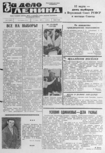 П р о л е т а ри и в с е х ст ра н , с о е д и н я й т е сь ! Орган С е в ер н о г о ра й к ом а КПСС и рай о н н о го С о в ета д е п у т а т о в т р у д я щ и х с я Н о в о с и б и р с к о й о б л а с т и 12 марта — д е н ь в ы б о р о в в В е р х о в н ы й Совет Р С Ф С Р и местные Советы № 31 ( 2 9 7 8 ) Год издания 32-й 11 марта 1967 г. Суббота Цена 2 коп. ВСЕ НА ВЫБОРЫ! ПО Р О Д Н О Й С Т Р А Н Е З а в т р а в 6 у т р а гостеприимно ра сп ахн у т свои двери все 28 и з б ир а т е л ьн ы х у ч а с т к о в и н ачнётся подача го ло со в за кандидатов в деп у т аты В е р ховного и местных С о в е т о в Р С Ф С Р . Э т о т день — день в ы б о р о в — рабочие, к о л хо зни к и , с л у ж а щ и е района, вместе со всеми трудящимис я Р о с с и й ской Федерации, в с тр е ч аю т к а к б о л ьш о й и радостный праздник. Д а э т о и понятно: в в о с к ресенье 12 марта трудящиеся и зб ер у т в С о в е т ы тех , кому они до вер яю т п редставл ять их в органах государственной власти. К т о наши кандидаты в деп у т а т ы ? В В е р х о в н ы й С о в е т Р е с п уб ли ки б а л л о т ир уе т с я Г е о р гий Фёд о р о в и ч Ч у п и н . Он — выходец из к р е с т ь я н с к о Ц семьи и р а б о т а е т в с ел ьс ком хозяйстве — предсе д^а т е л е м ^ ! » * Ф у п н о г о к о л х о з а ,;3аря комм уни зм а" К у й б ы ш е в с к о г о района. П о вы борам в о б л а с т ной С о в е т в б ю л л е т е н ях имена И в а н а П е т р о в и ч а К о н с т а н тинова — первого секре таря районного комитета партии и доярки к о л х о з а „ П а м я т ь Л е нина" В а р в а р ы Е г о р о в н ы К ы ш т ы м о в о й . В районный С о в е т б а л л о т и р у е т с я 50 кандидатов . Среди них пло тни к м еж к о л х о з с тр о я М . П . О си п о в , швея бытком- бината I I . К . Б у т р и м о в а , г л а в ный инженер с ел ьх оз упр авл е- ния А . П . Б а л а ш о в , врач В . М . Г р и д ин , доярка колхо за „ Б о р ь ба за м ир “ А . Е . П а н с к о в а , у чи тел ьниц а М . Н . П е т р о в а и р а бо чи х , к о л х о зн и к о в , ин тел лигенции, люди т р у д а , об-! ще стве нн и к и . Сил а С о в е т о в ) именно в том и со с т ои т , ч т о ) народ, тр у д ящ и е с я сами и зби-j р а ю т депутатами ’своих л у ч ших представителей. Ра д о с т н ы й праздник — д е н ь ' в ы б о р о в— т р у ж е н и к и района) в с т р е ч аю т новыми успехами в| производственной [деятельно-1 сти. Р а з в е р н у в соревнование! в ч е с т ь 50-летия С о в е т с к о й ! вл а сти , к о л х о зы до сро чно , ! раньше на 20 дней, в ы полнили к в а р т а л ь н ы е планы) продажи г о с у д а р с т в у м оло ка ! и мяса; на 1 марта по с р а в -i нению с этим ж е периодом! 1966 года значи тельно увели-) чили пого ловье к р у п н о г о ро-| гатого с к о т а , поголовье к о ров и свиней, а валовое про-1 Ш » отомки тех, кому керосиновая лампа казалась чудом, создали за годы Советской власти индустрию республики. На снимке: на Бакинском радиозаводе. Настройщик телевизоров 3. По инициативе гражданцевских колхозников В о всех населённых п ун к т ах Ч у в а ш и н с к о г о с ел ь с о в ет а к о л хо зн и к и , рабо чи е и с л у ж а щ и е обсудили обращение т р у ж е н и ков сел ьх оз артели им. X X I I съезда К П С С , в к отором они обязались досрочно р а с с ч и т а т ь ся с государством по всем ви дам денежных платежей. Э т о доброе начинание поддержано. А к т и в н о приступили к р а с ч ё т у жители Пр иб елин к и . Они все упл атили с ел ьх о з н ал о г , а с т р а х о вы х платежей и с ам о обложения внесли 80 процен тов о т суммы , исчисленной на год. П е р вы м и рас с чи та ли с ь Т . И . А л е к с а н д р о в , Е . И . Дре бенцо в . Н а 90 процентов по с е л ь хо зн а ло гу и на 80 по с т р а 